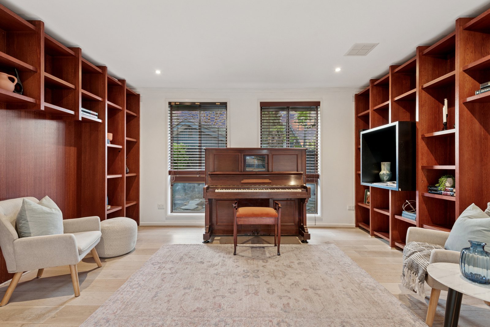 Featuring warm wideboard Oak floors and a freshly upgraded main bathroom (with a big deep bath and separate shower), this climate-controlled home features generous storage including built-in and walk-in robes, and bespoke cabinetry including the spectacular library and media fit-out. Wrapped by curvaceous entertainer’s decking and random stone-paving, there’s an established landscape to indulge a green thumb, and generous gated parking including a carport. Also just installed a Daikin new dual-mode central air conditioning system for your comfort.