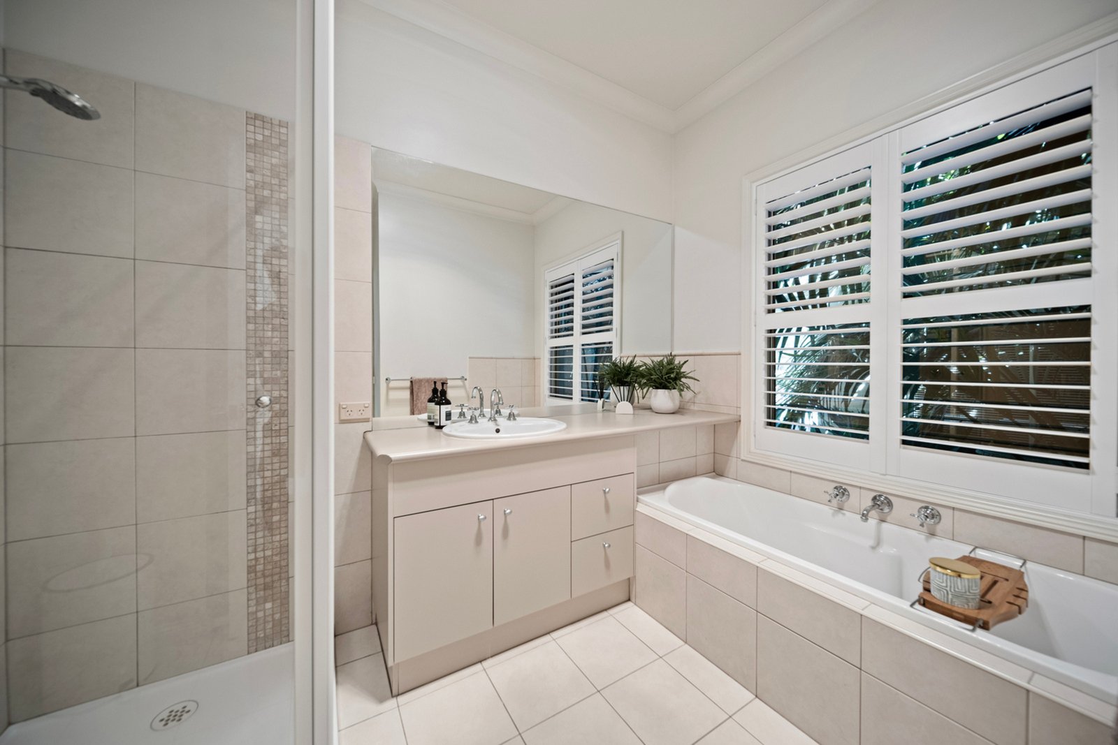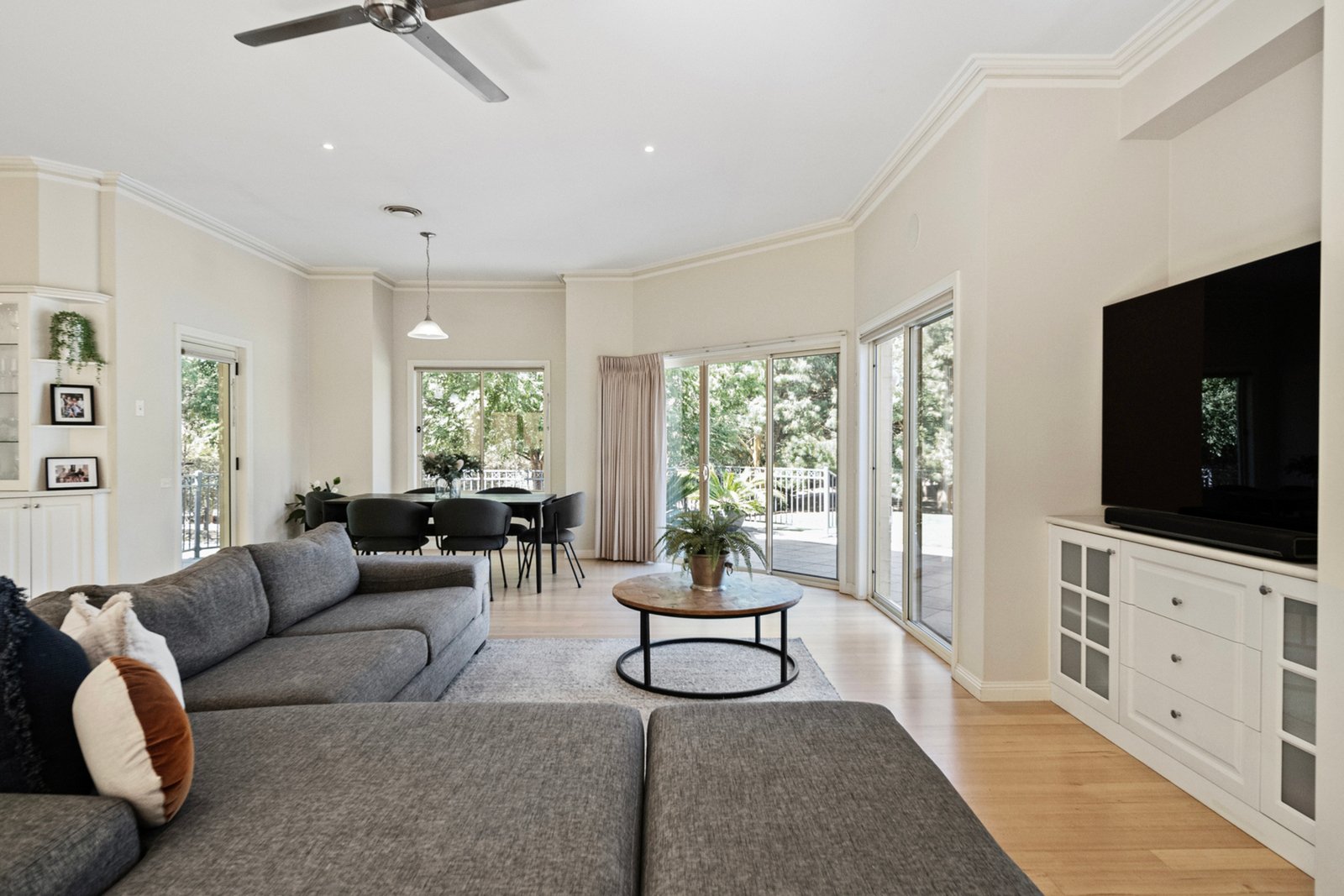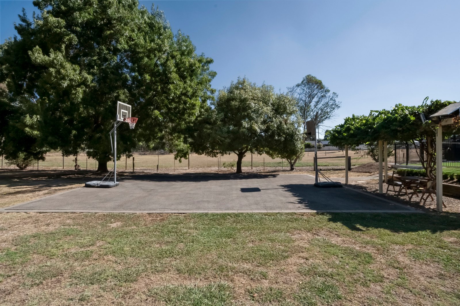 Outside, the extensive patio and a covered alfresco terrace provide the perfect space for entertaining and relaxation overlooking landscaped gardens with established trees, a solar-lit bitumen basketball half-court and a vine-draped pergola.