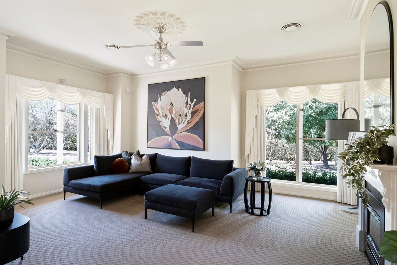 The central hallway opens to the palatial master suite with his and hers walk-in robes and a spacious ensuite boasting twin vanities, a double shower, WC, and a spa bath. Across the hall is the formal lounge with a feature timber fireplace and mantelpiece.