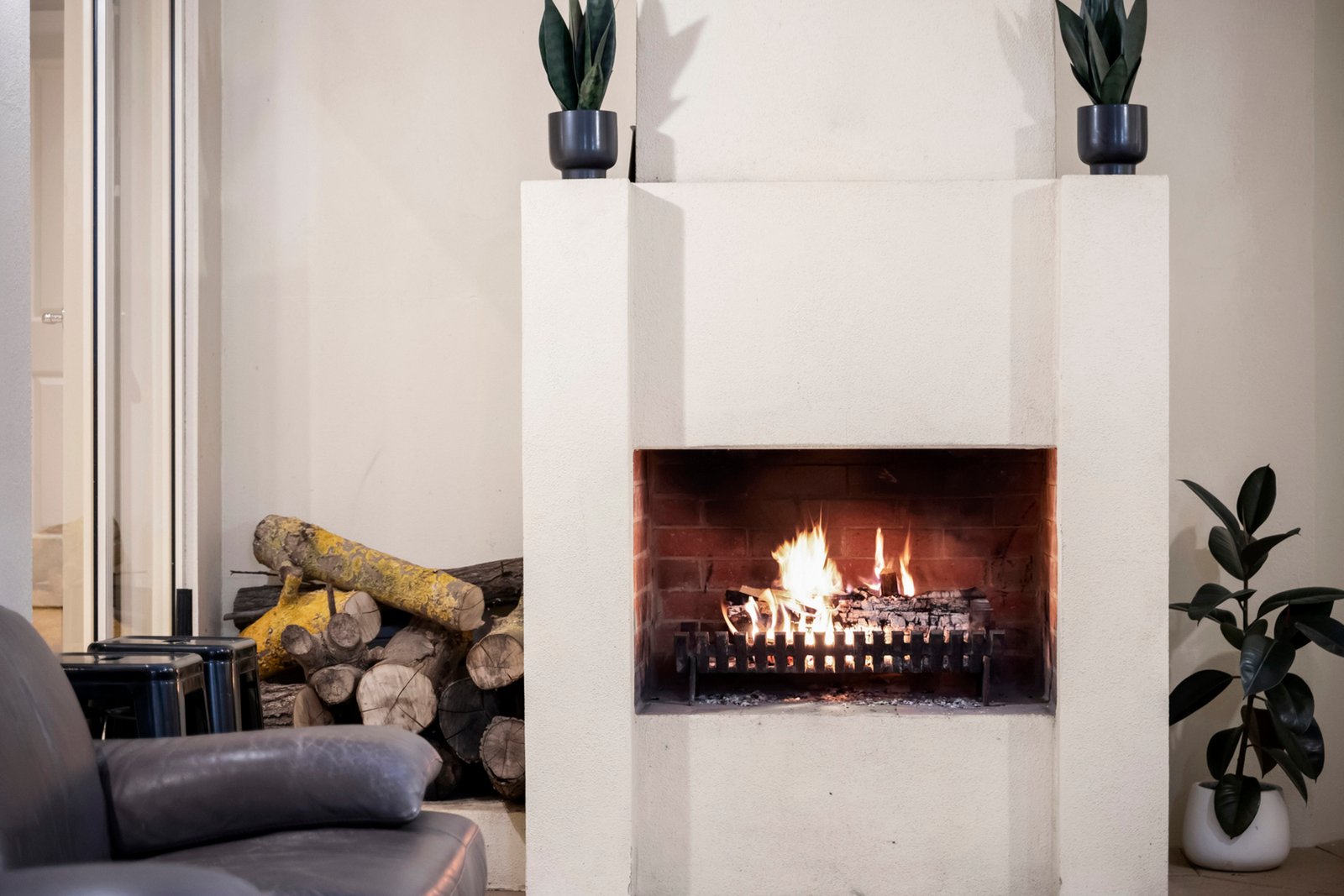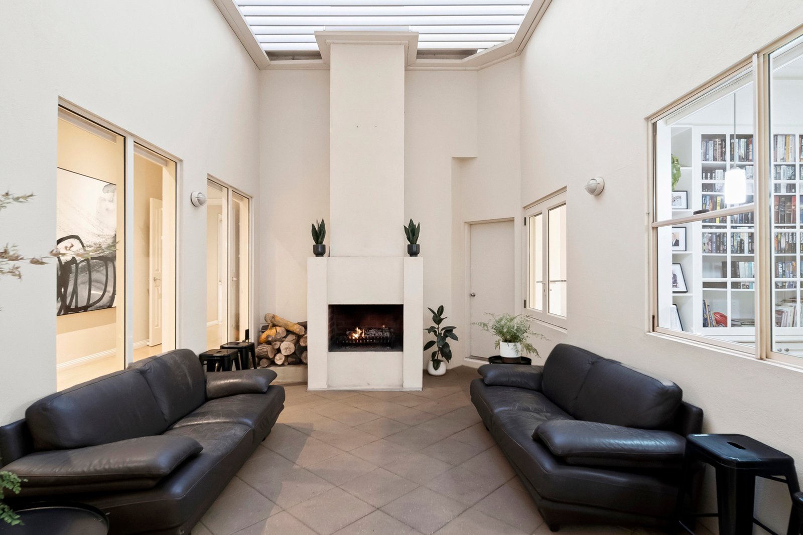 A central atrium with a Verosol rain-sensor louvre roof and an open fireplace offers a unique living zone for year-round use, while the dedicated home office with a built-in wall unit/desks overlooks the atrium, flooding it with natural light and creating a calming workplace environment.