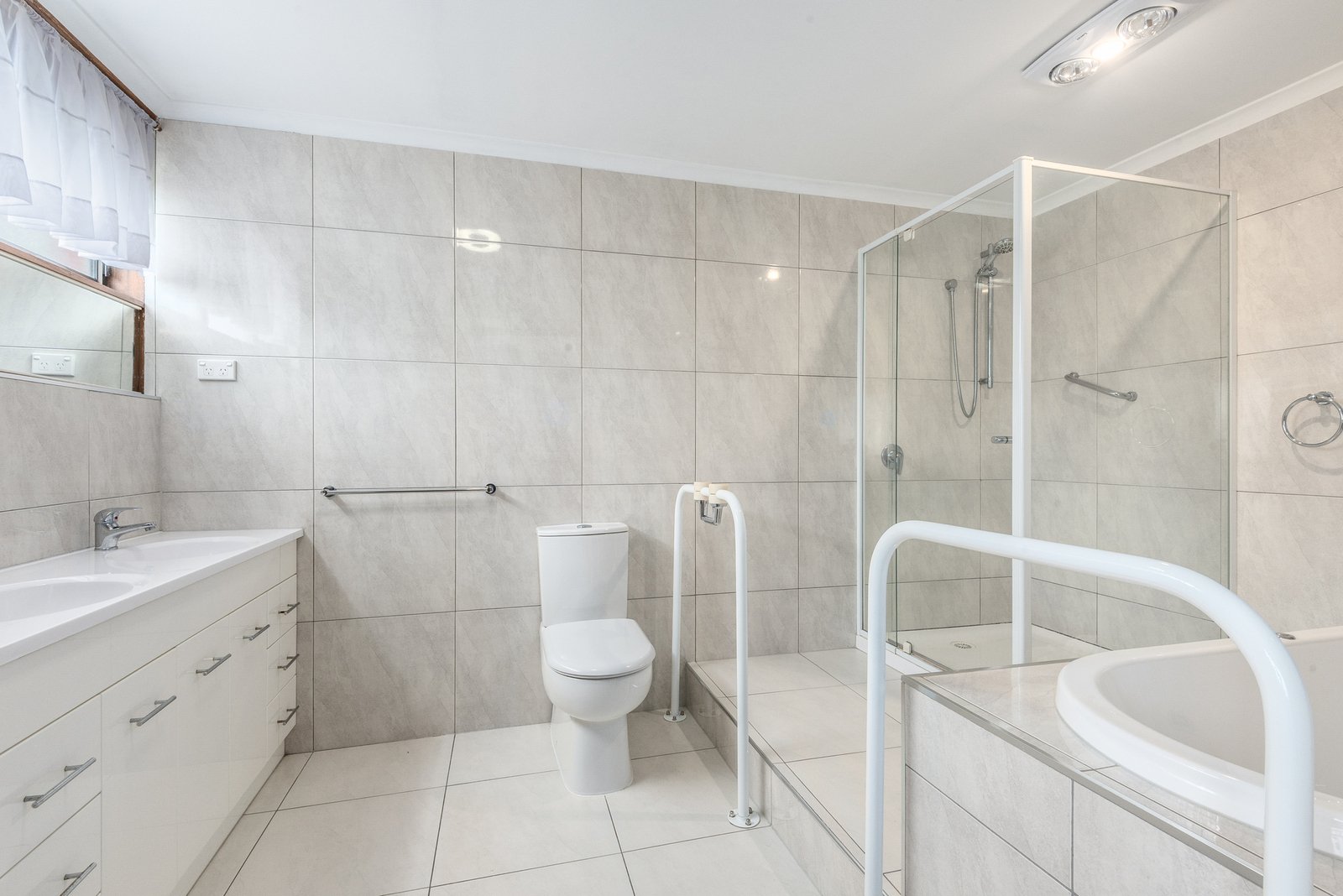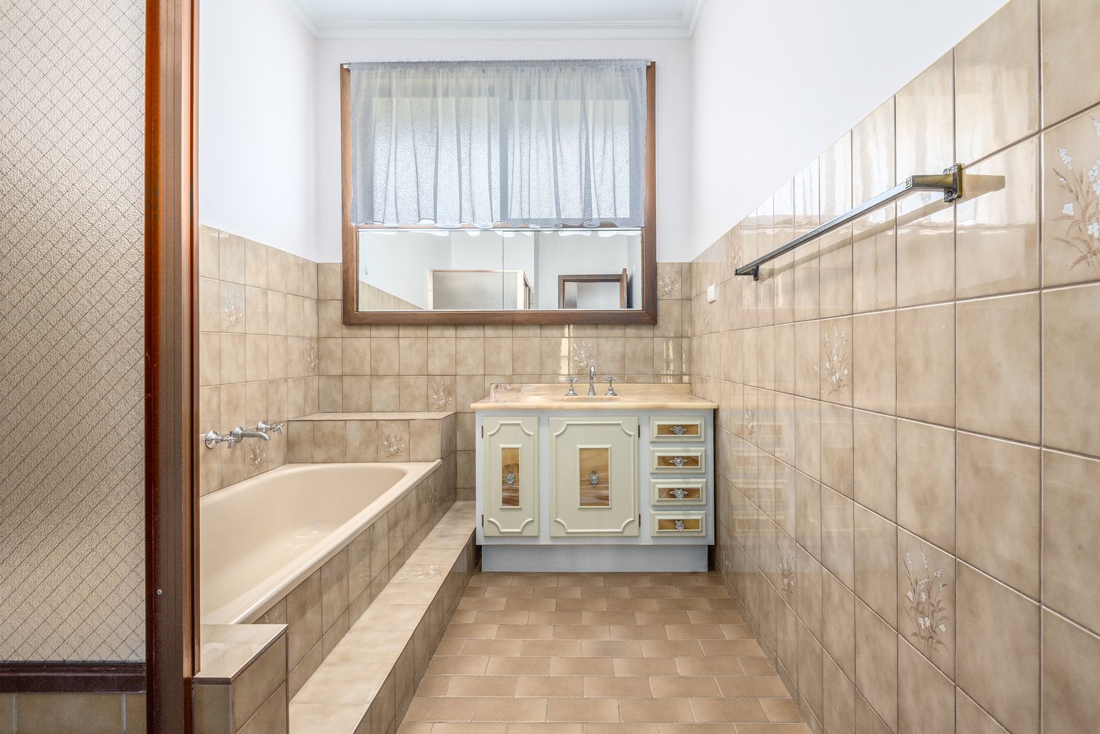 Grand in stature, the classic two-storey façade is set behind neatly maintained gardens. Inside, the ground floor features a large open plan living and dining area with a gas log heater for a cosy atmosphere. The adjoining kitchen is well-equipped with a modern oven and cooktop, and servery window to the dining area. The second living area on this level includes a kitchenette, under-stairs storage and direct access to the backyard. A large laundry and updated bathroom finished in floor to ceiling tiles, with double vanity, luxurious spa bath and separate shower completes the functional layout of the lower level.
