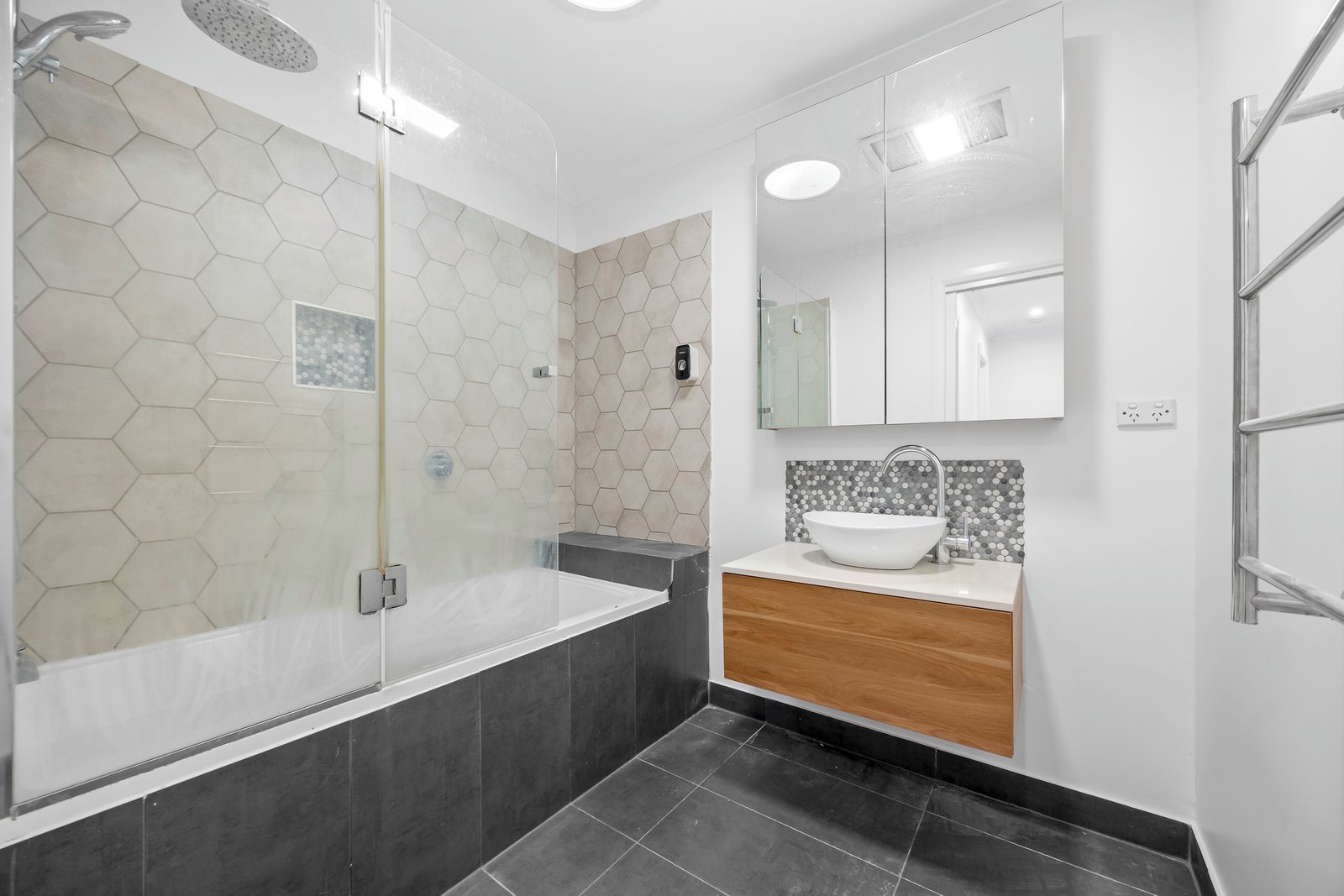- Bathroom with shower over bath and vanity