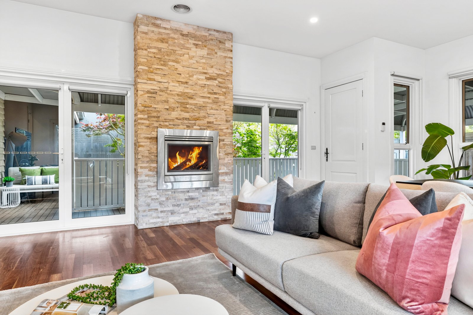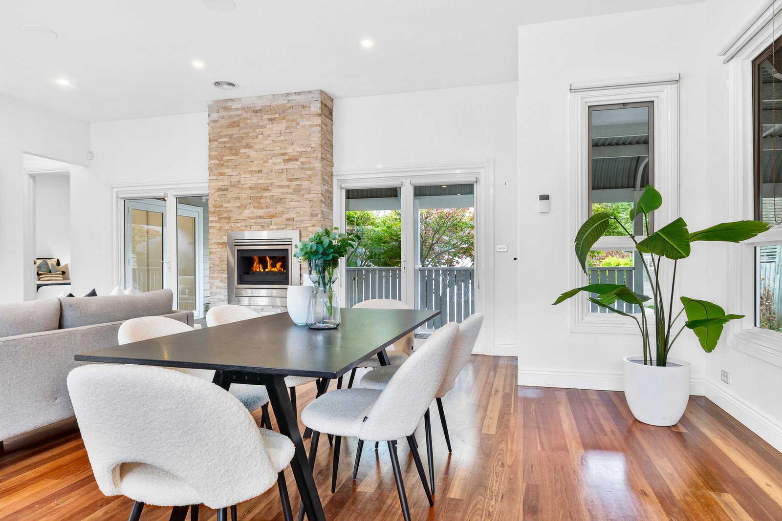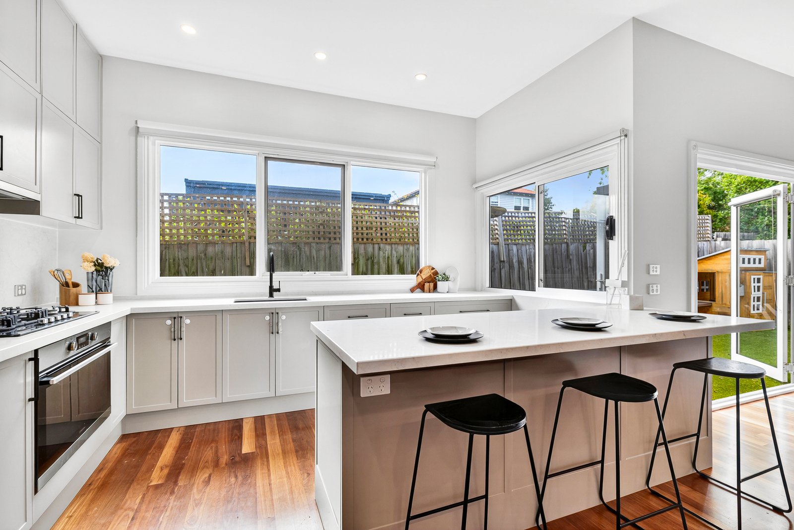 Welcomed by hardwood floors that flow throughout, the home coalesces around a vast open plan living room that’s anchored by a gas fireplace and flanked by a delightful porch to one side and easily managed gardens to the other – each with their charms. Served by a stone kitchen with full height storage, gas cooking, dishwasher and a servery window onto the alfresco dining.