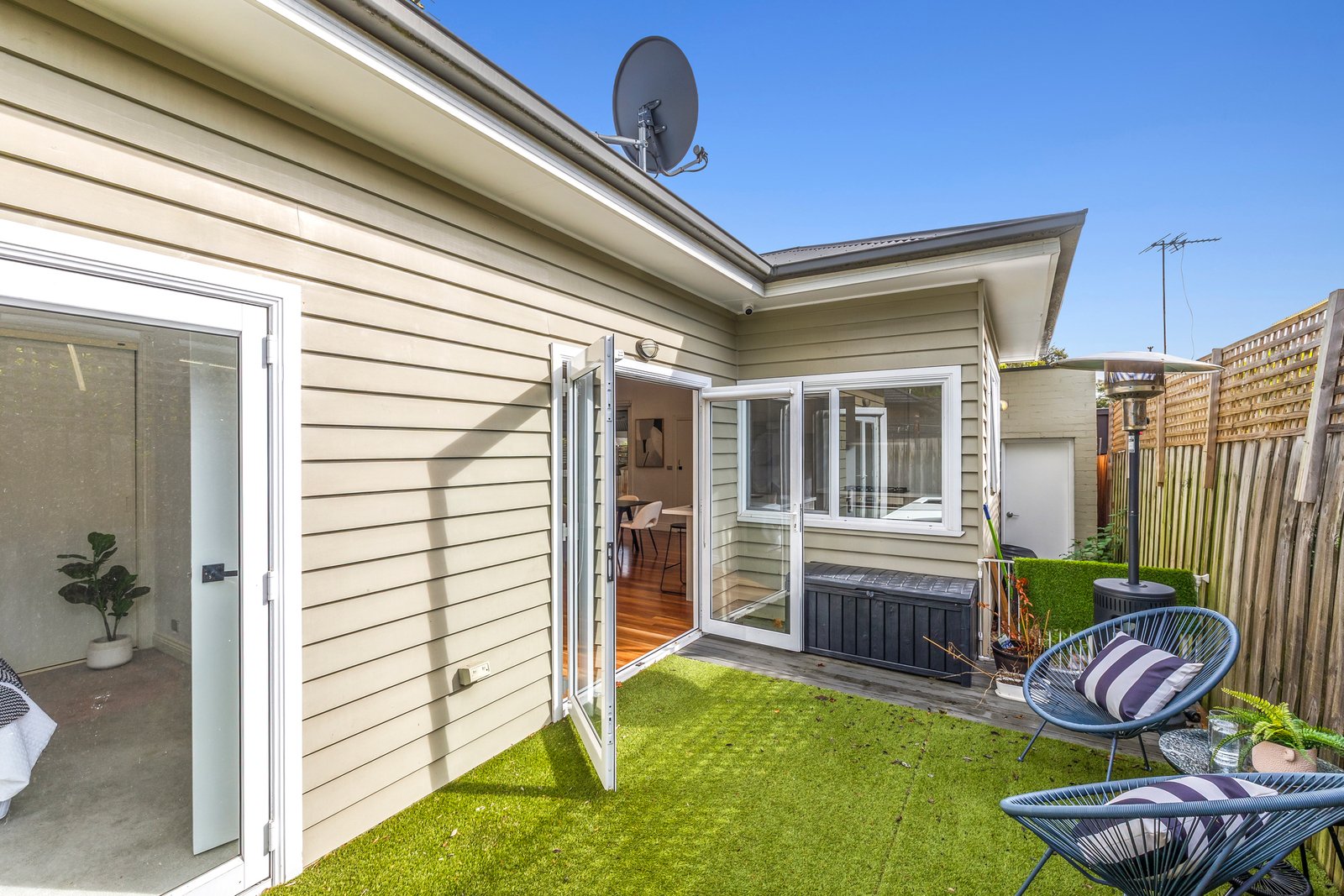 Two extensively robed bedrooms are separated by a bathroom with tub and a walk in shower. Also features ducted climate control, a garage with internal access and a kitchenette – great for hobbyists or entertaining – plus carport parking for one more.