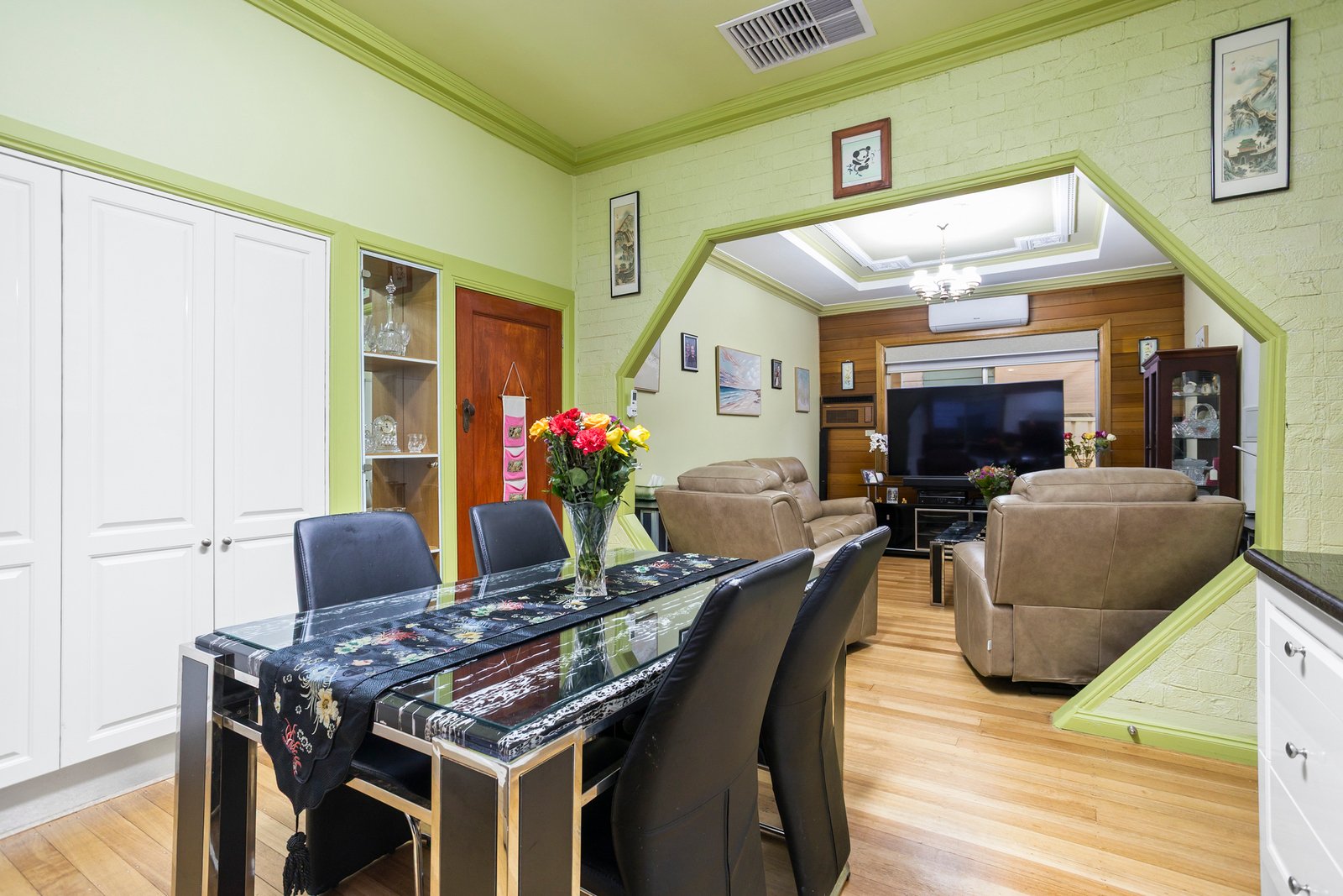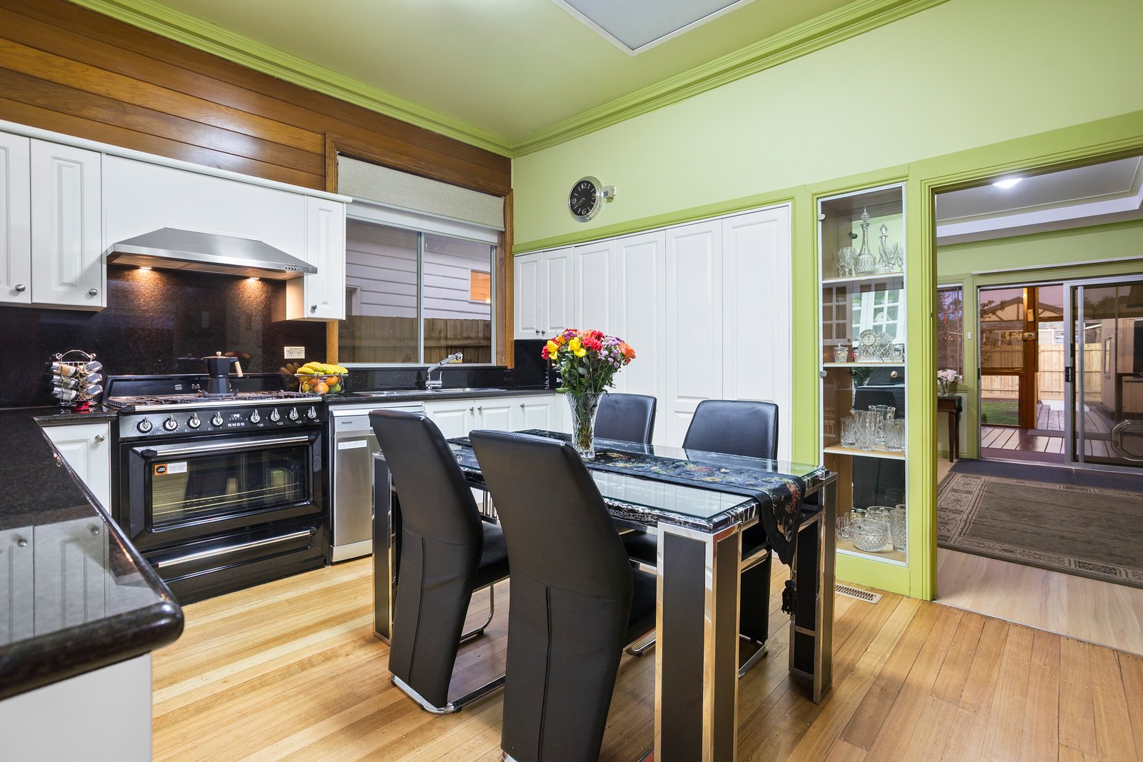 Timber floorboards flow throughout, creating warmth and continuity across the spacious layout. Beautiful ceiling roses throughout the home add to the period charm, while security shutters at the front provide added peace of mind. The thoughtfully designed floor plan offers an open-plan kitchen, meals, and living area at the heart of the home, while a second family and dining room provides wonderful flexibility for entertaining or relaxed gatherings. The kitchen is a true highlight, featuring a premium SMEG dual fuel stove, elegant granite benchtops, and matching splashbacks that combine style with effortless functionality.
