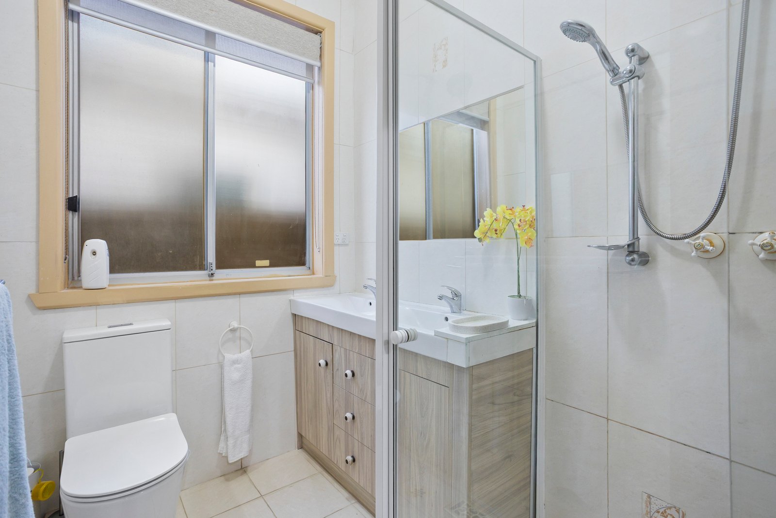 Two well-sized bedrooms include one with built-in robes, while the family bathroom features a double basin. A separate powder room and dedicated laundry add to the home's practical appeal. Year-round comfort is assured with split system heating and cooling throughout, complemented by ducted gas heating, evaporative cooling, and solar panels providing energy efficiency and reduced running costs.