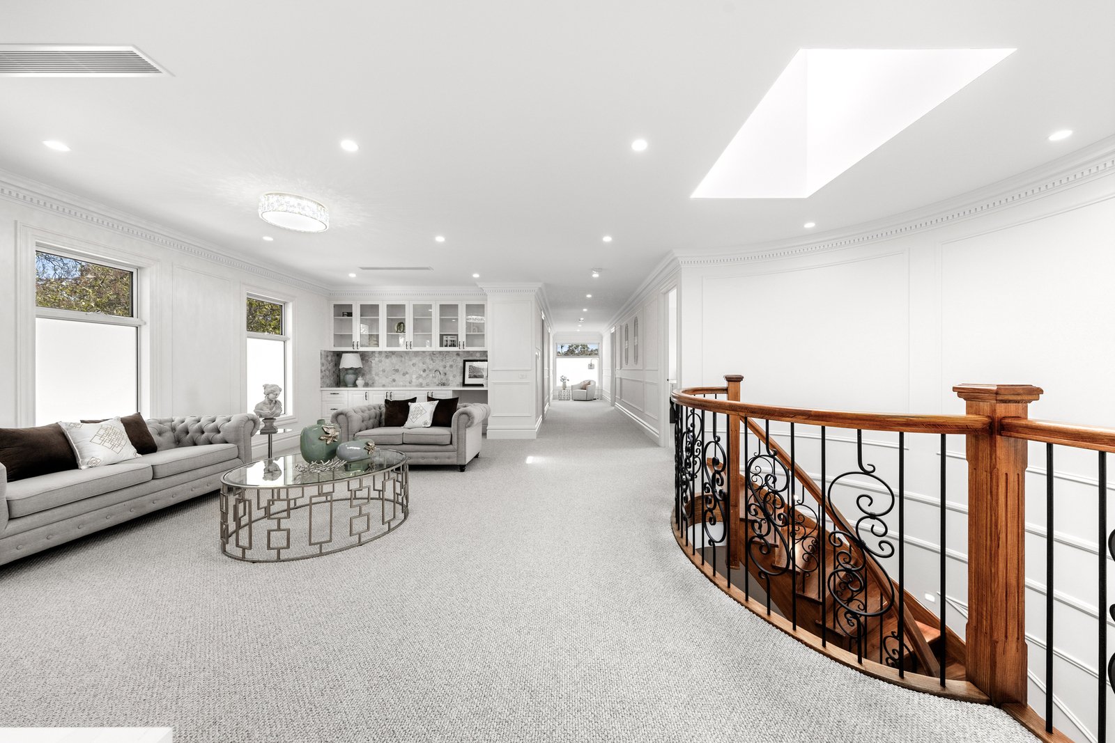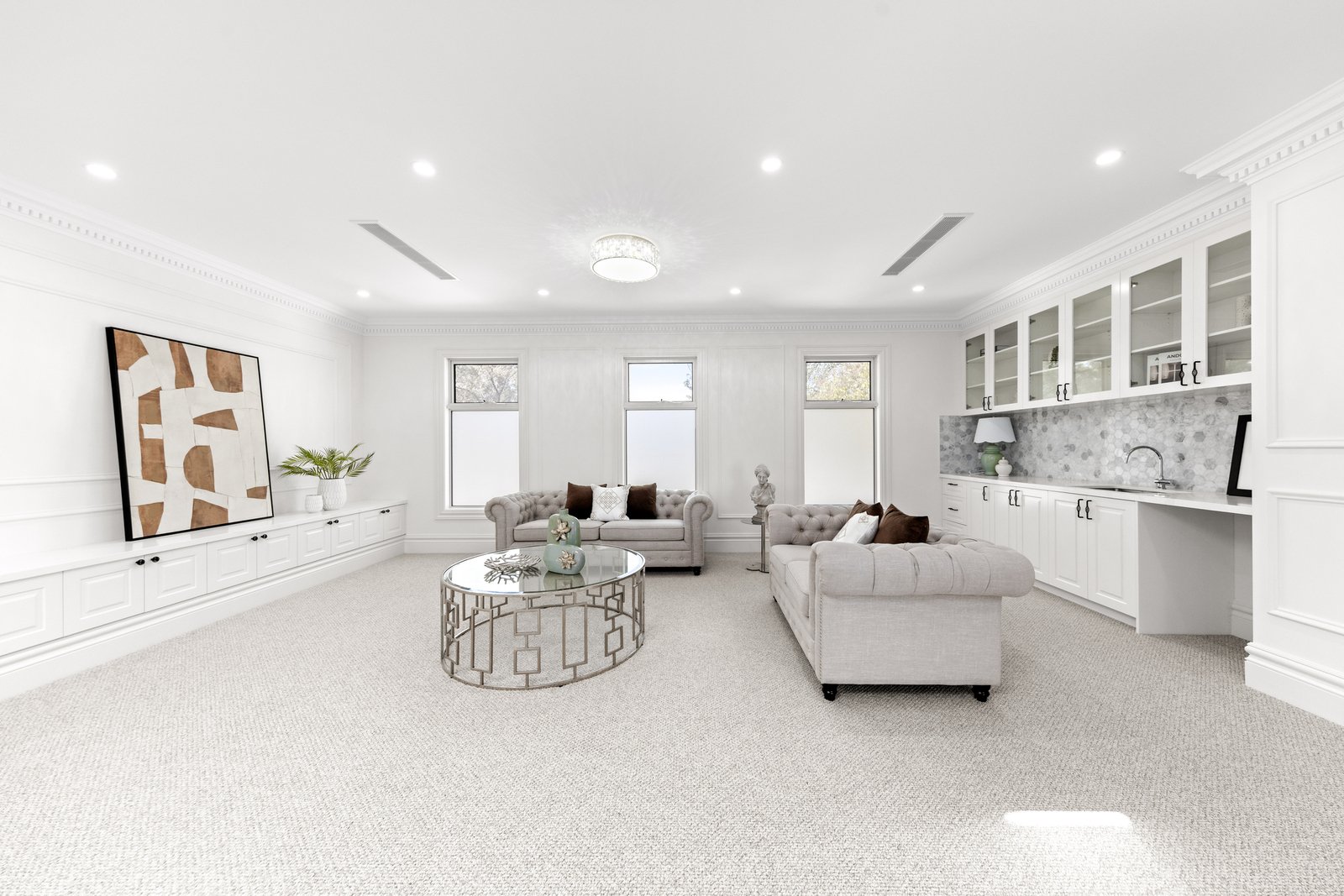 The expansive floorplan has been curated for both indulgent family living and world-class entertaining. A refined formal lounge with fireplace introduces multiple lifestyle domains, including a formal dining hall with kitchenette, private theatre room, upstairs rumpus with bar, and a grand master suite boasting a private terrace and Juliette balcony overlooking the tree-lined streetscape.