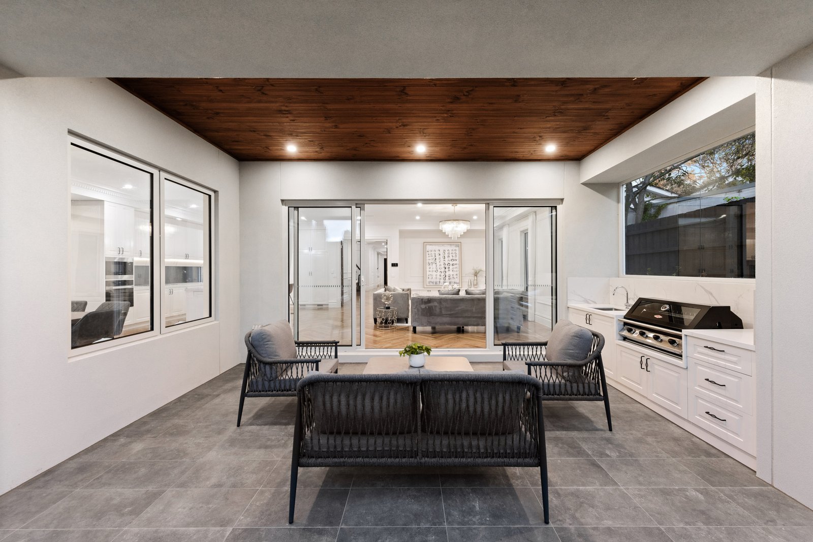 At the heart of the home, an opulent open-plan living and dining zone is anchored by a chef’s kitchen featuring premium Miele appliances, an integrated fridge/freezer, a stone island, and a concealed butler’s kitchen to ensure seamless entertaining. Outdoors, a superb alfresco complete with built-in BBQ, heating, and cooling creates a year-round entertaining haven.