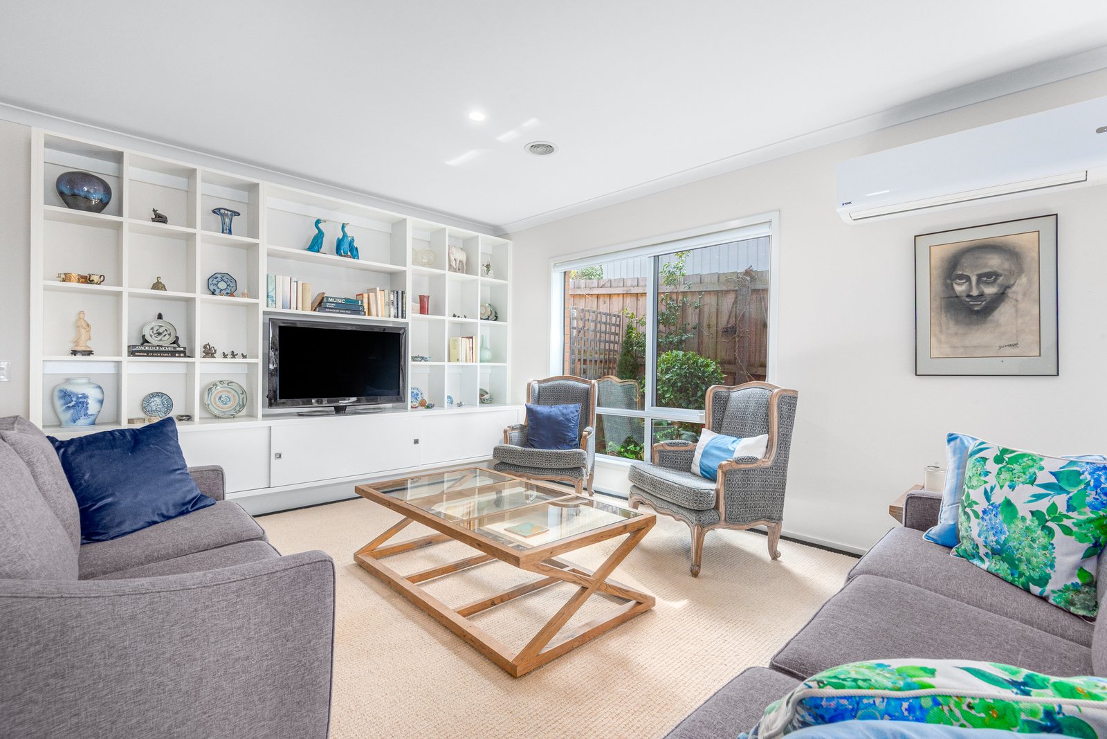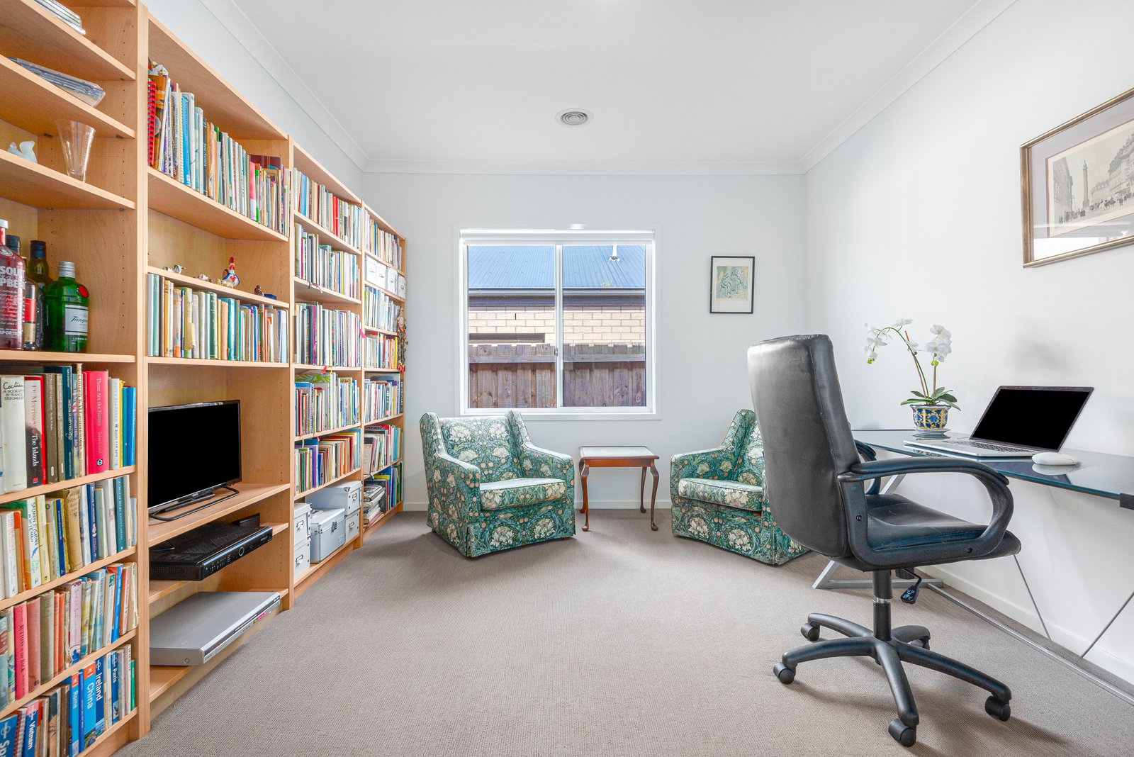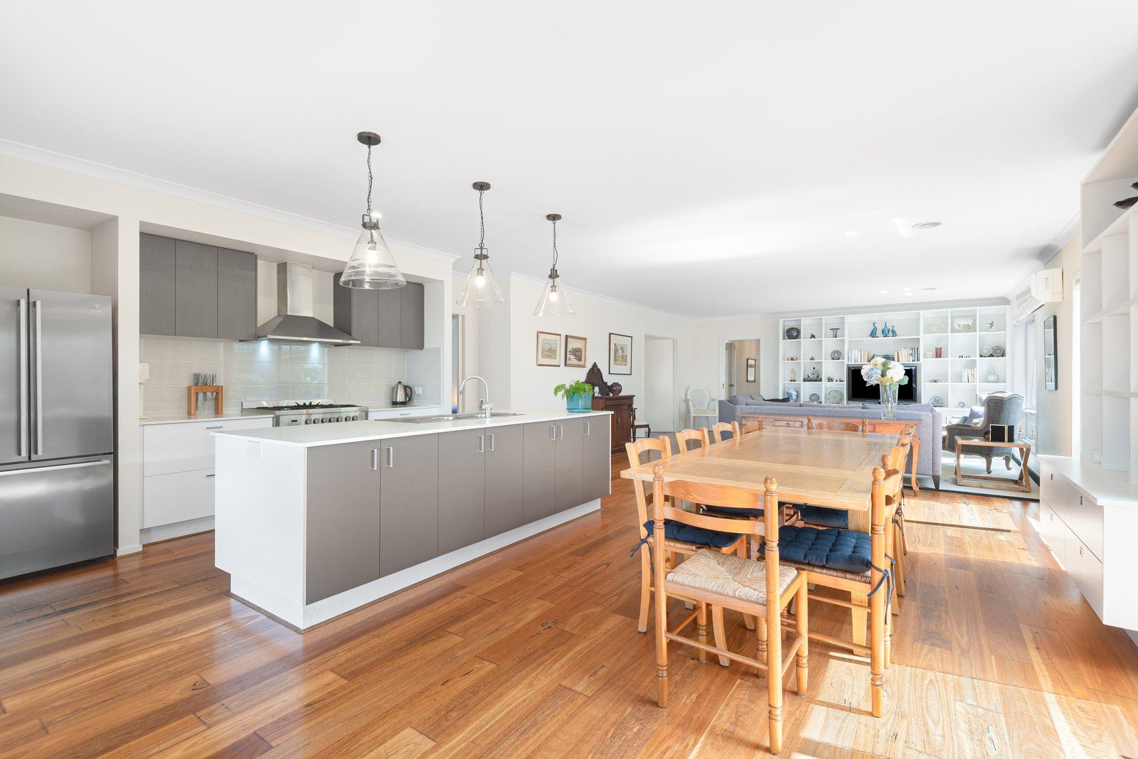 Set behind established gardens, the classic contemporary façade is timeless in style. Stepping inside, a central hallway takes your eye through the length of the home, showcasing elegant interiors, quality finishes, and beautiful timber flooring. The spacious open plan living area features large north facing windows streaming natural light within, and glass stacker doors connecting to the alfresco for a seamless indoor-outdoor flow. Custom joinery and bookshelves offer both style and function, while ducted heating, plus split system heating and cooling, cater for comfortable living all year round. Double doors open up to a second living space, offering a quiet space to retreat, watch a movie, or work from home.