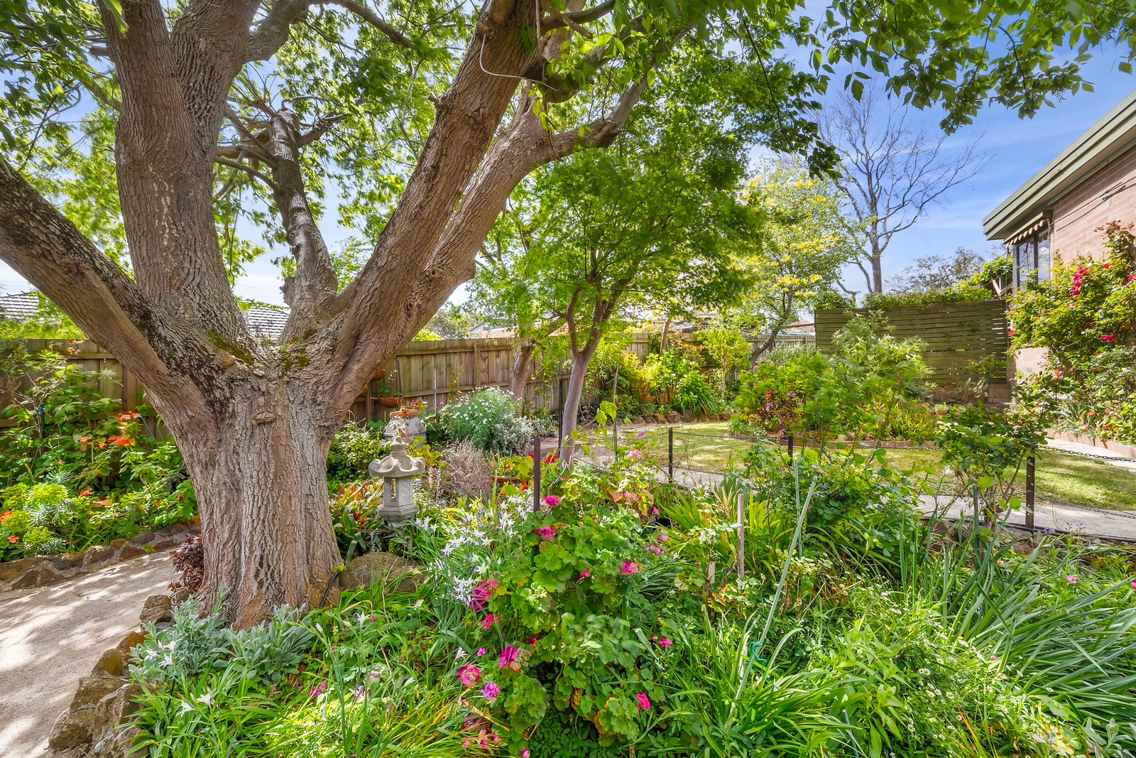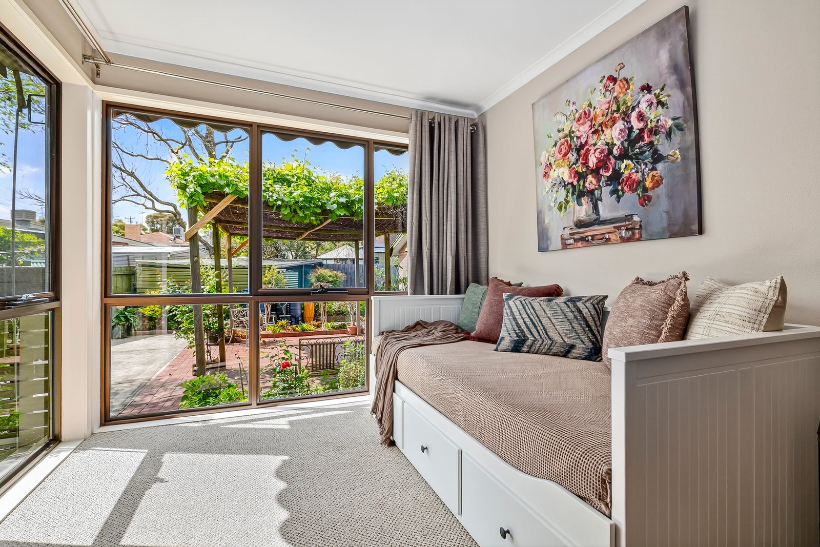 With the comfort of hardwood floors, gas ducted heating and RC/AC, this home wraps around whimsical gardens anchored by a pergola from which to perch yourself. Inside, the home comprises a cheerful kitchen (gas cooking and dishwasher) serving the dining room and an immense living room zoned into a lounge and rumpus.