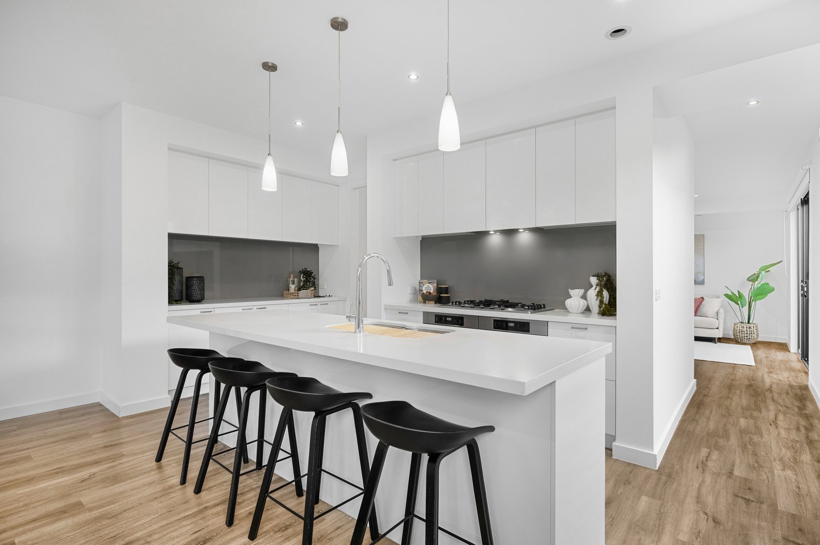 At the heart of the home lies an expansive open-plan kitchen, living, and dining area. Flooded with natural light, this inviting space is perfect for family gatherings or relaxed evenings. The designer kitchen impresses with stone benchtops, premium Miele appliances including dual ovens and gas cooktop, and a generous butler’s pantry for added storage and prep space.