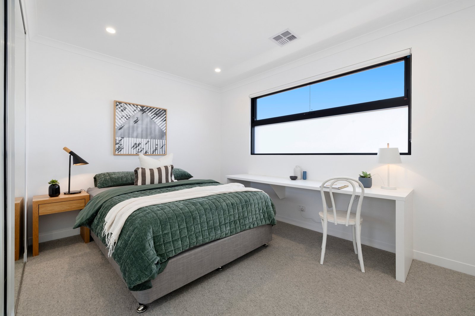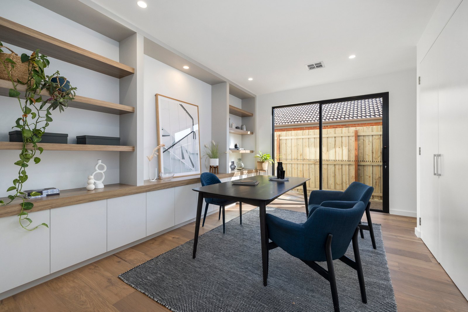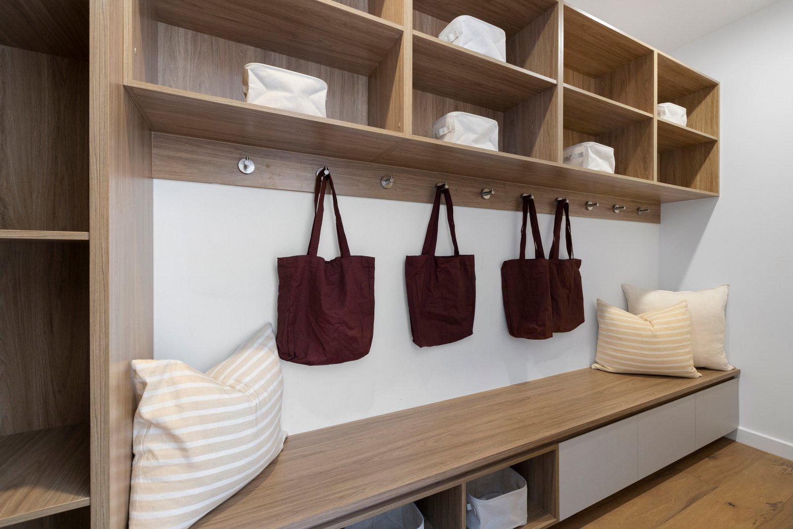 Whether entering through the front door or double auto garage, a fully-fitted mud room with handy nooks, pegs and cubbies is an invaluable inclusion – perfect for school bags, coats and sports equipment. Further on, a versatile home office (fifth bedroom) features extensive wardrobing, a luxe ensuite and bespoke shelving – a space that can be easily adapted to suit individual needs.