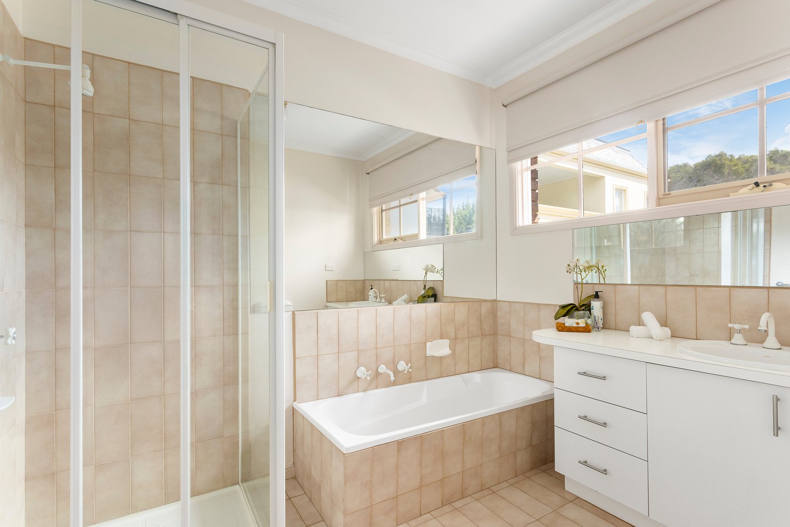 A clever floorplan places each bedroom in its own private zone, both with extensive built-in storage and direct access to a bathroom. The main suite includes its own ensuite, while the second bathroom with bath caters perfectly for visiting family or guests. Additional features include ducted heating, split system cooling, a full laundry with outdoor access, solar pool heating and ample gated parking.