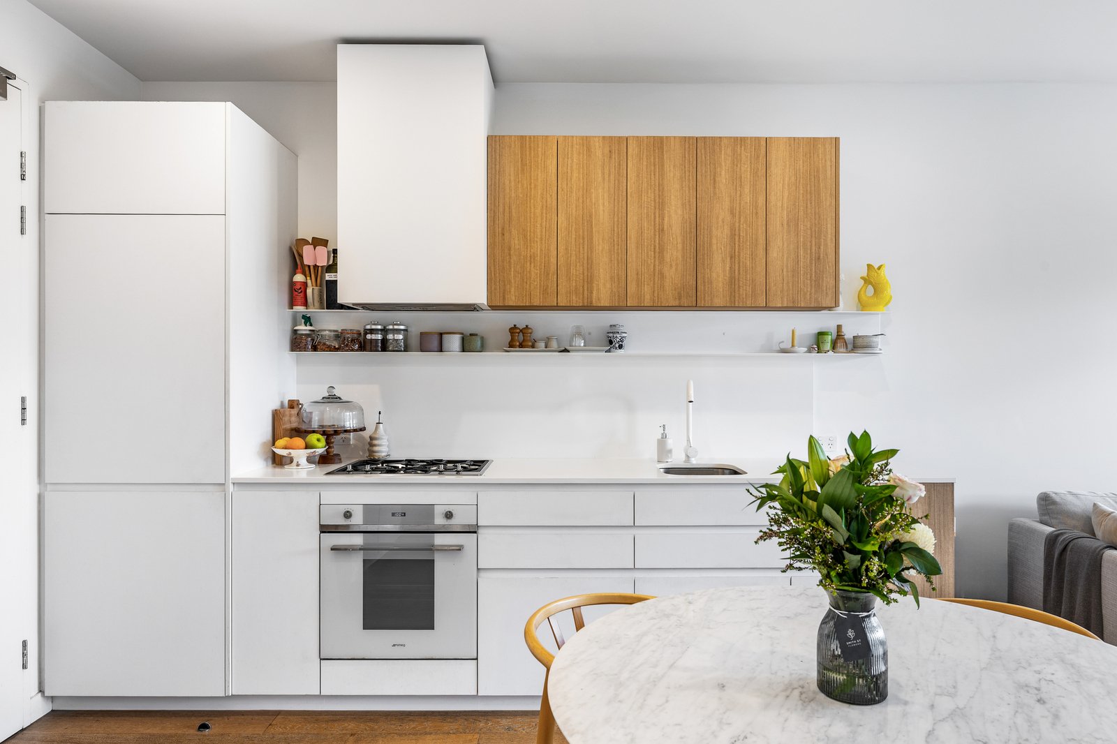 Step inside to discover a light-filled open-plan living, dining, and kitchen area, where warm timber floors provide a welcoming contrast to sleek, modern finishes. The kitchen is a statement in design and practicality, featuring stone benches, an integrated dish drawer, Smeg appliances including oven and gas cooktop, a hidden fridge, and a Euro laundry, seamlessly blending form and function. The living area extends effortlessly to a north-west facing paved balcony, perfect for morning coffee or evening entertaining.