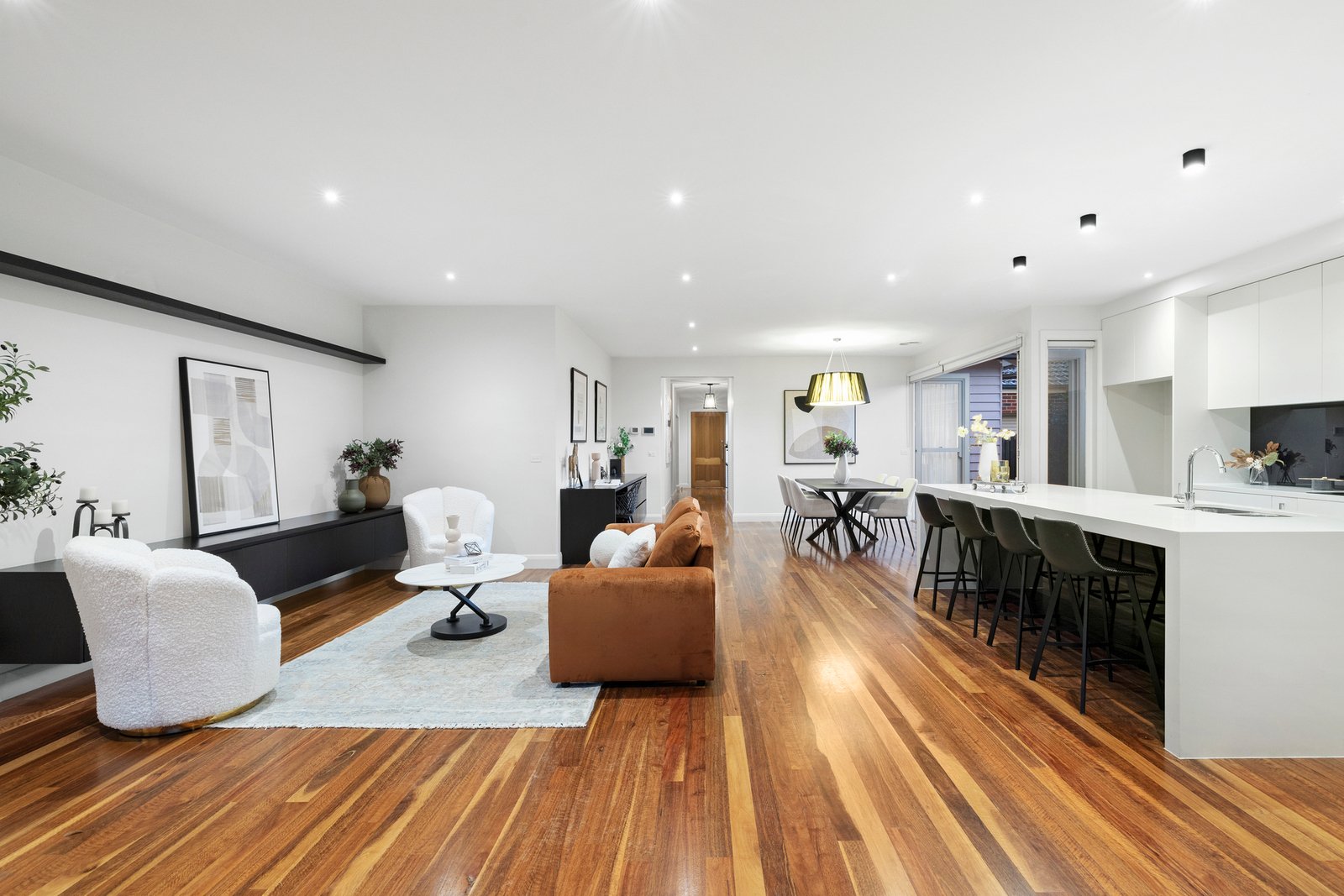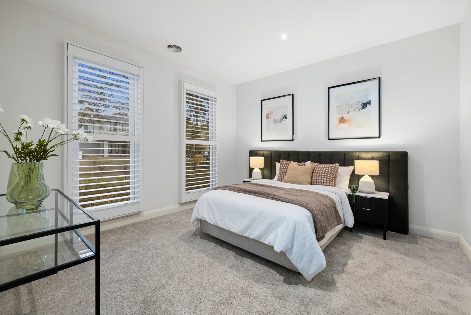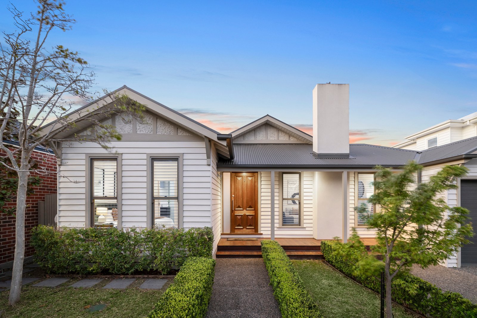 4 bedrooms (main with fully-tiled ensuite) and chic bathroom create an indulgent experience for family living, whilst ducted heating/AC, guest powder room, video intercom, plantation shutters, auto entry gate, good-sized hedged rear garden, water tanks, single garage plus storage and 2 off street car spaces add further lifestyle luxury.