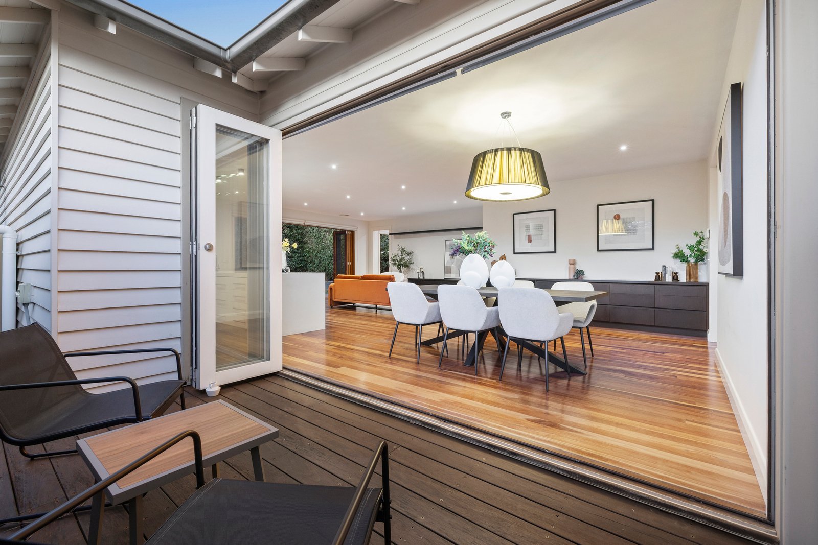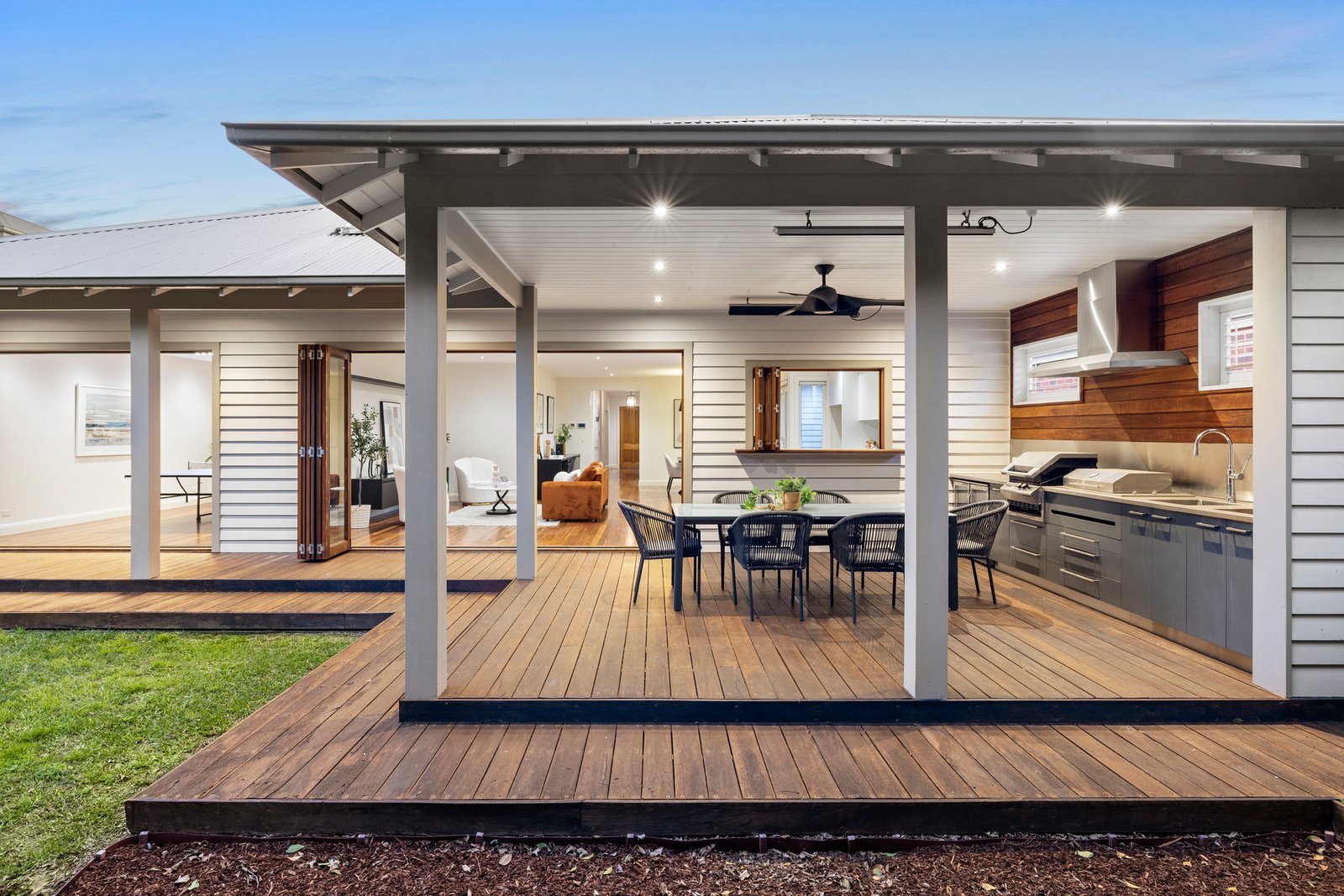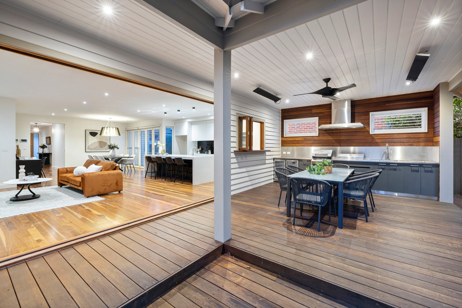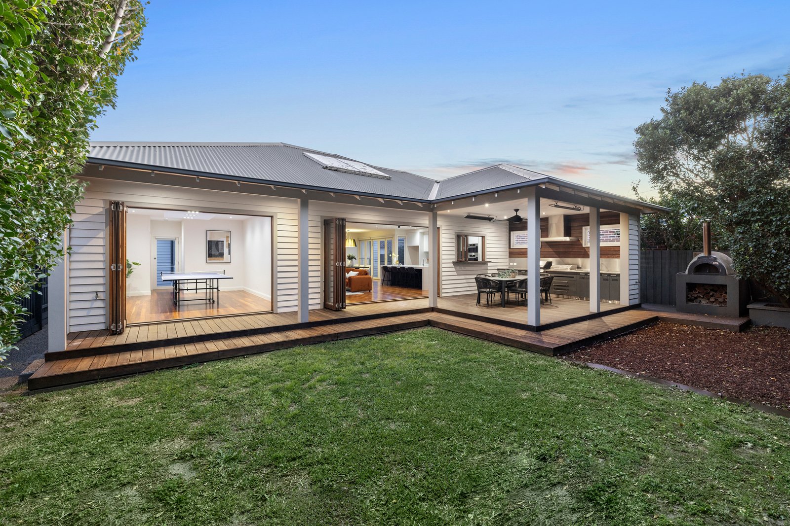 Bi-fold doors extend all living outdoors to a private all-seasons covered alfresco (outdoor heaters) showcasing a woodfire pizza oven, 2 built-in BBQs, sink and bar fridge - inviting effortless indoor-outdoor entertaining.