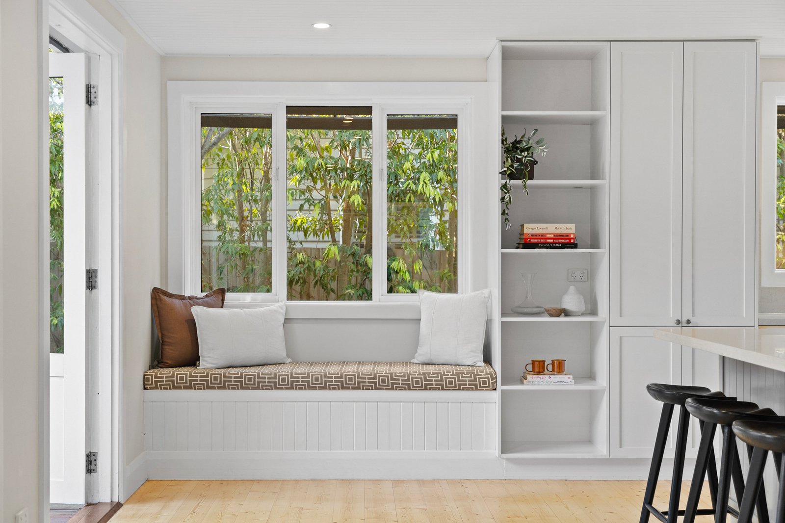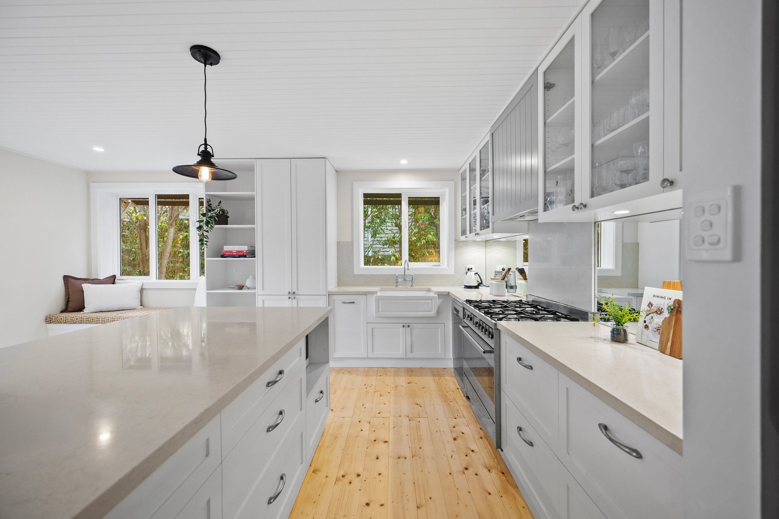 At the heart of the home, a light-filled open-plan family domain connects seamlessly to the outdoors. The stone-finished kitchen boasts a 900mm Smeg freestanding cooker, Bosch dishwasher, ample storage, and breakfast bar, overlooking a casual sitting area with window seat. French doors open to a generous wraparound deck and lush landscaped gardens, perfect for relaxed alfresco living.