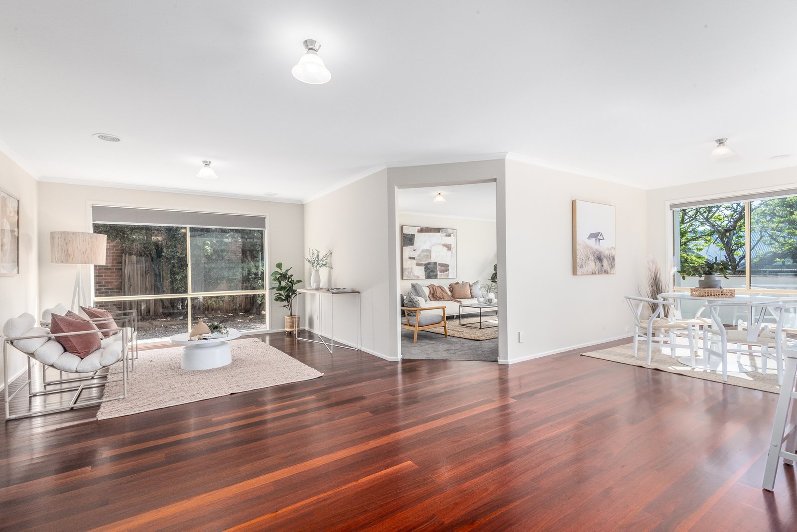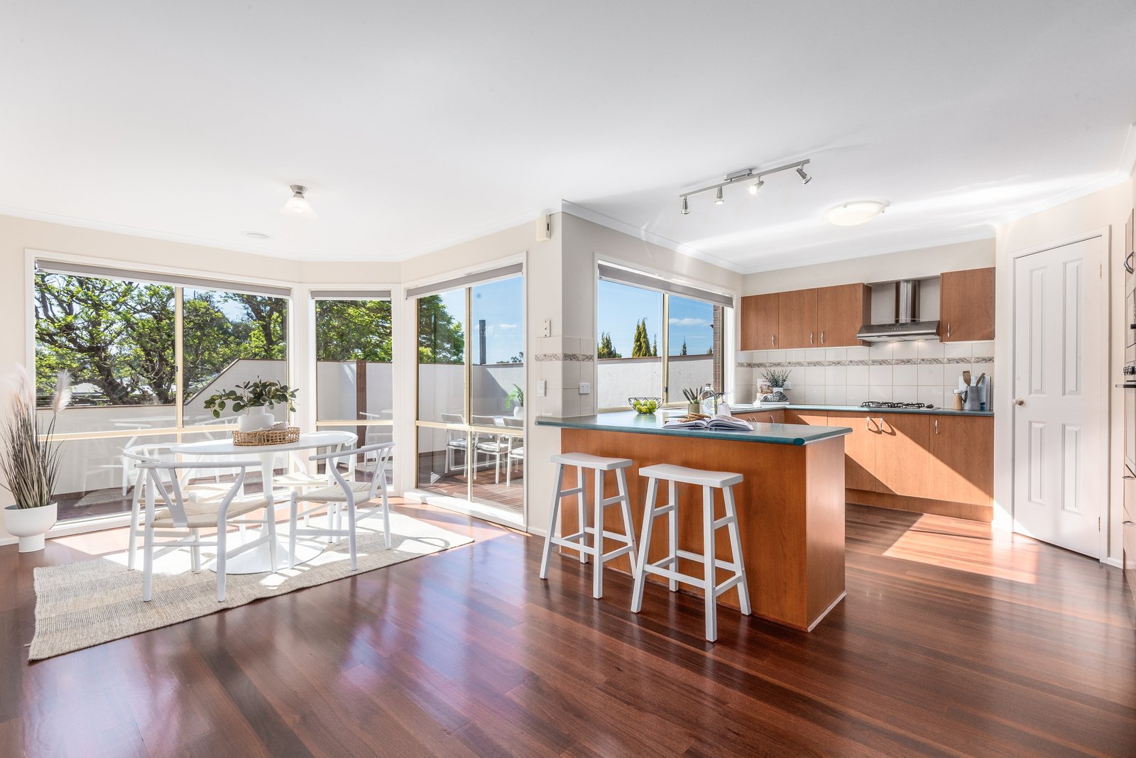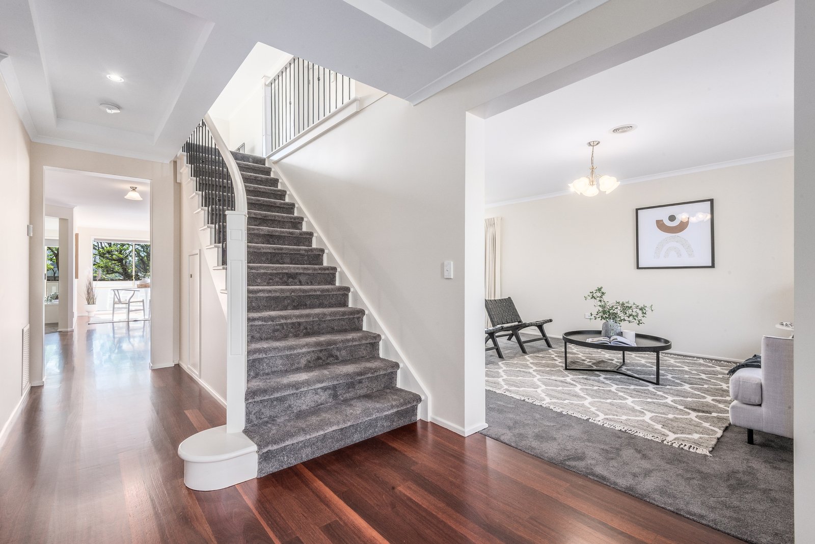 Set behind established trees, the grand two-storey façade is timeless in appeal. Stepping into a wide entry, polished timber floors and a central staircase greet you within. A formal lounge and dining room introduce the sophisticated theme of the interiors, and an adjacent home office provides the perfect space to work from home. The rear of the ground floor transitions to a light-filled open plan kitchen, dining and living area. The well-appointed kitchen features quality appliances including Westinghouse 600mm wall oven and in-built microwave, gas cooktop, Bosch dishwasher, and generous storage with a walk-in pantry. Positioned to overlook the outdoor entertaining area, the layout caters for effortless entertaining indoors and out. An adjoining third living area offers a quiet spot to retreat, with direct access to the rear deck.