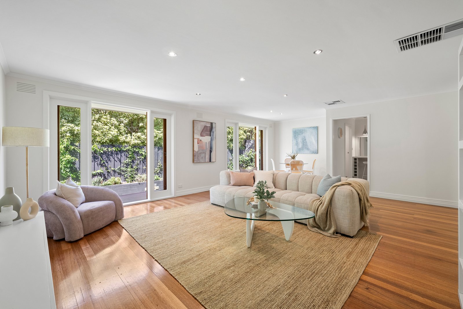 Polished timber floors set a welcoming, refined tone through the wide hallway, unfolding to expansive living and dining domains awash with natural light, where generous glazing draws the surrounding landscape in.