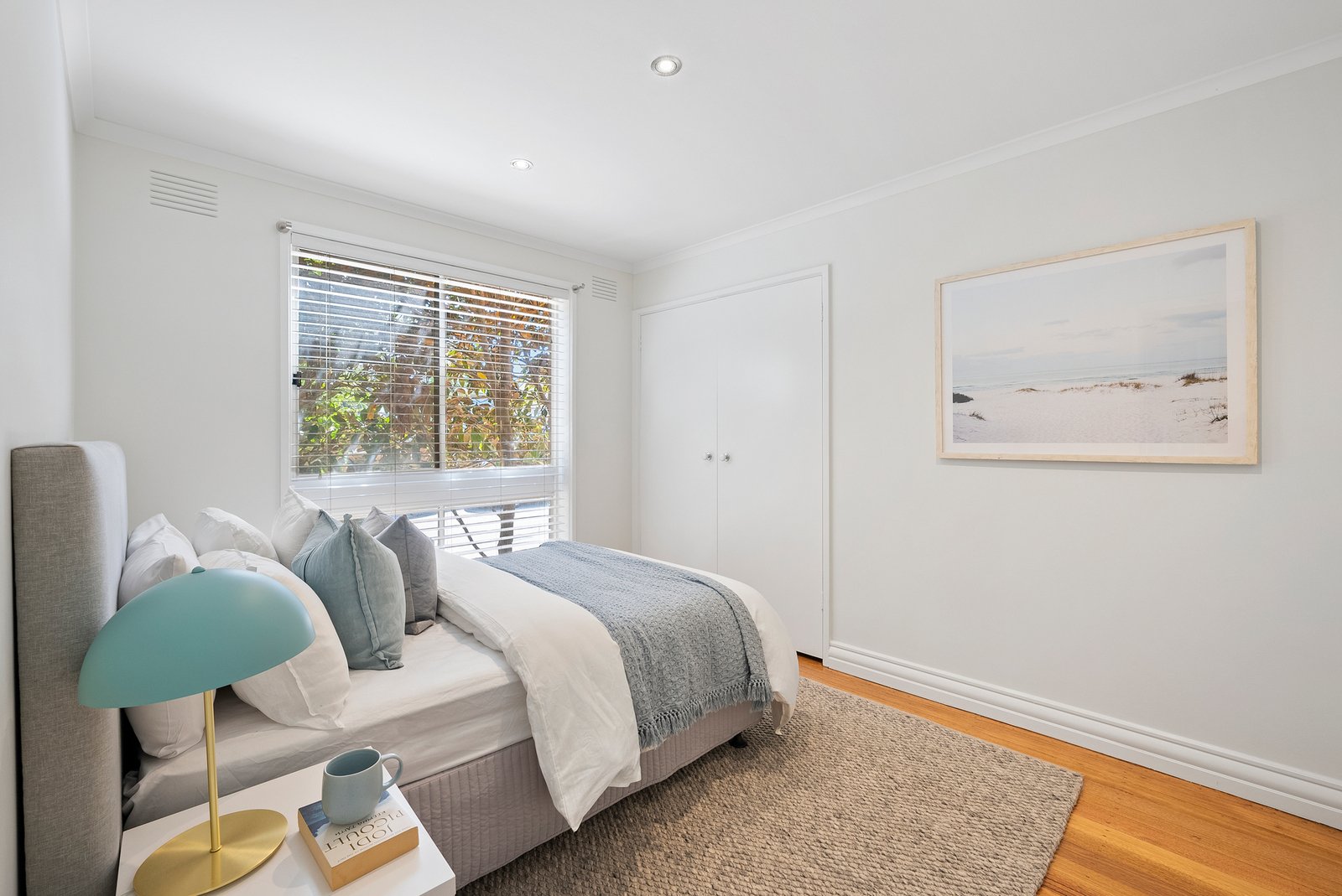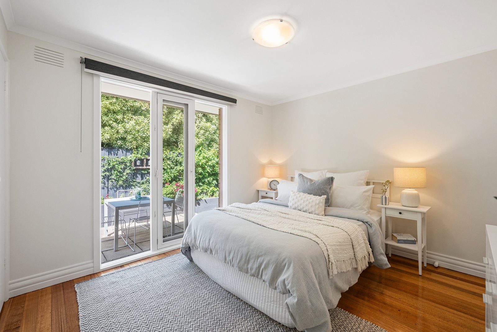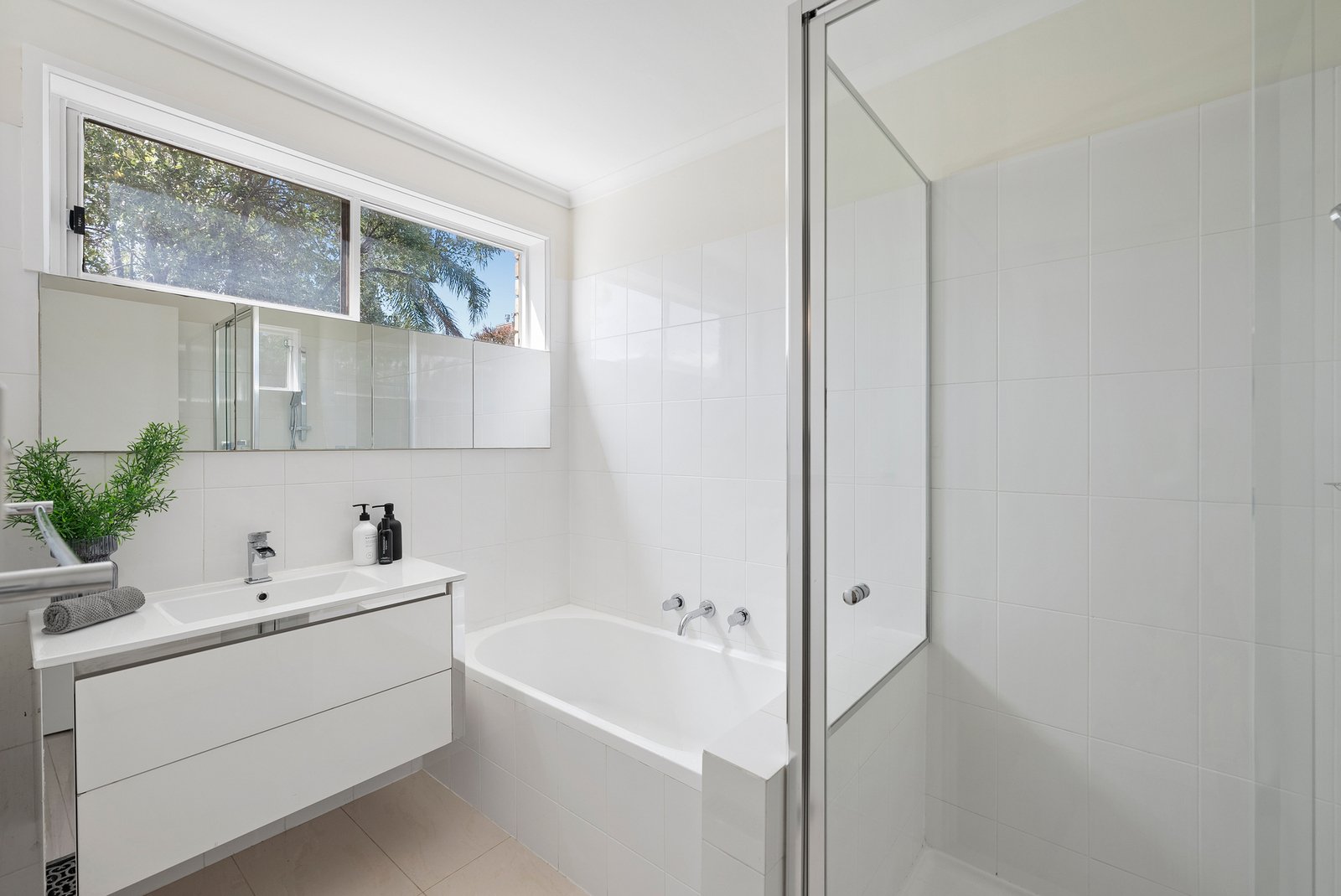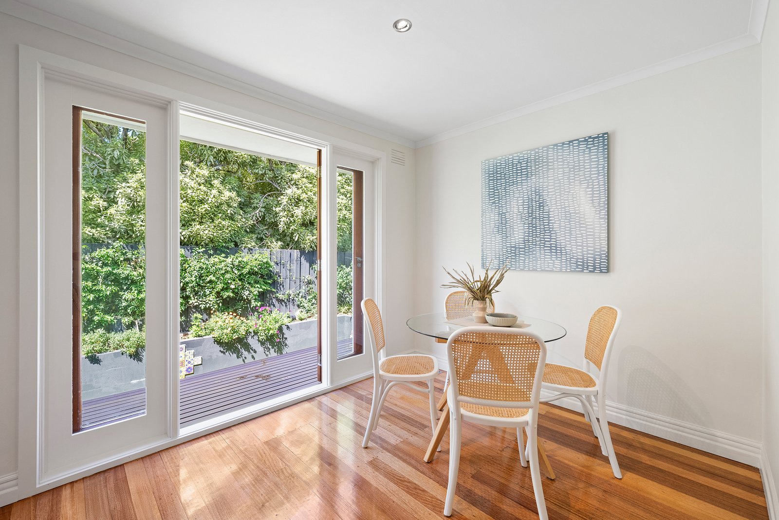 Each of the three bedrooms enjoys a leafy outlook and built-in robes, served by a bright, central bathroom defined by its crisp simplicity. The generous main bedroom is zoned for rear-facing serenity.