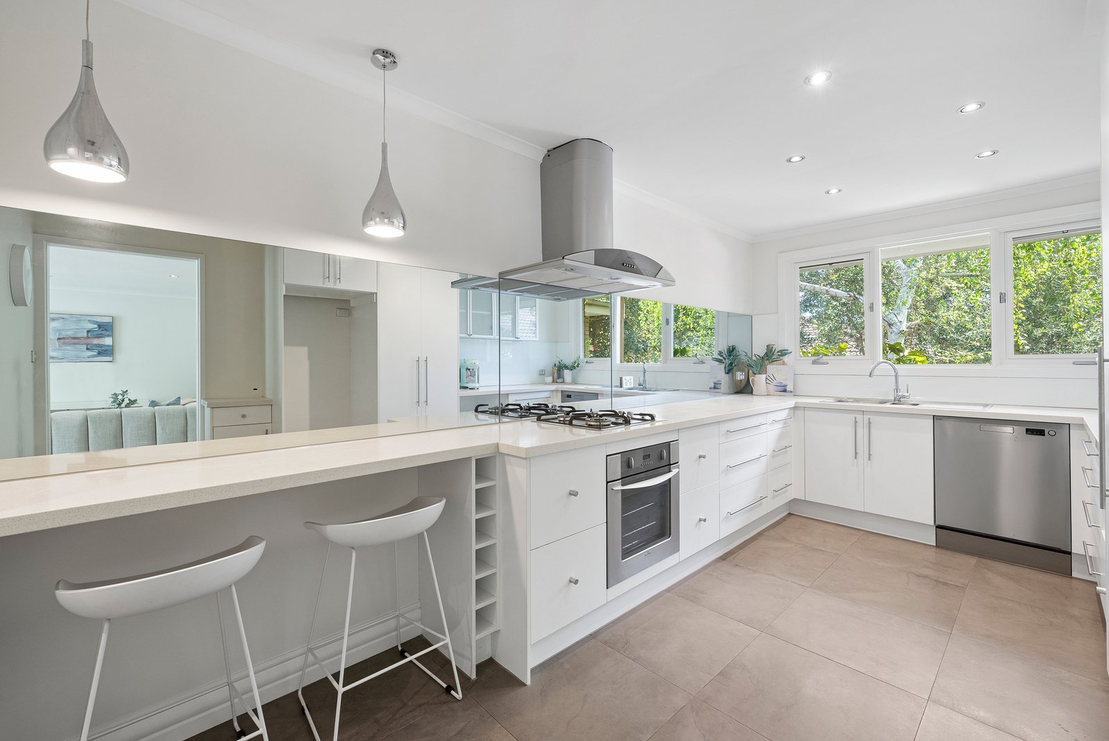 Back inside, the sleek stone-finished kitchen features generous prep space, quality stainless-steel appliances, and well considered storage enhancing its everyday appeal.