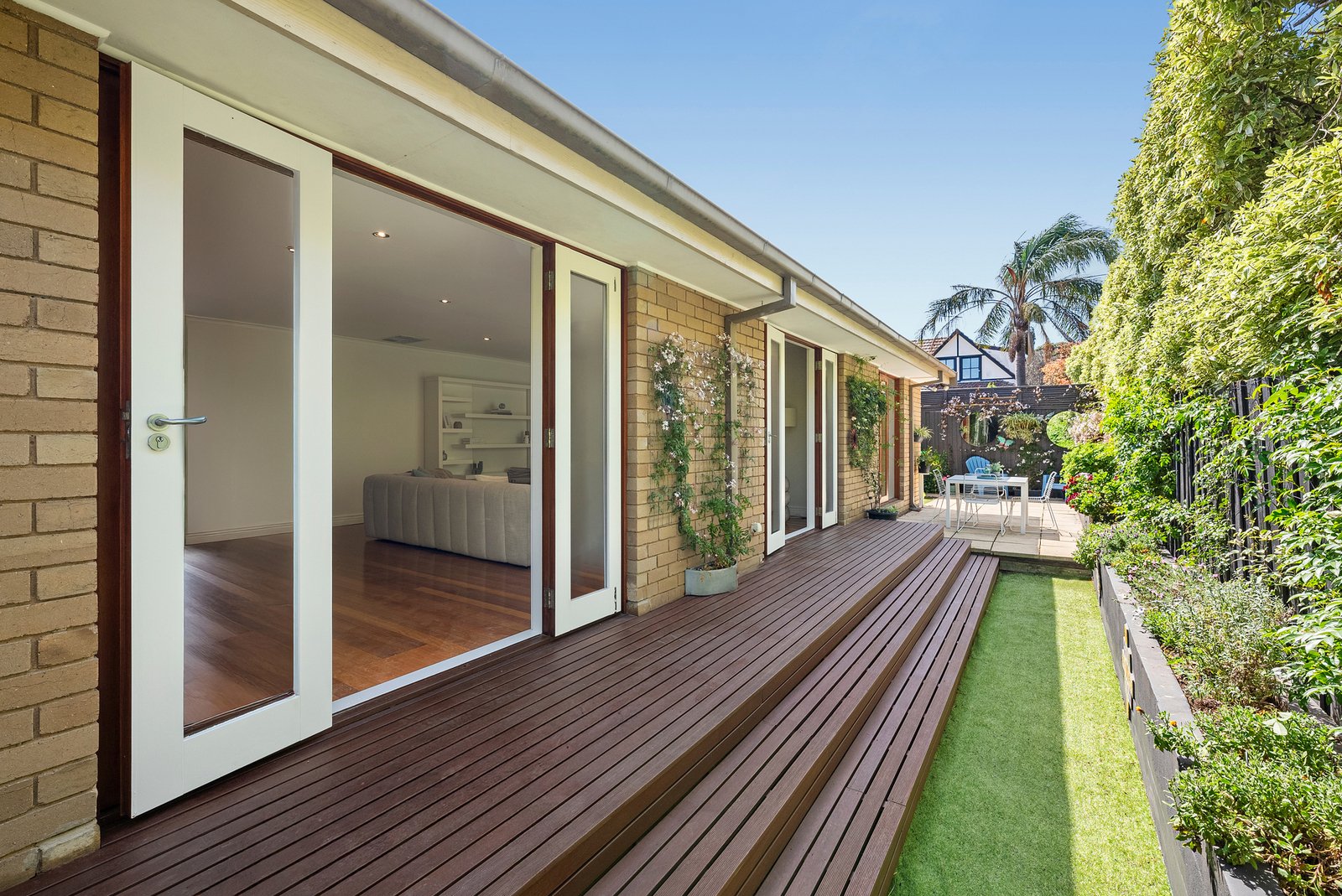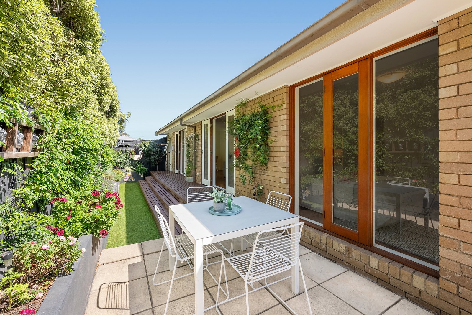 The transition between indoors and out is effortless, with dual French doors extending to an elevated deck and north-facing terrace embraced by vibrant, established gardens - an idyllic backdrop for al fresco entertaining or relaxed afternoons in the sun.