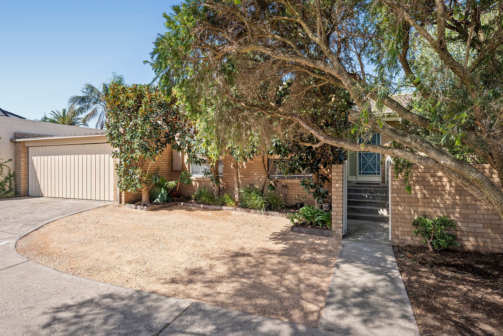 Tranquil greenery embraces the approach to the front door, with steps rising to an elevated entry surrounded by dappled light and garden calm - a peaceful prelude to interiors defined by warmth, openness, and a sense of quiet retreat.
