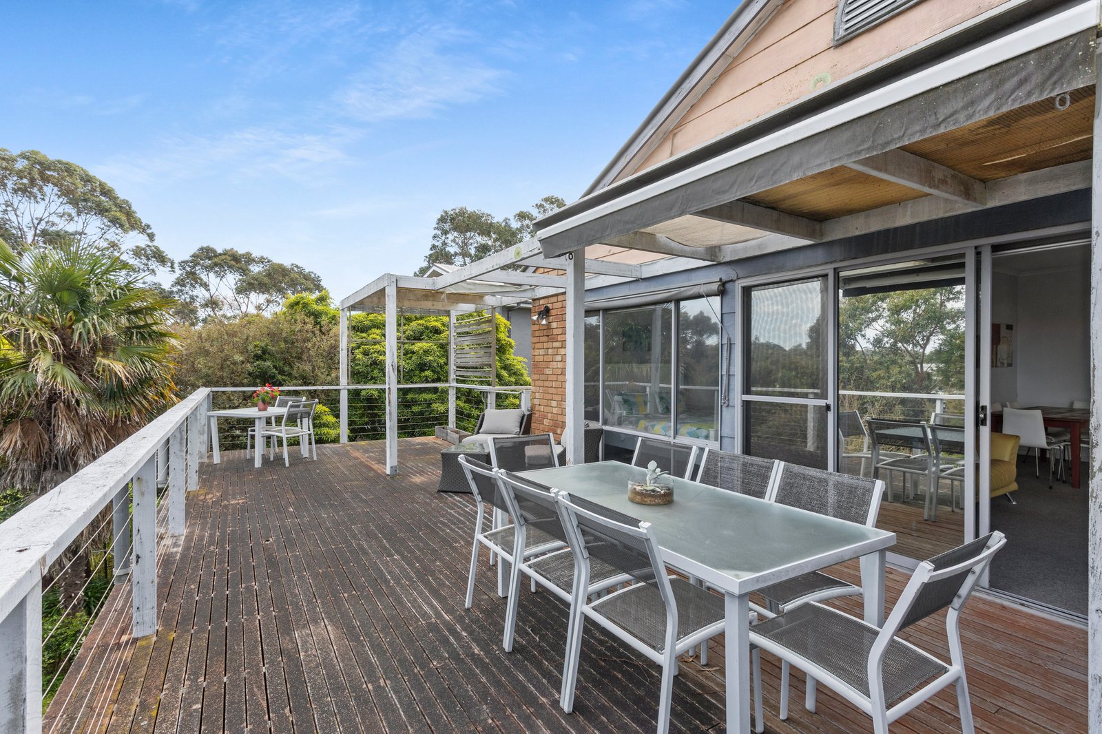 A ramped approach divides to either the main entry or the upper deck, revealing a multi-level residence defined by wide views across Western Port Bay to the tip of Flinders. The upper level accommodates everyday living with a functional kitchen and lounge extending to the deck, where remote blinds temper the afternoon light and pastel skies set a serene backdrop for evening gatherings as the sun dips across the water.