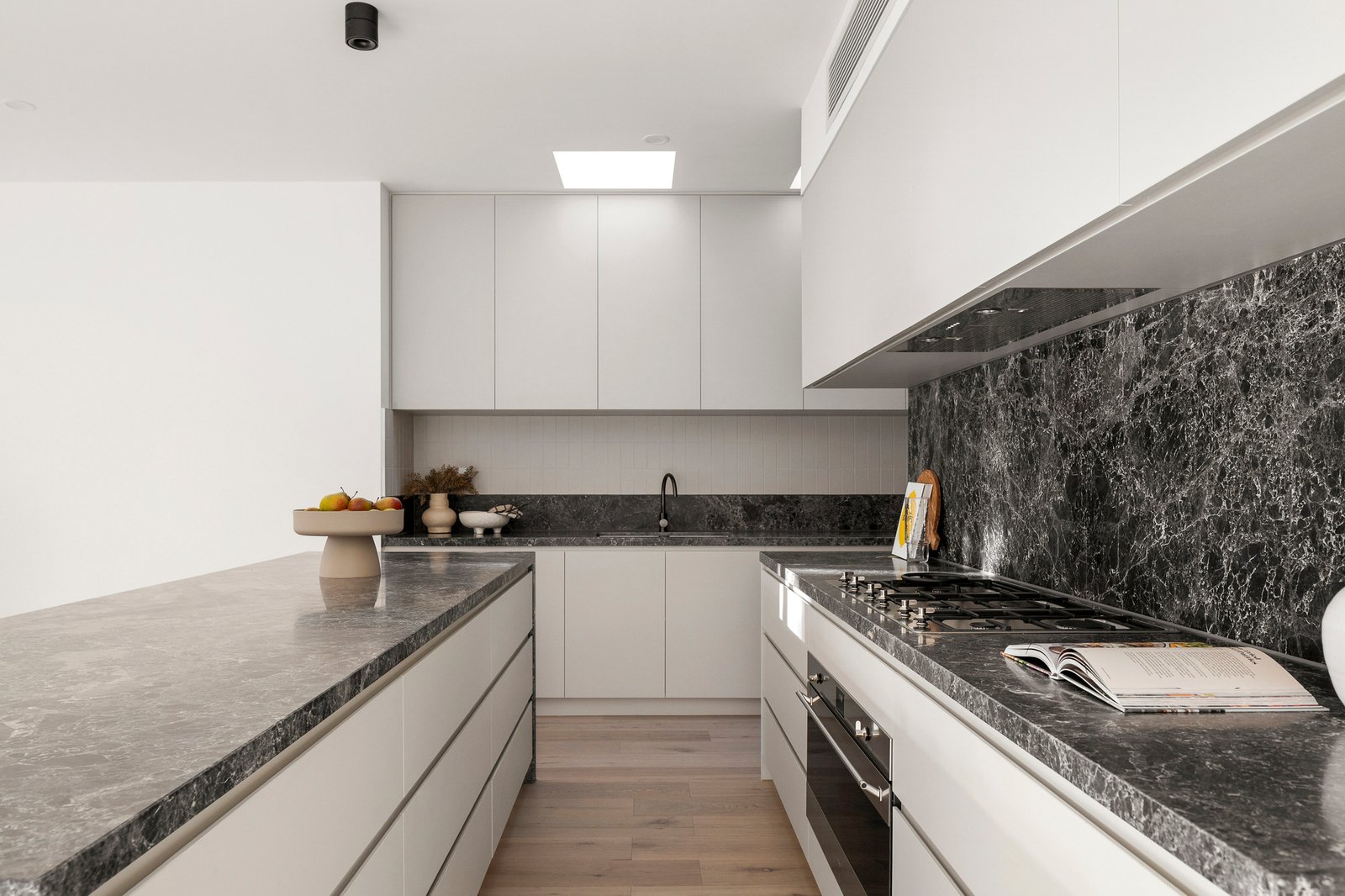 Bursting open into the glorious sunshine, the expansive entertaining area wraps a stunning kitchen flaunting premium Smeg appliances, masses of storage - including a walk-in pantry area - and luxe marble surfaces waterfalling to the chic oak floors. Two banks of sliding doors retract to connect indoors with the sundrenched north-to-west alfresco deck boasting a built-in BBQ and stone preparation area with sink – this zone looks out across the landscaped garden.