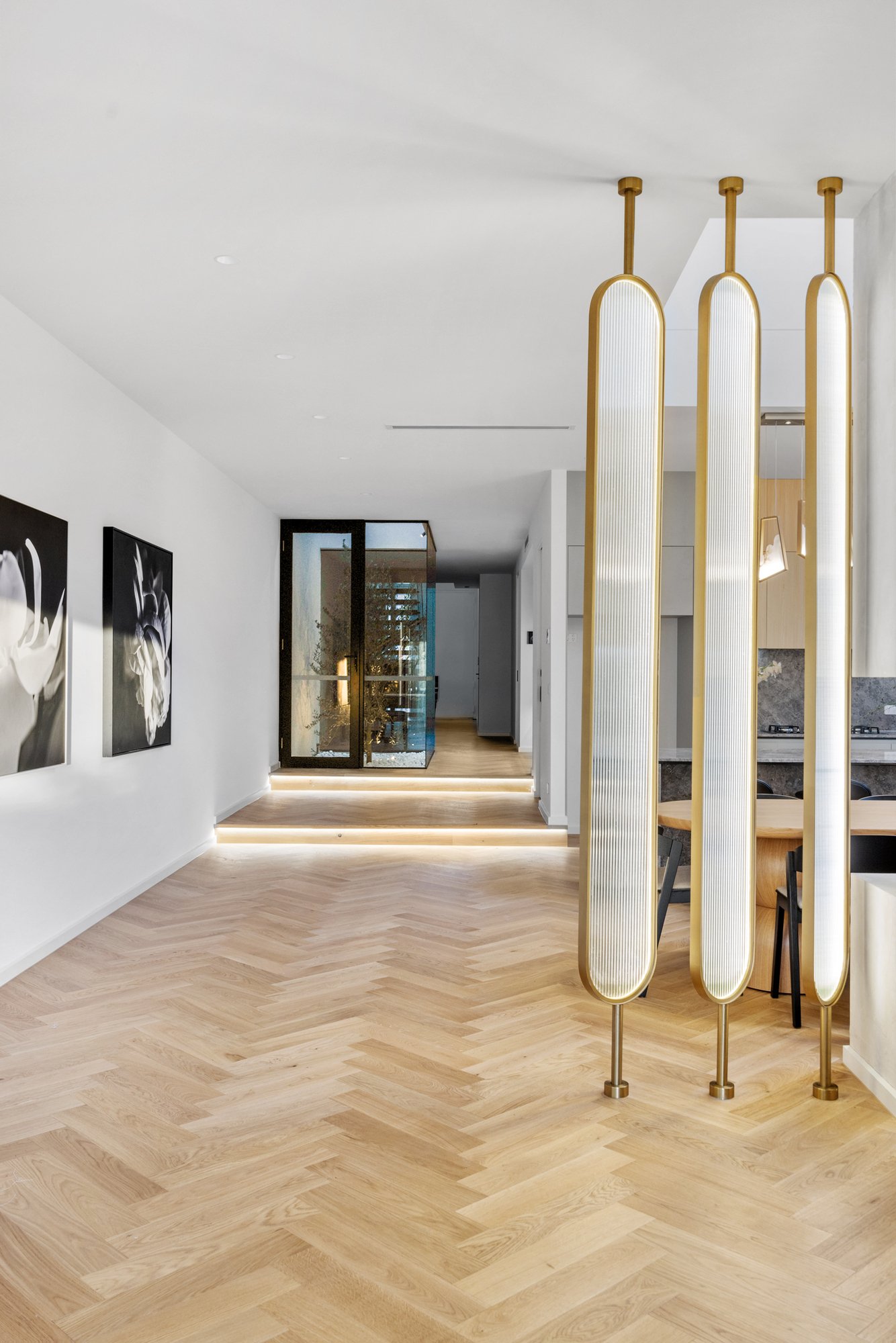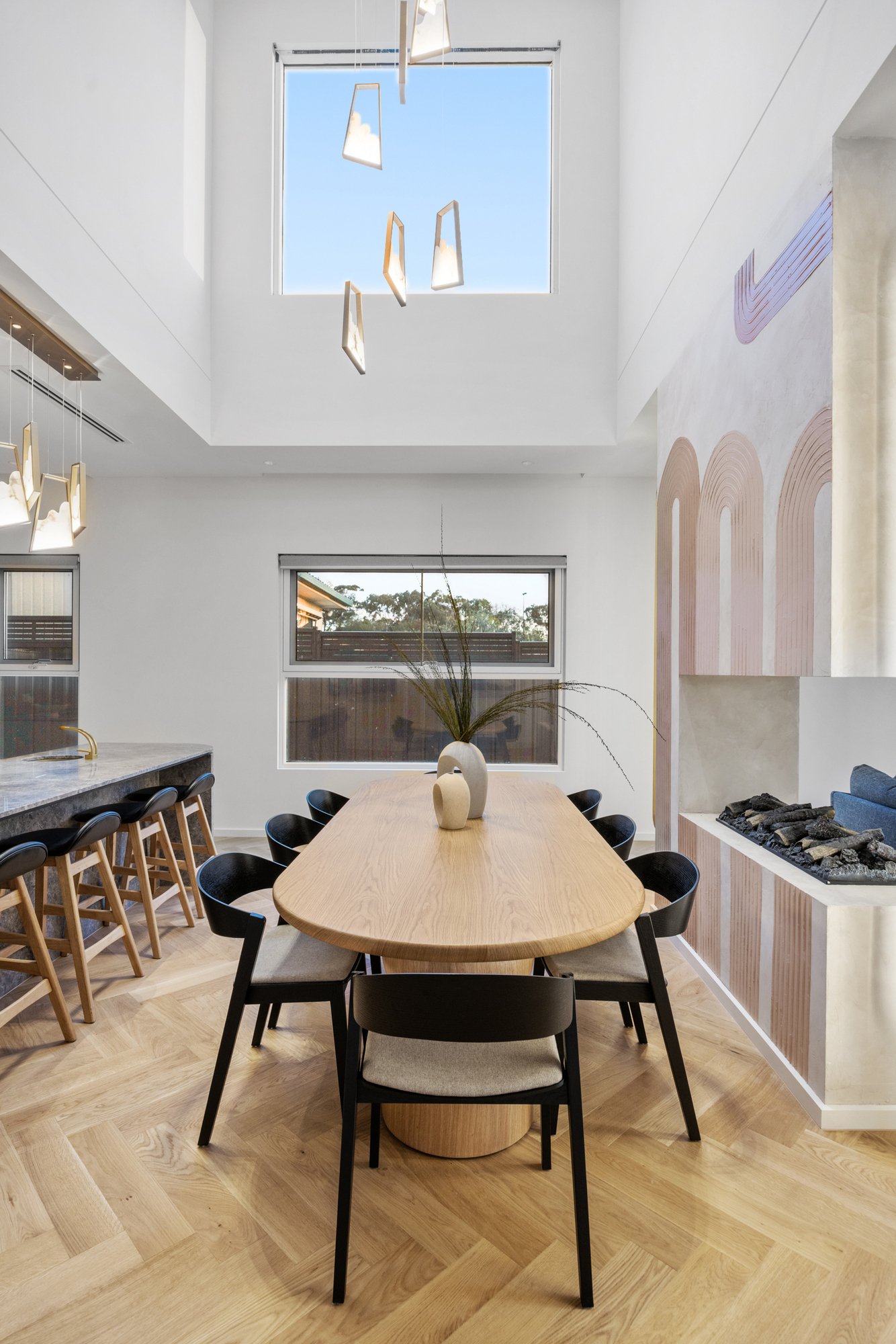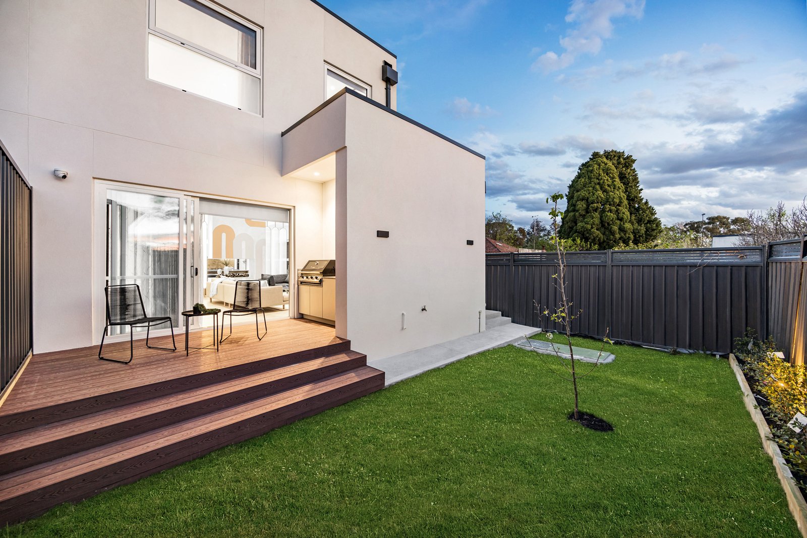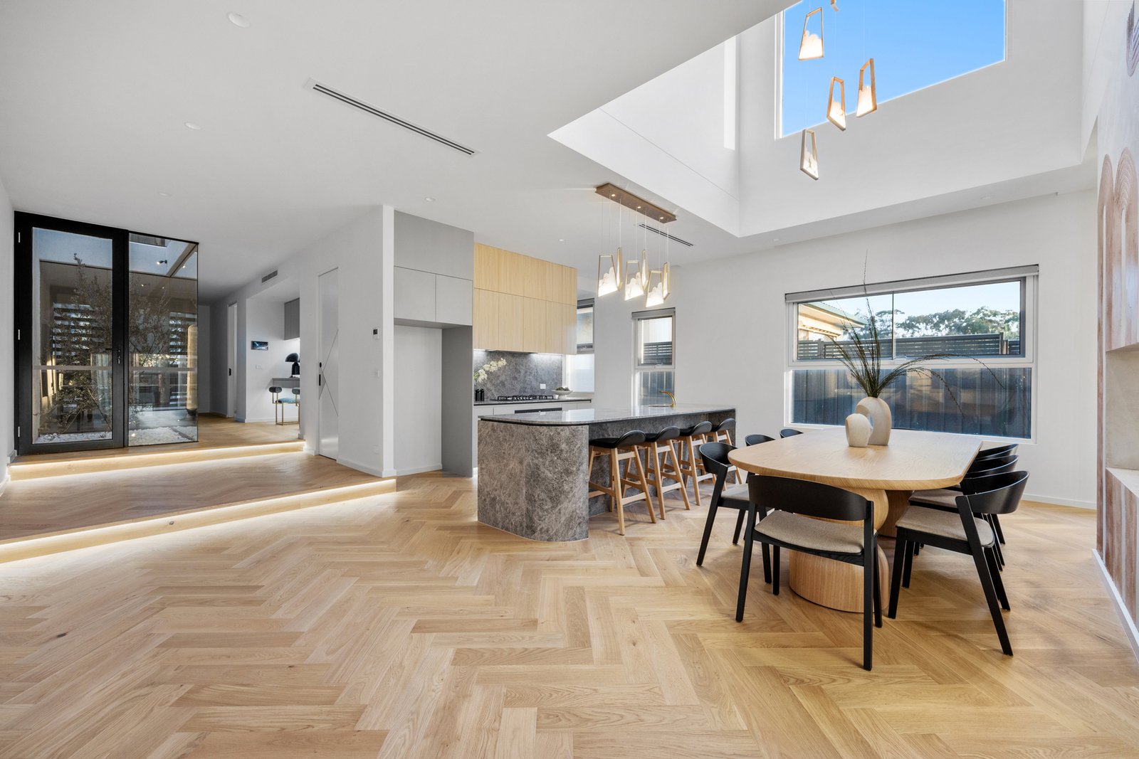 Tucked away in the heart of Glen Iris, this modern family townhouse exemplifies luxury, light and design precision across two beautifully appointed levels. Behind its secure entry, the home unfolds into an elegant open-plan living and dining zone divided by a two-way fireplace, enriched by hardwood parquetry flooring and soaring 3-metre ceilings. A dramatic dining void floods the space with light, anchored by a chandelier. Stepping outside, sliding doors connect effortlessly to the rear alfresco with built-in BBQ, outdoor sink and a low-maintenance garden - perfect for entertaining or family relaxation.