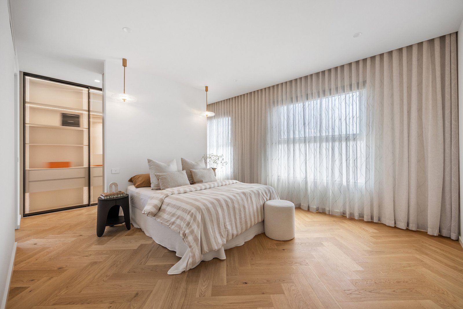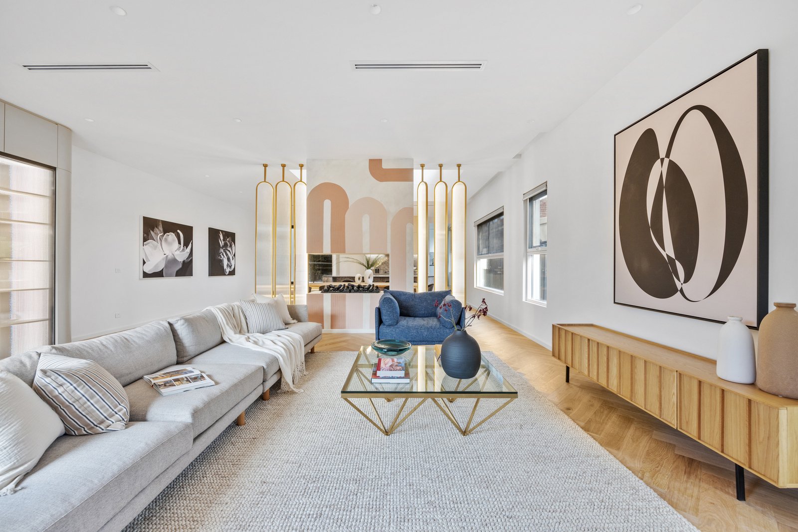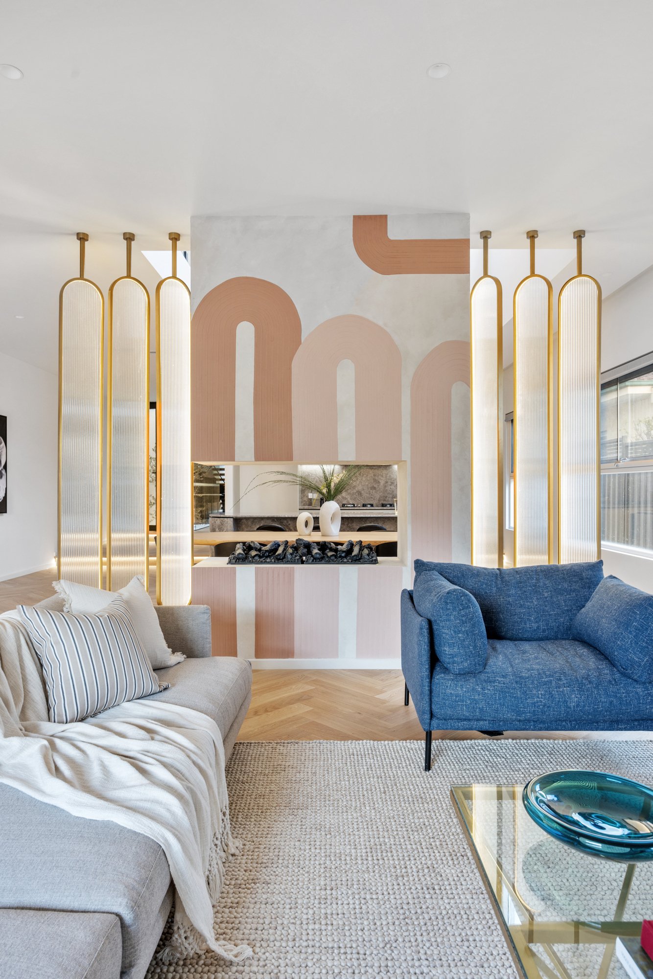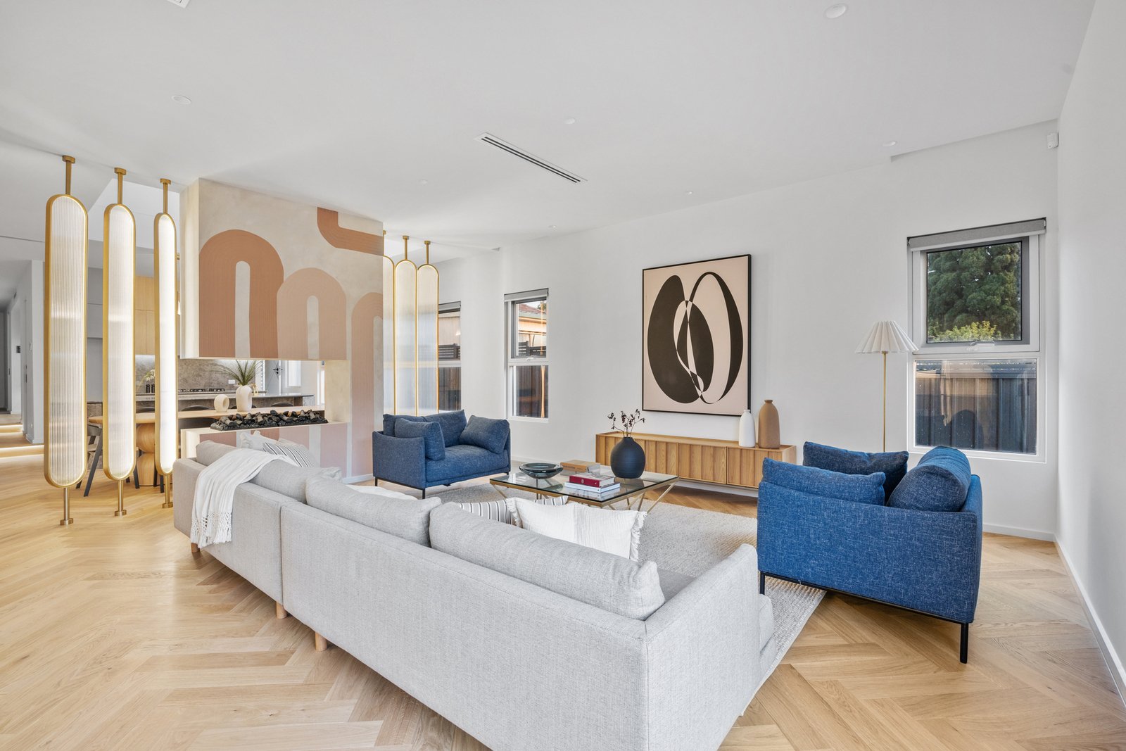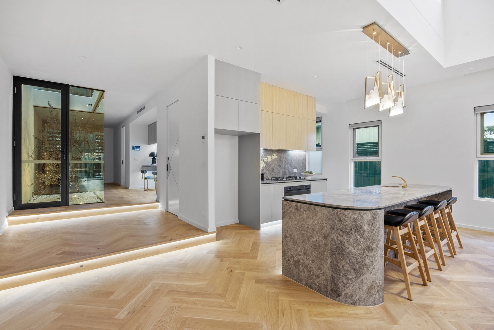 The kitchen is a statement in style and functionality, featuring natural stone benchtops and splashback, a SMEG 900mm electric oven and gas cooktop, curved island bench with waterfall ends, and a fully equipped butler’s pantry with a dishwasher. Behind the living room, find a tucked-away bar adding an extra touch of sophistication.