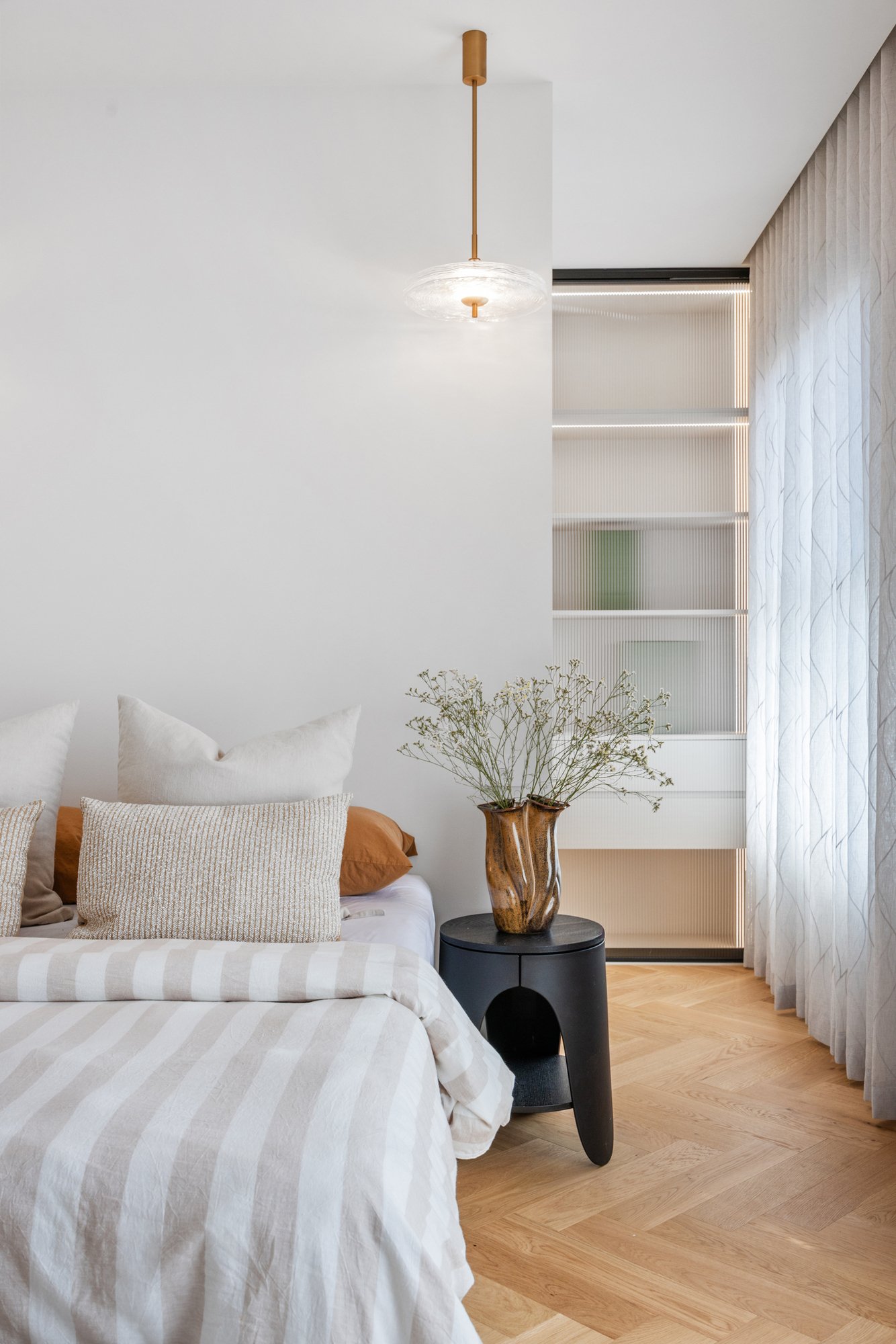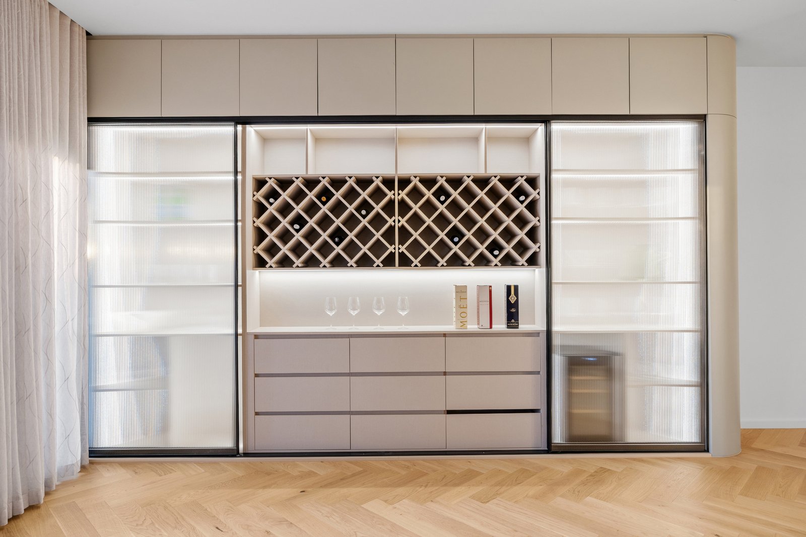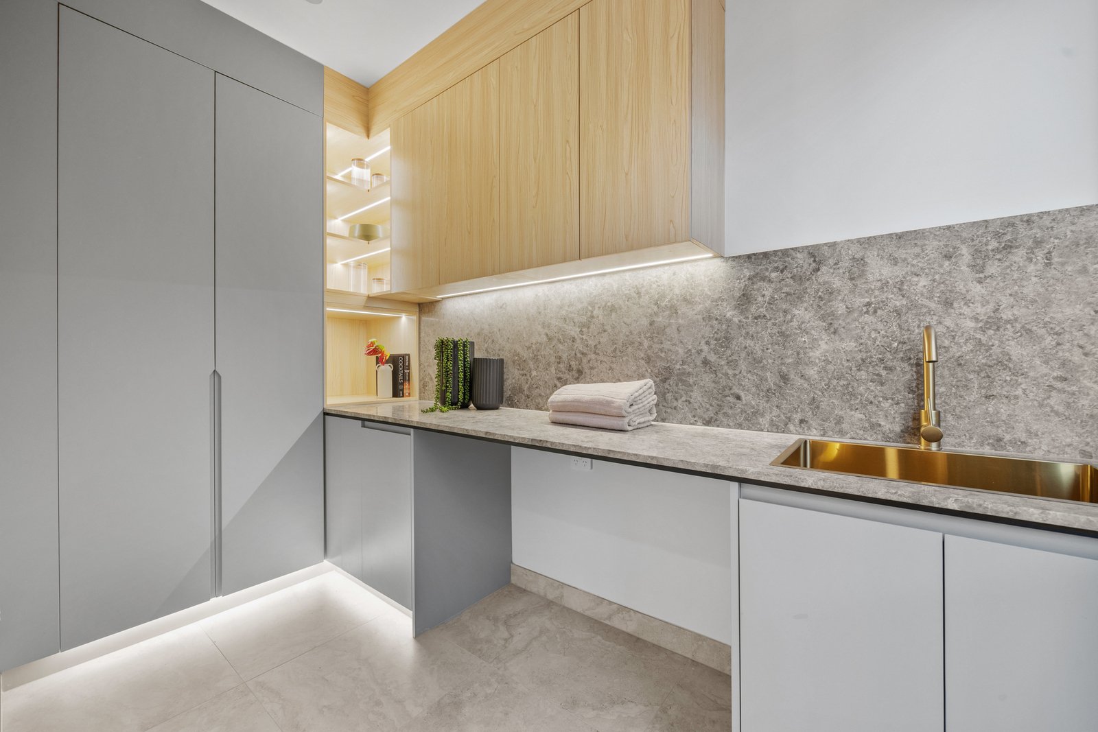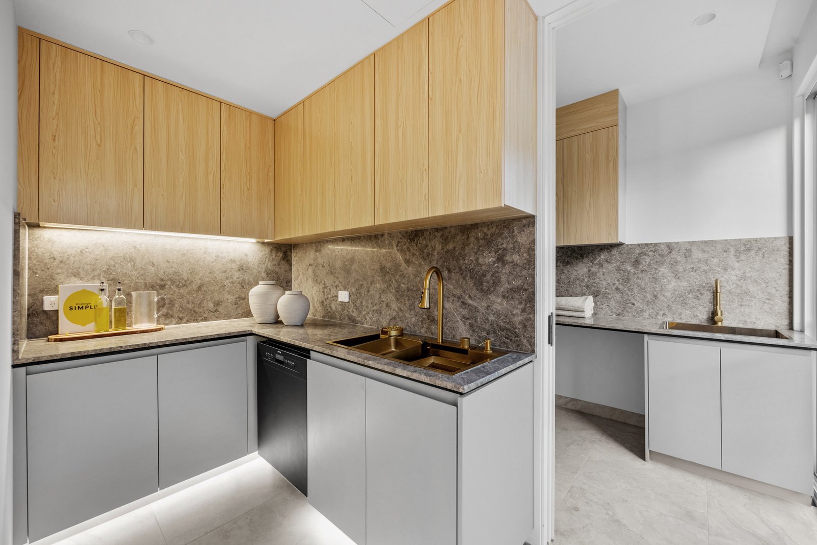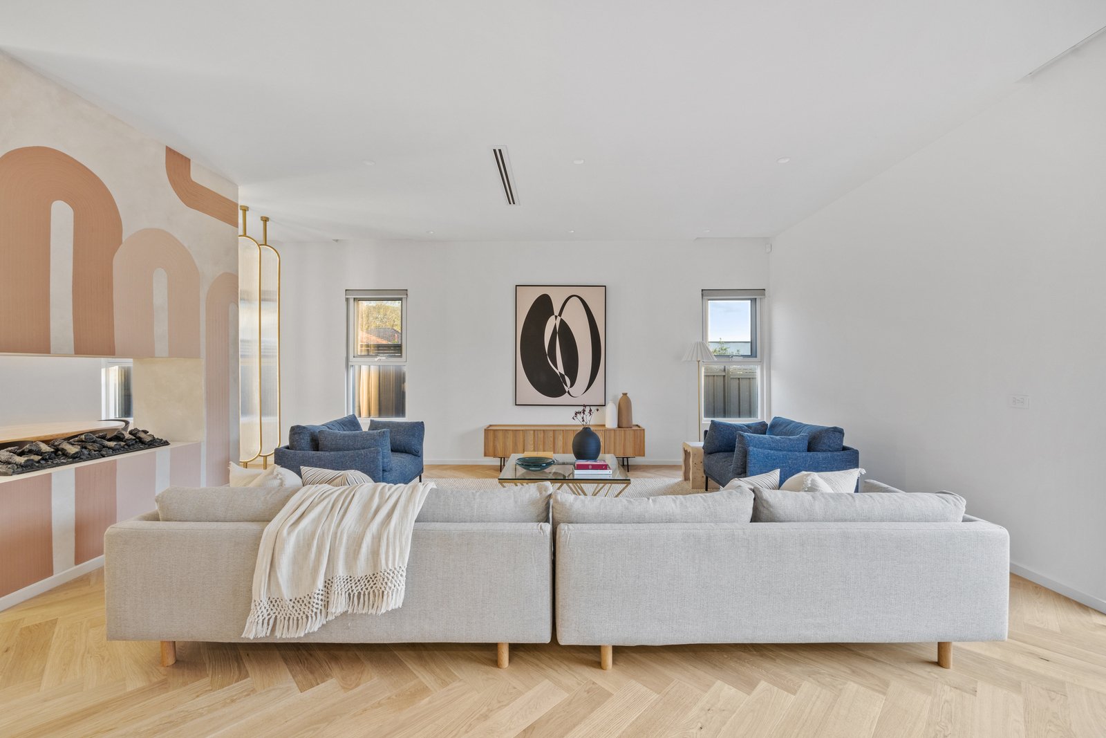 The kitchen is a statement in style and functionality, featuring natural stone benchtops and splashback, a SMEG 900mm electric oven and gas cooktop, curved island bench with waterfall ends, and a fully equipped butler’s pantry with a dishwasher. Behind the living room, find a tucked-away bar adding an extra touch of sophistication.