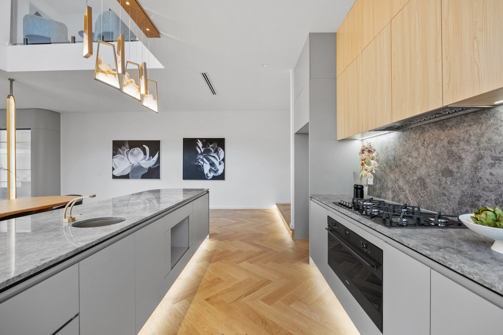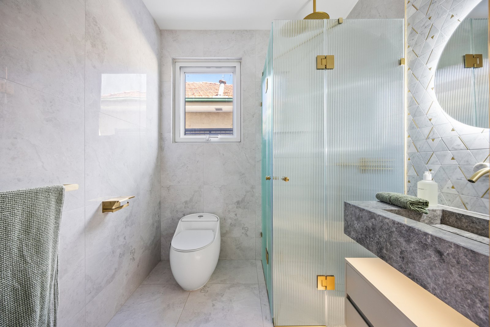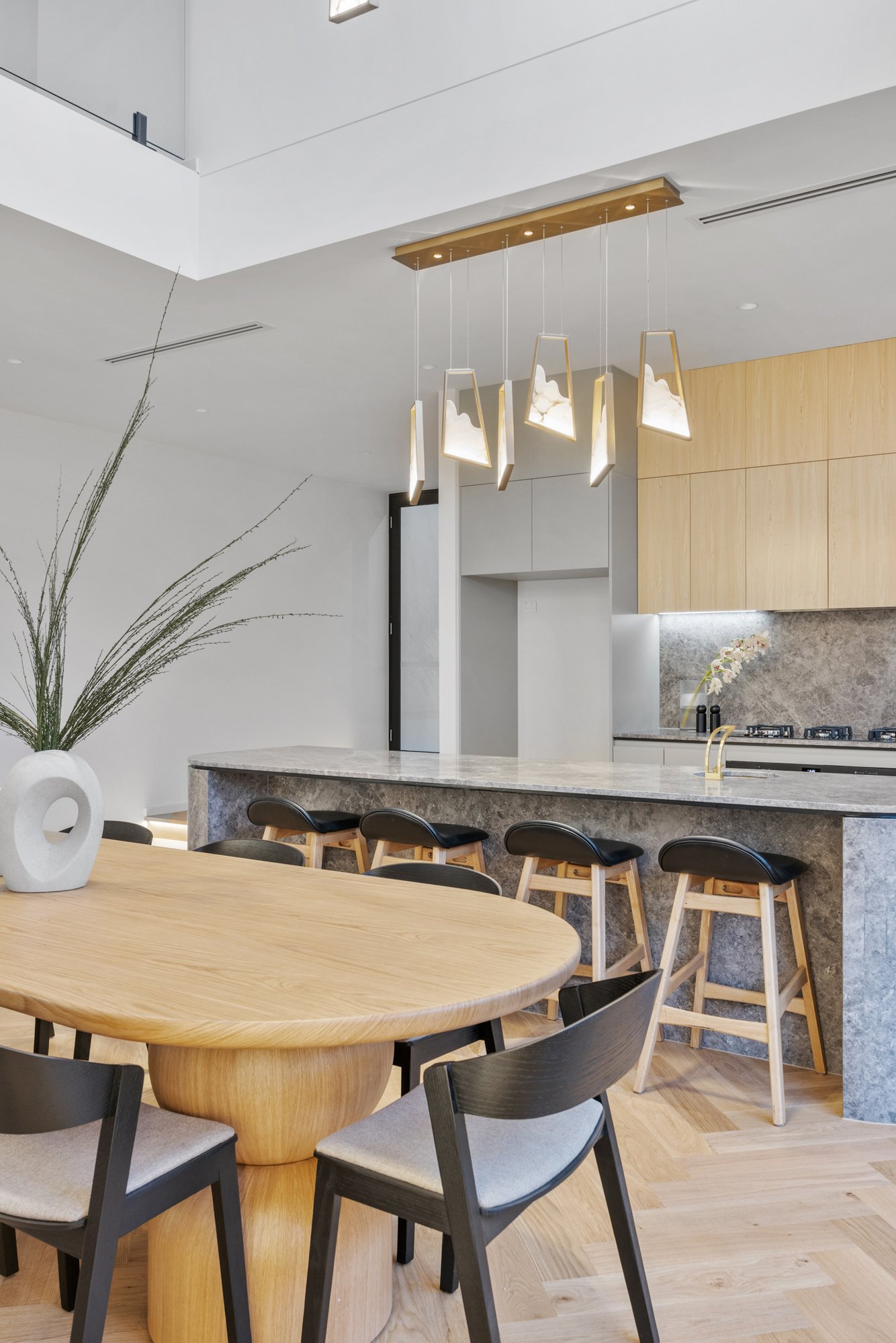 Upstairs, four generous bedrooms each enjoy their own ensuite and walk-in robe, with the master retreat offering a private balcony and freestanding bathtub. Bathrooms are finished with imported floor-to-ceiling tiles, natural stone vanities with feature lighting, brass fittings and frameless fluted glass shower screens.