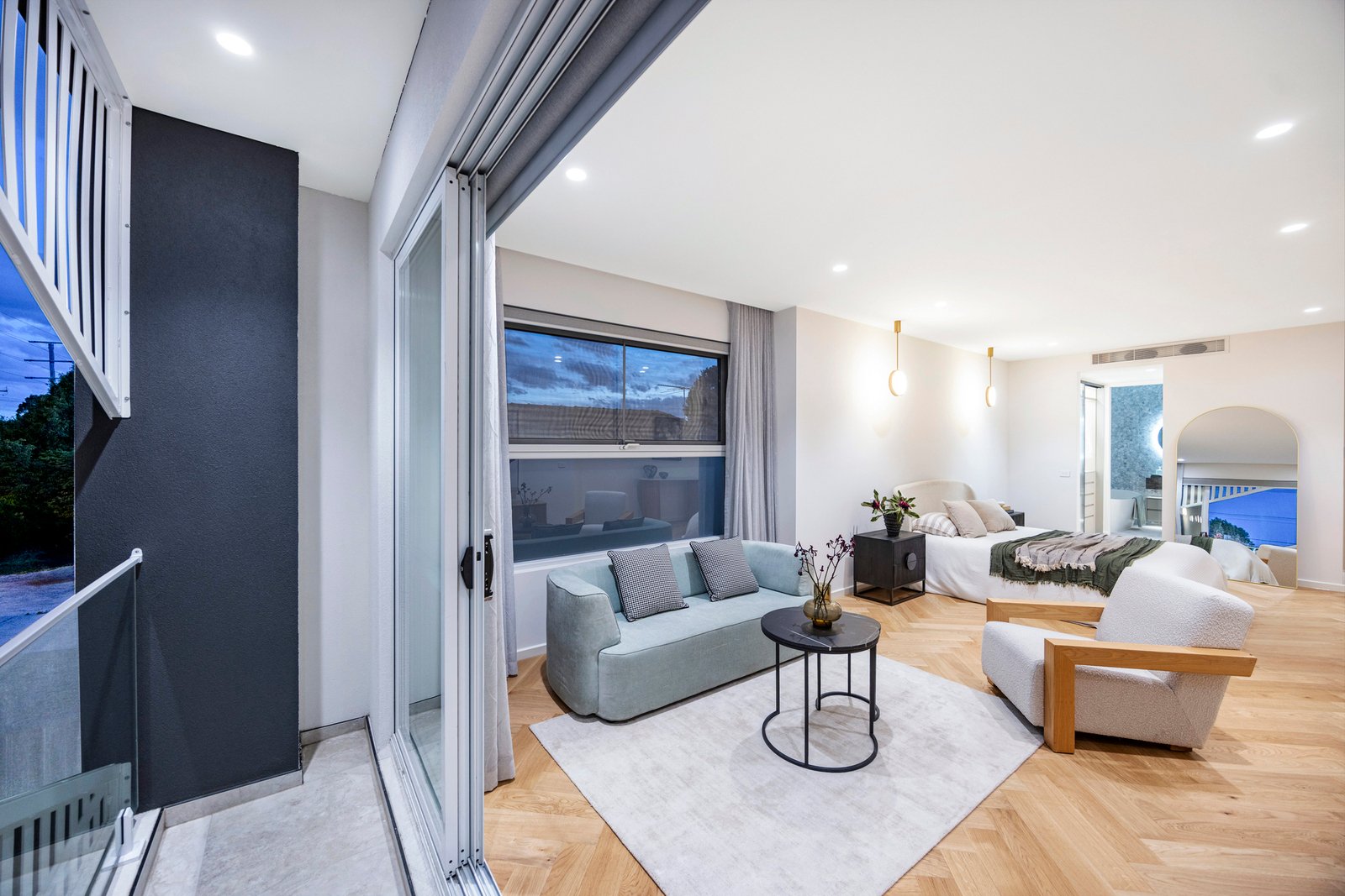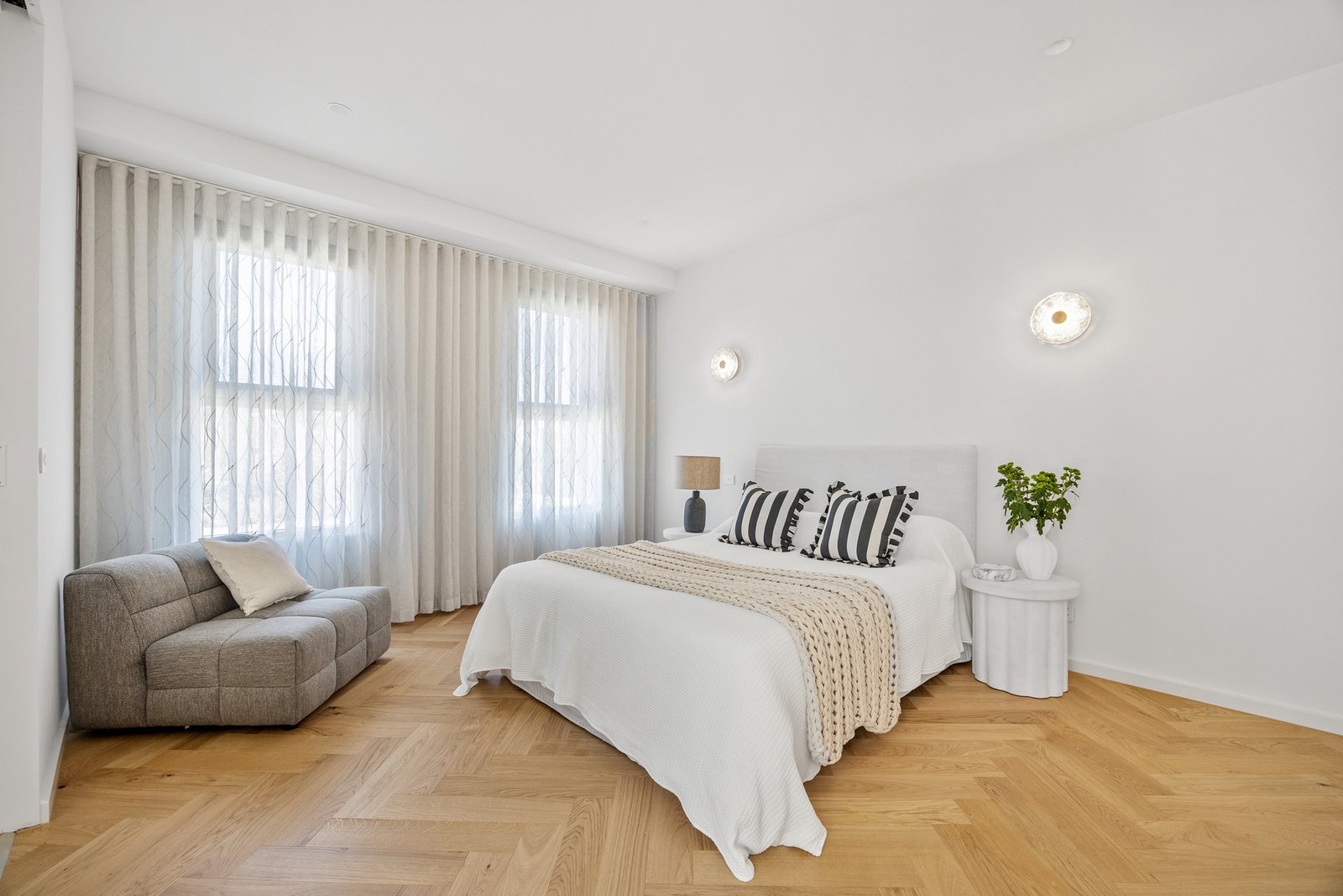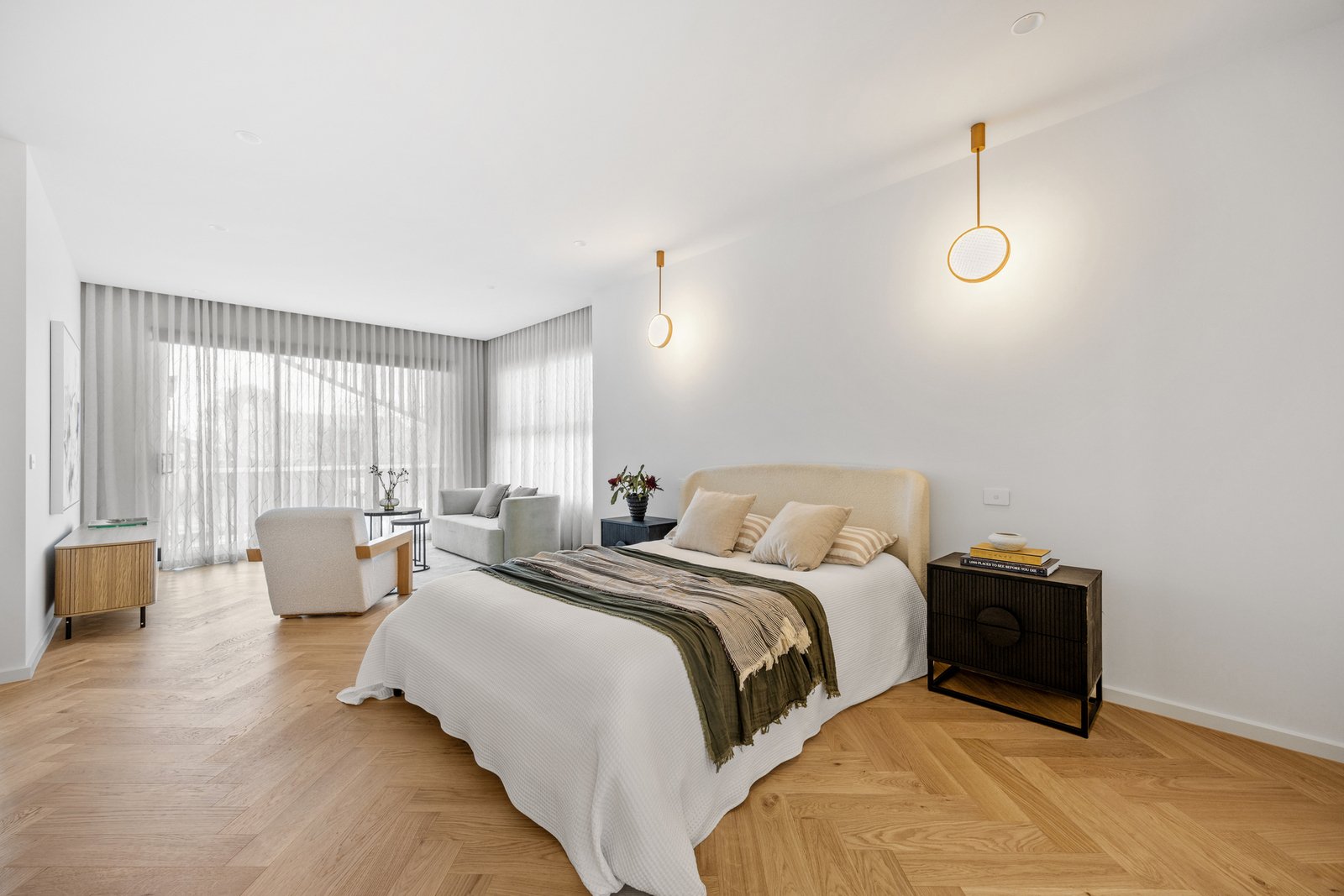 Upstairs, four generous bedrooms each enjoy their own ensuite and walk-in robe, with the master retreat offering a private balcony and freestanding bathtub. Bathrooms are finished with imported floor-to-ceiling tiles, natural stone vanities with feature lighting, brass fittings and frameless fluted glass shower screens.