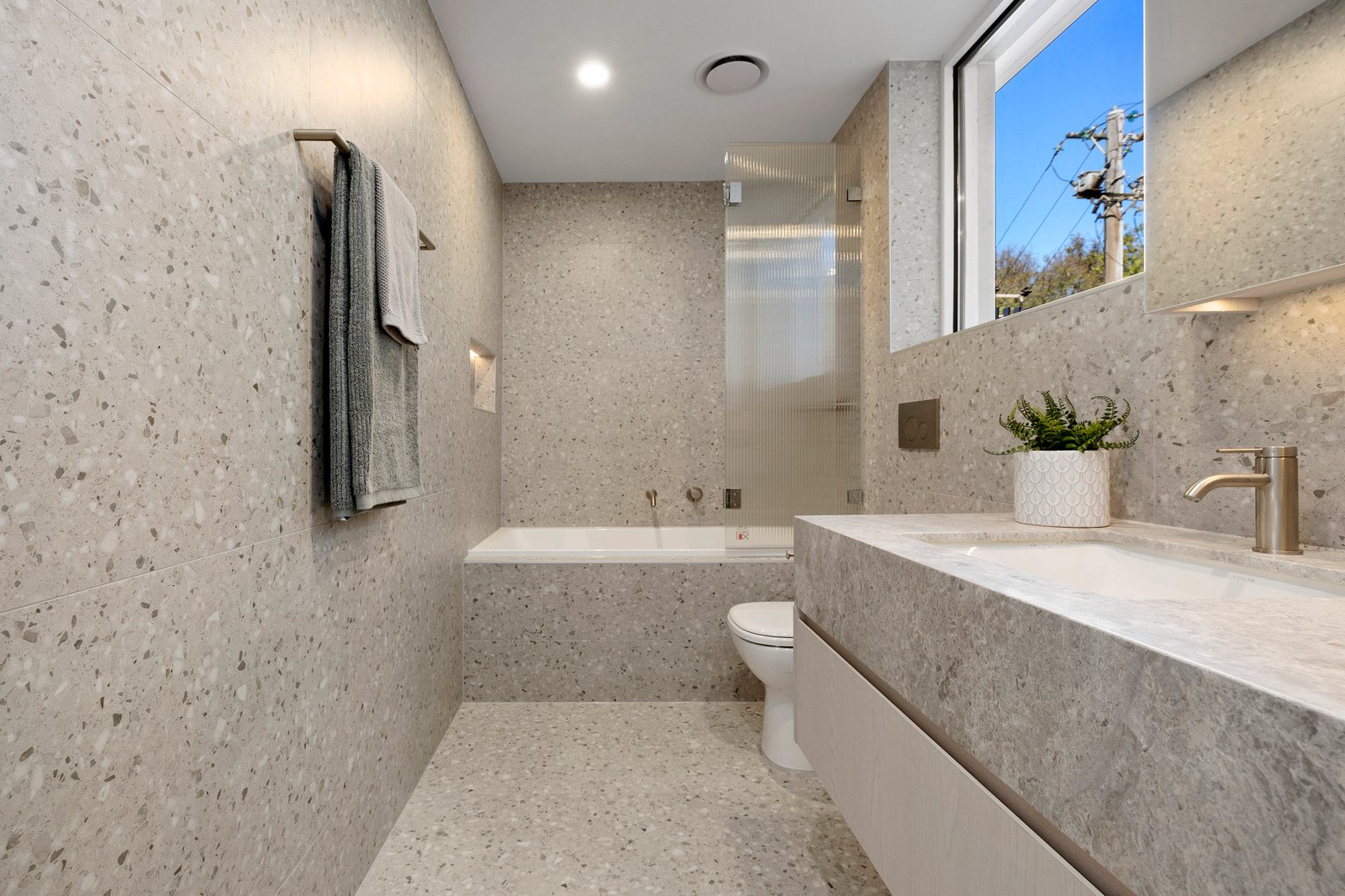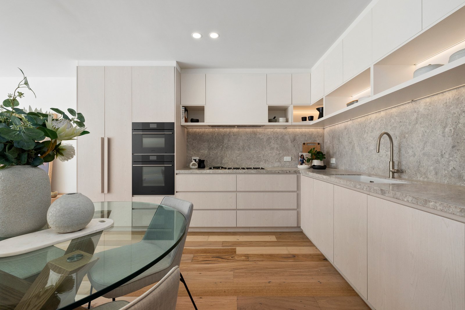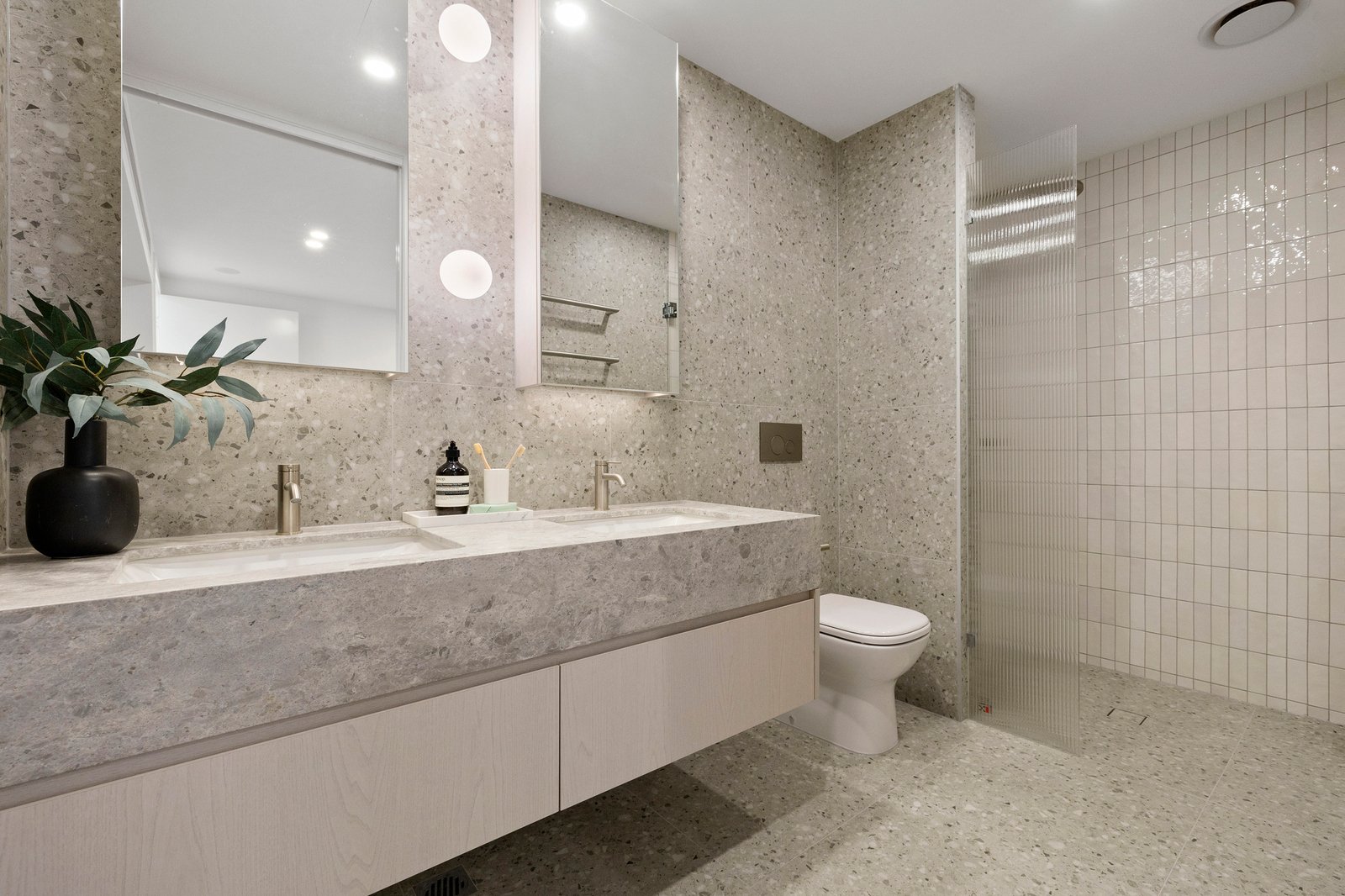 Appointed to a demanding specification with a full complement of Smeg appliances (including integrated dishwasher, traditional and combi-ovens, and a 900mm gas cooktop) for the entertainers’ kitchen, the home’s uncompromising curation includes 2-Pack cabinetry topped by natural Grey Tundra stone (even for the laundry), authentic Australian hardwood floors (with a coastal limed finish), and floor-to-ceiling terrazzo-style porcelain tiles for each bathroom.