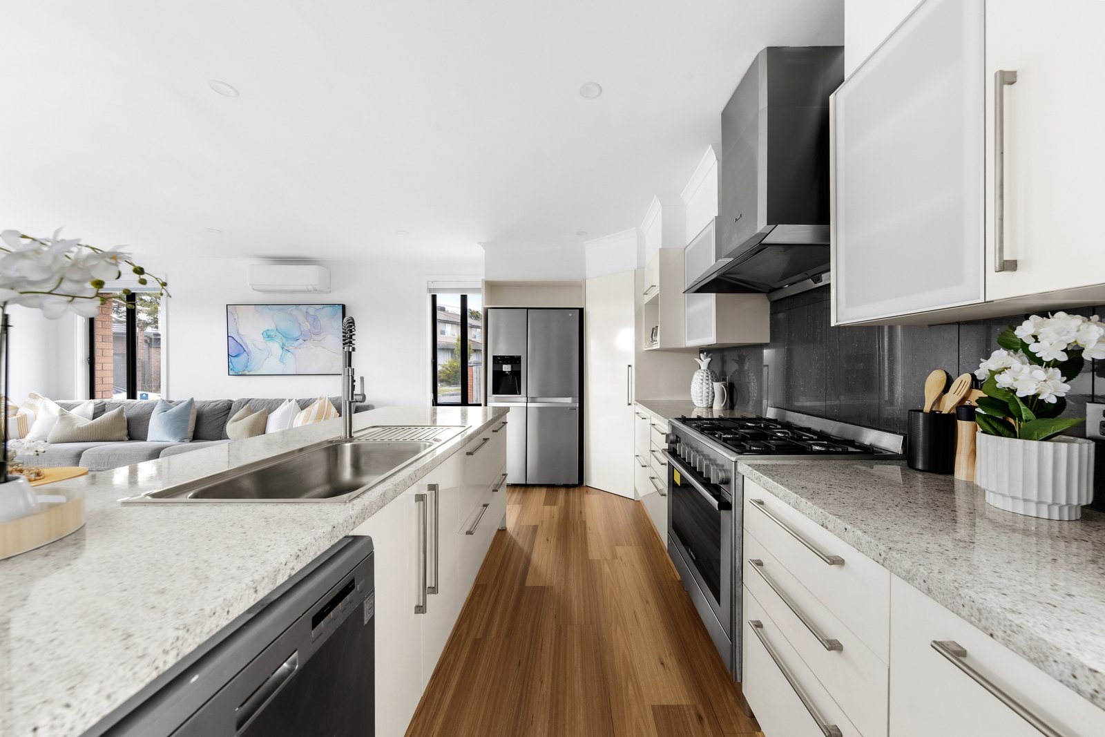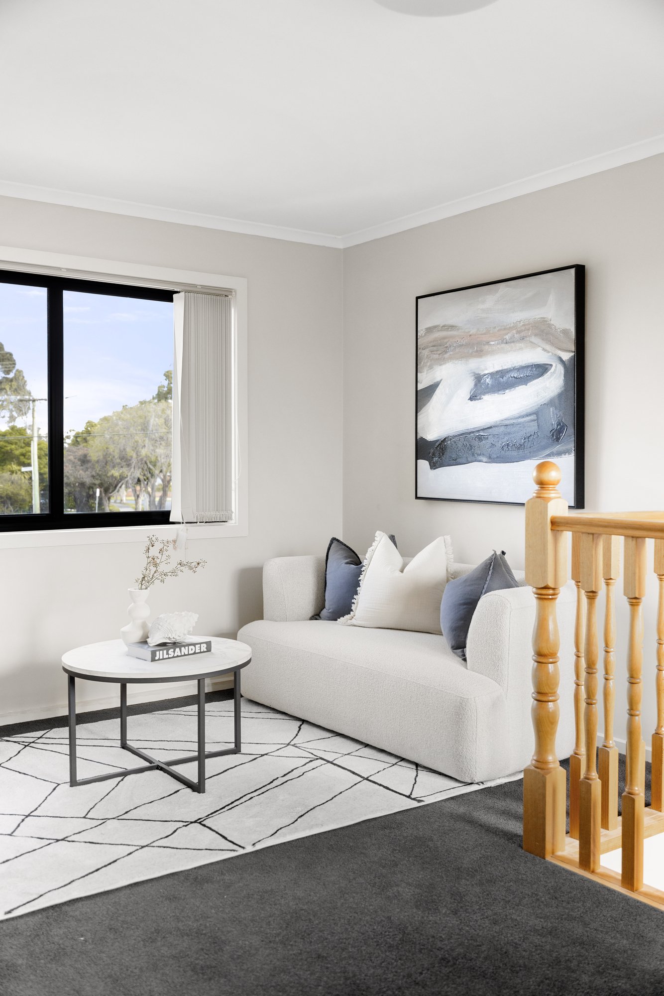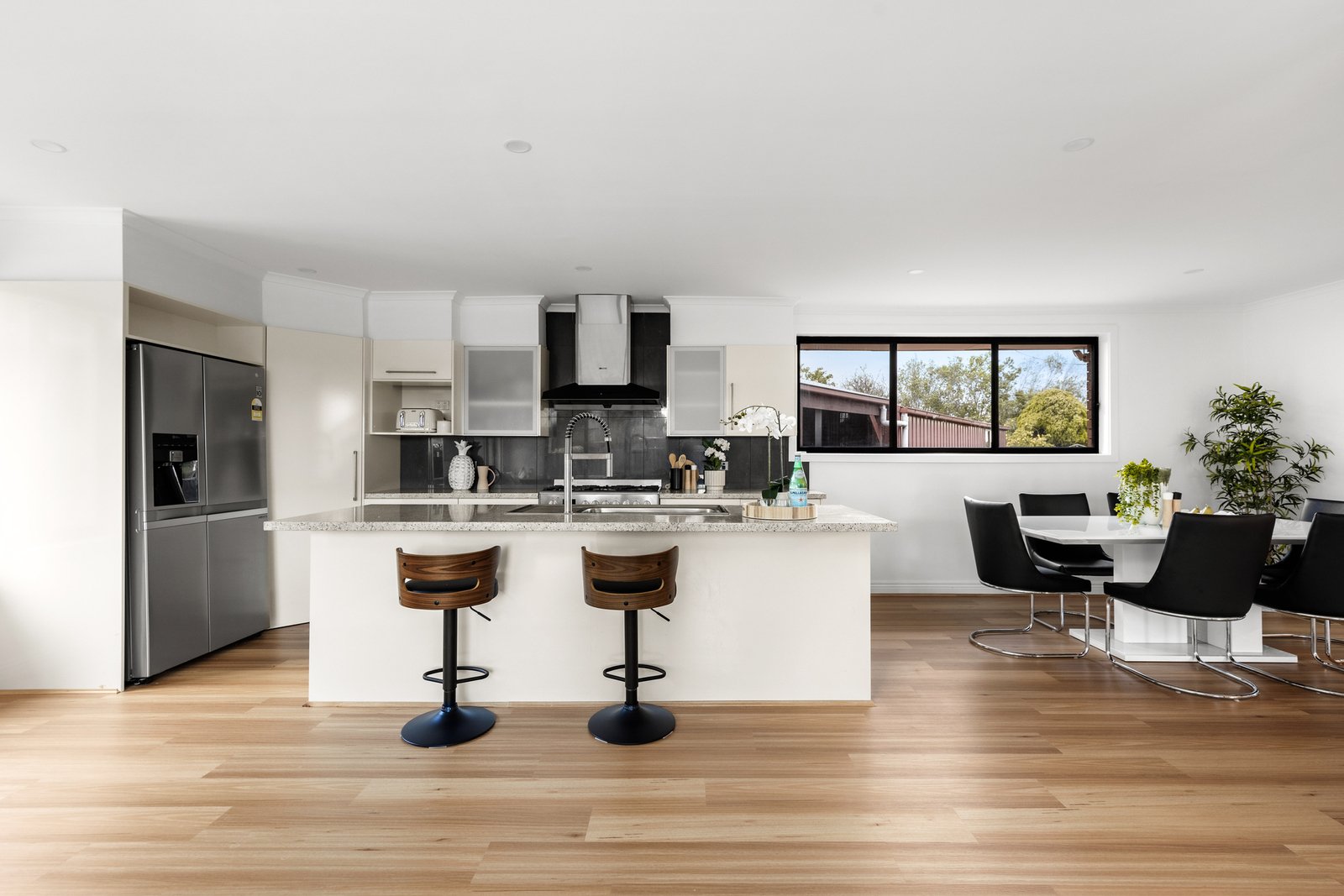 The ground floor reveals light-filled living and dining areas enhanced by crisp white interiors and plush new carpets, while the contemporary kitchen takes centre stage with its sleek finishes, quality appliances, and ample storage. Flowing seamlessly from the main living area, the undercover verandah offers the perfect spot for alfresco entertaining or relaxed family gatherings, overlooking a low-maintenance garden.