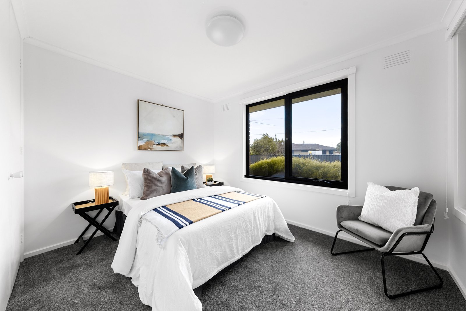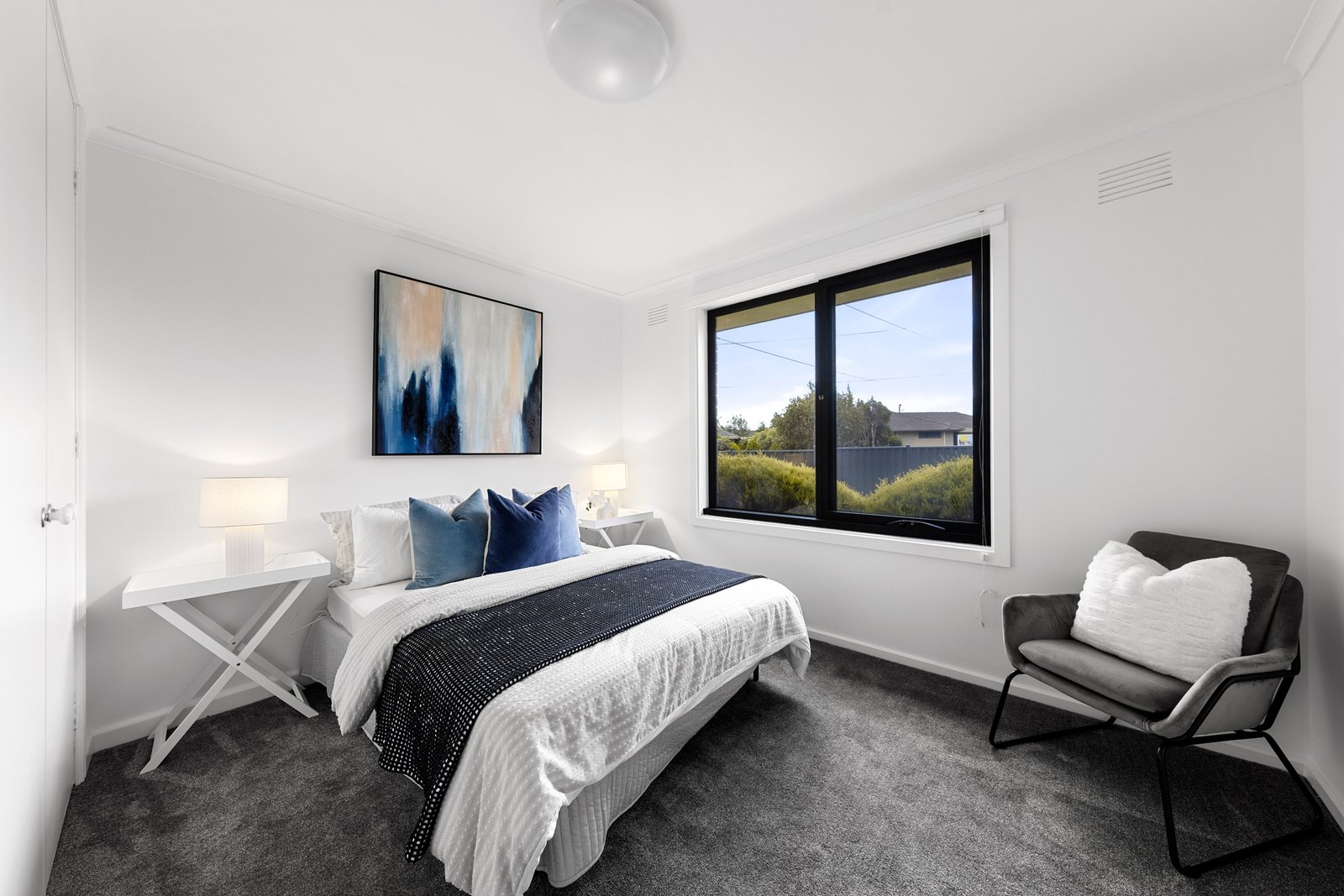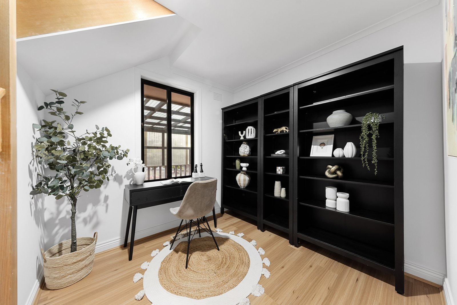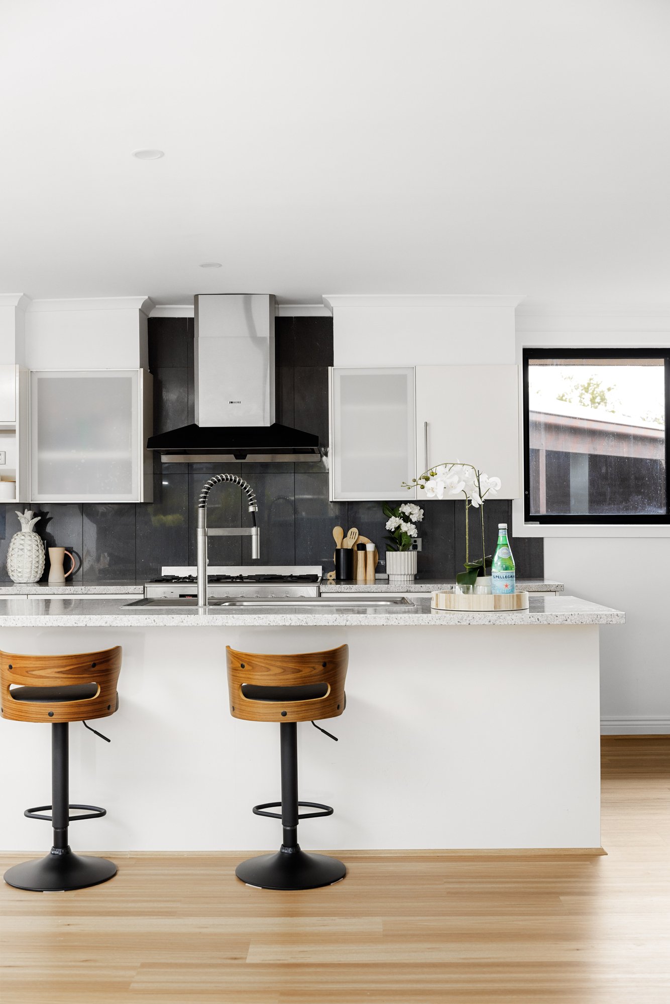 The ground floor reveals light-filled living and dining areas enhanced by crisp white interiors and plush new carpets, while the contemporary kitchen takes centre stage with its sleek finishes, quality appliances, and ample storage. Flowing seamlessly from the main living area, the undercover verandah offers the perfect spot for alfresco entertaining or relaxed family gatherings, overlooking a low-maintenance garden.