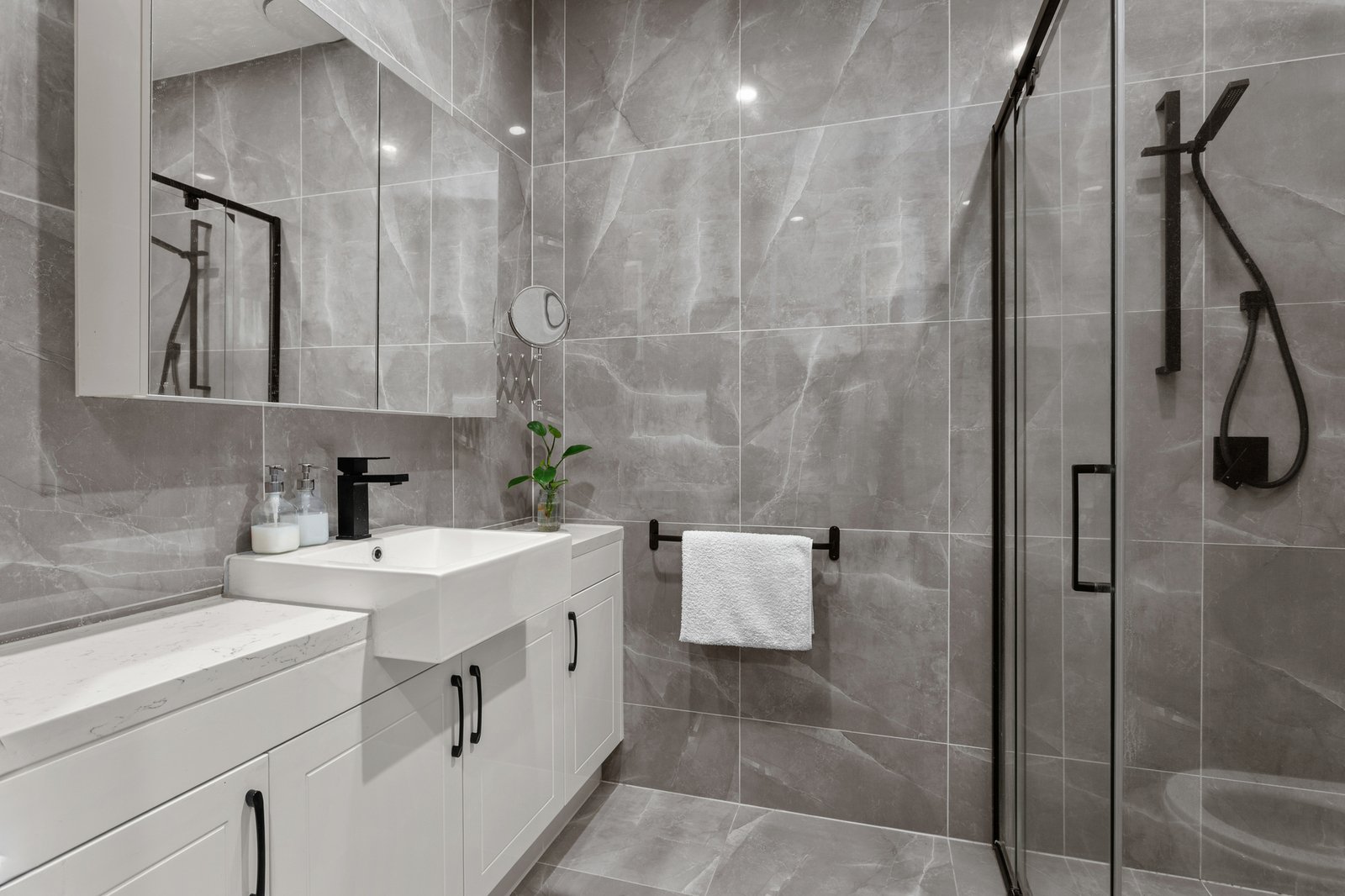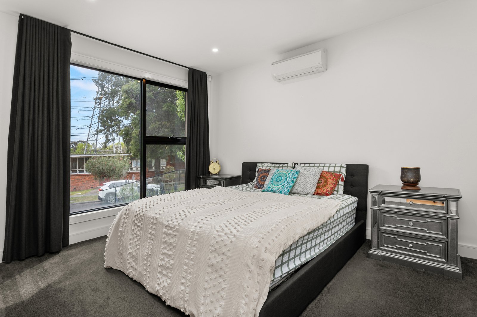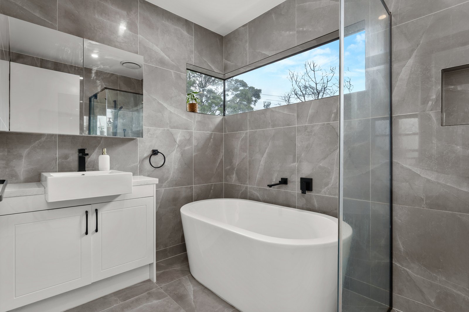 The ground-floor main bedroom includes a walk-in robe and ensuite, while two additional robed bedrooms are serviced by a luxurious fully tiled bathroom with a freestanding tub.