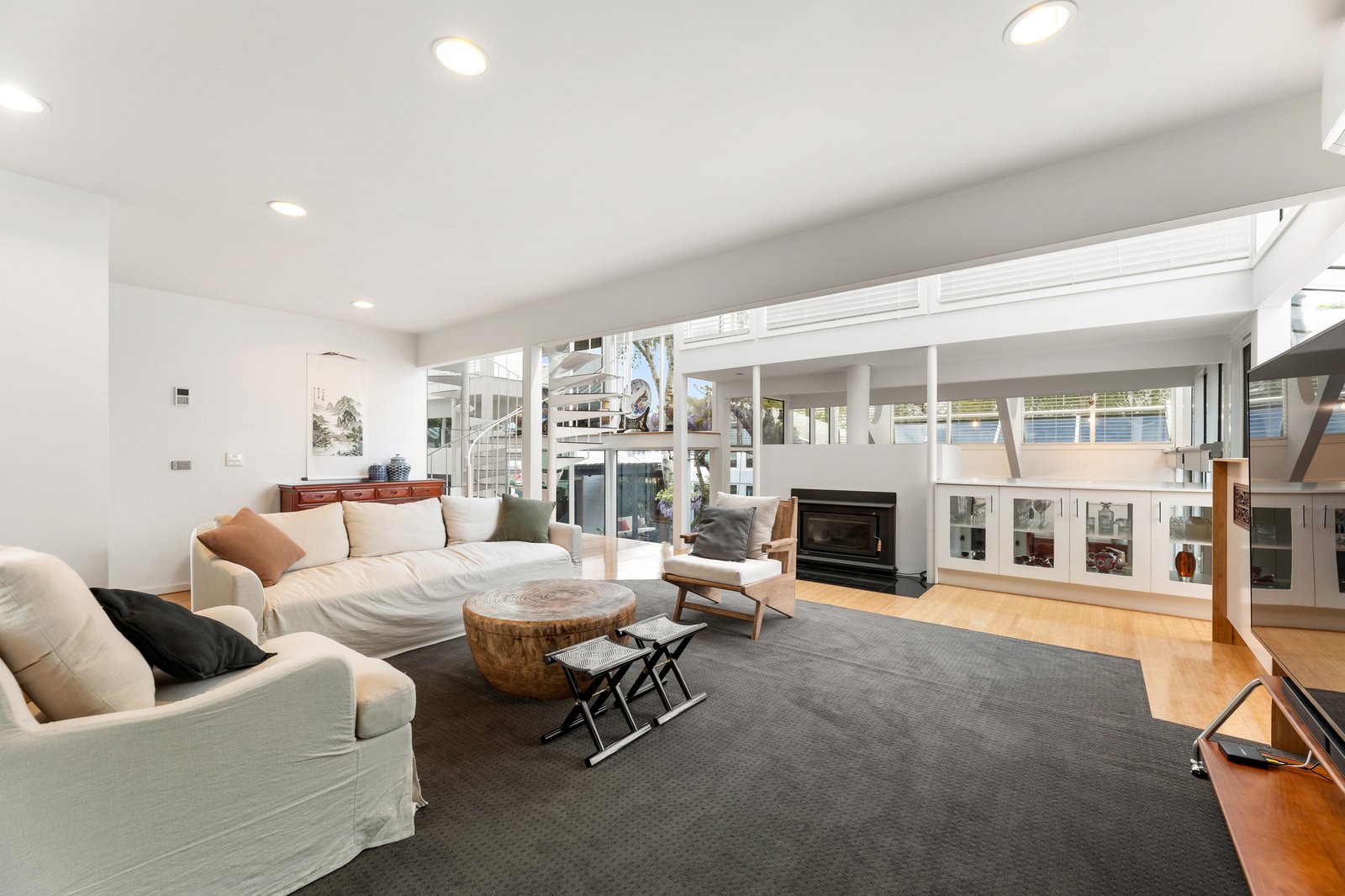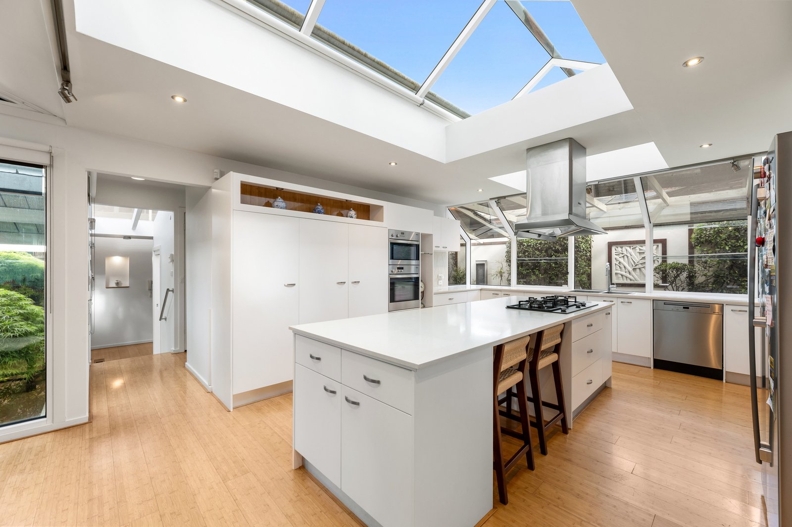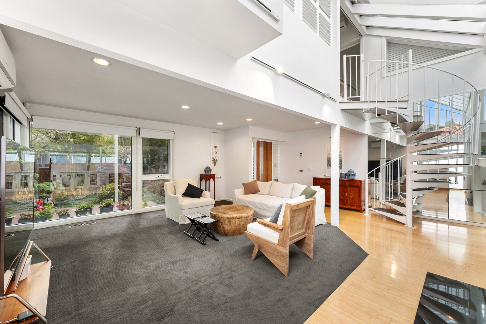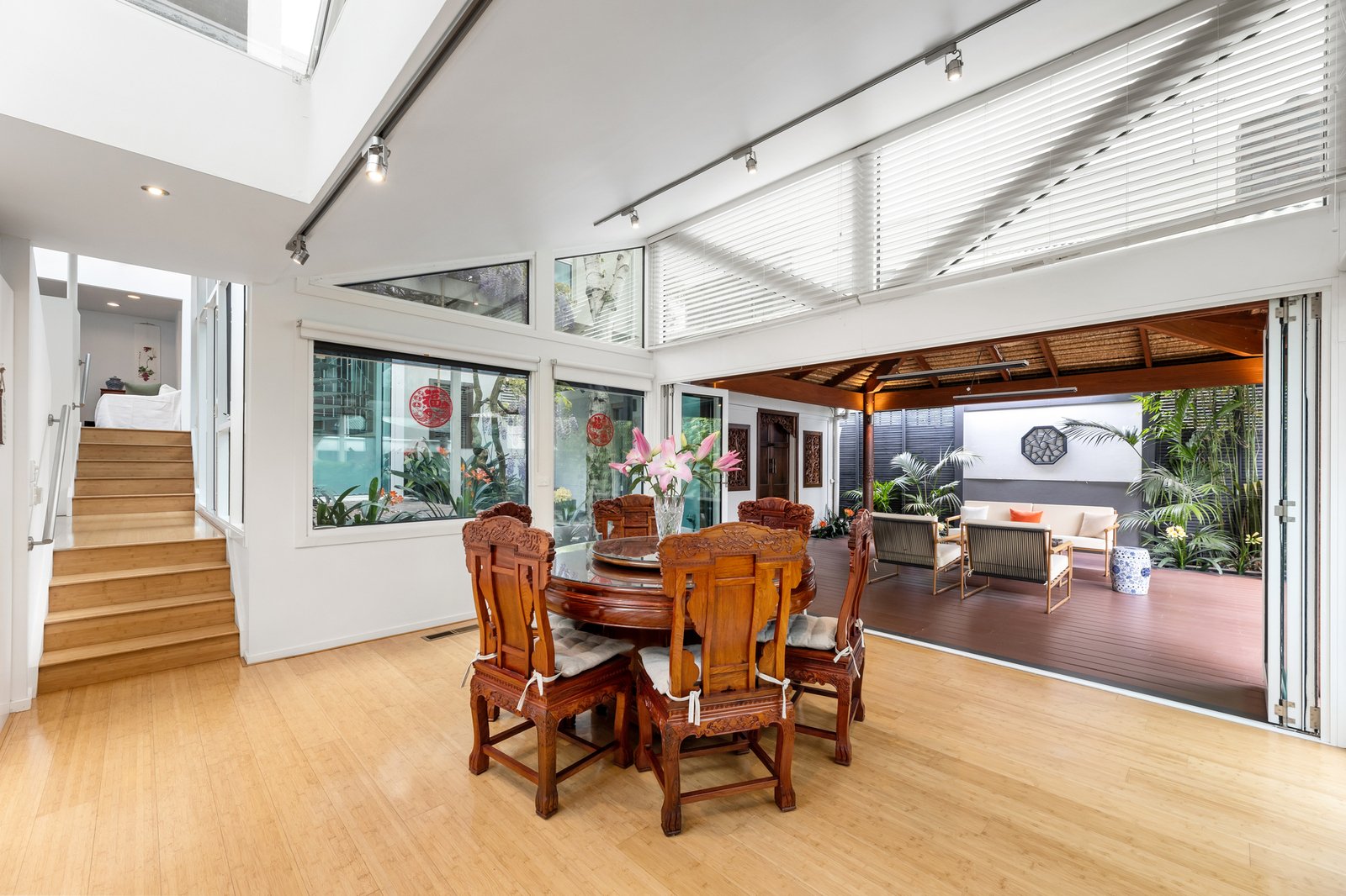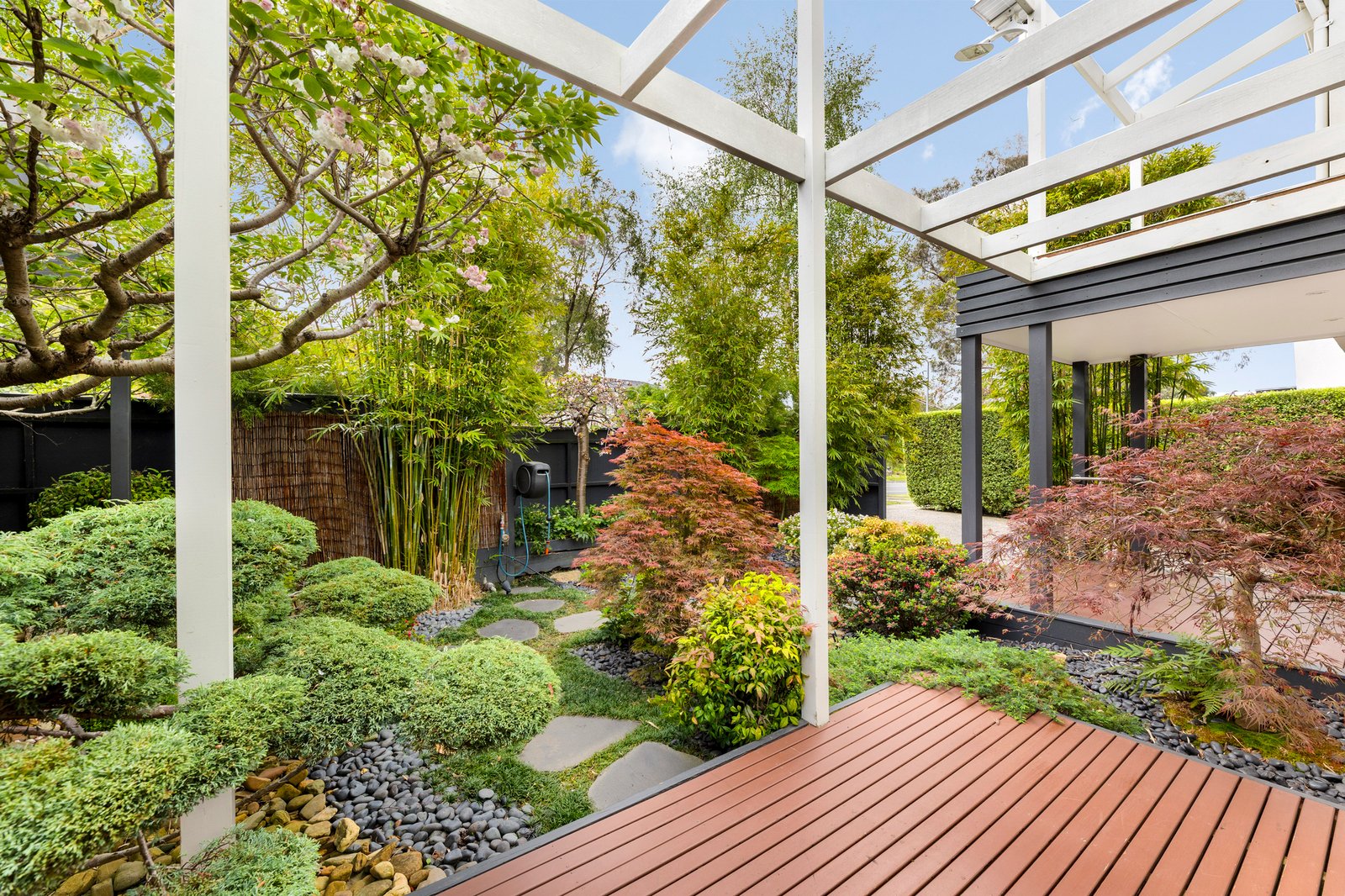Dramatic ceilings and picture windows welcome glorious light into the soaring levels of the signature abode. Golden bamboo floors carry you through the walkways and living rooms. Clever zoning offers space in which to relax and retreat, enhanced by tranquil views of the stunning Japanese Gardens designed by bonsai master Jeff Barry of Chojo Nursery in Olinda.