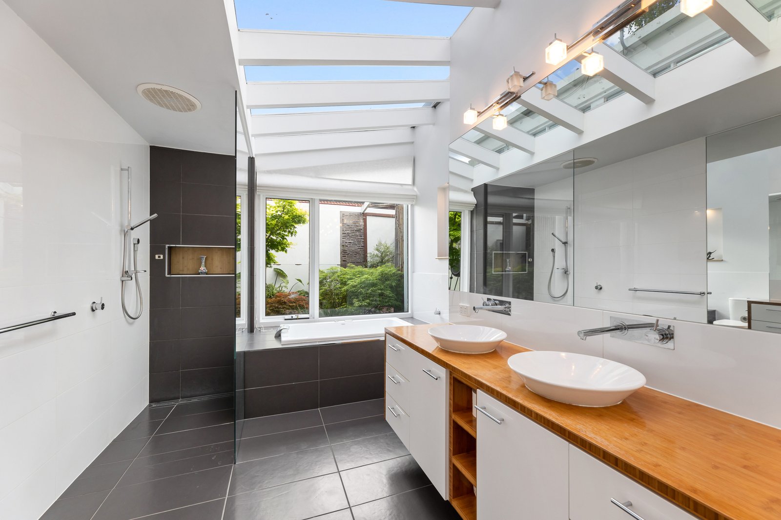 Bedrooms at either end of the home and the freedom of 3 bathrooms provide the utmost privacy for the family, and for guests. A spectacular sloping glass roof from the top level ensuite transforms The Dandenong Ranges into a postcard perfect view.