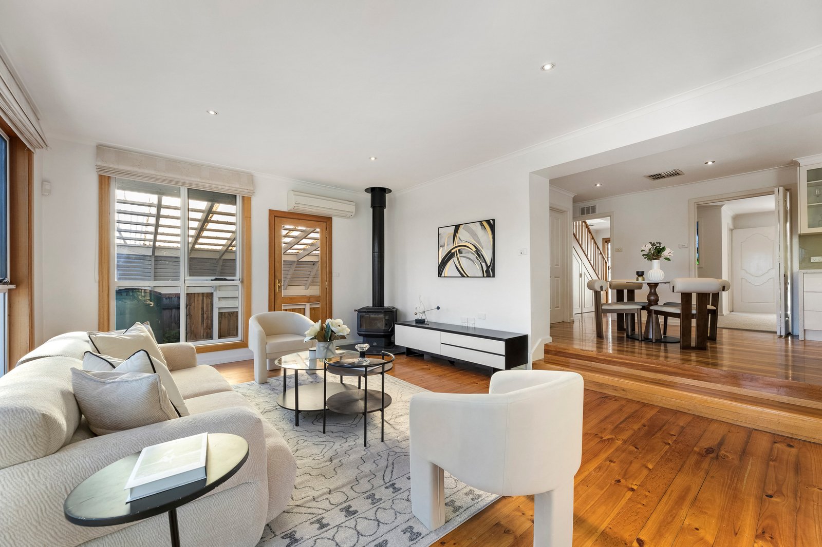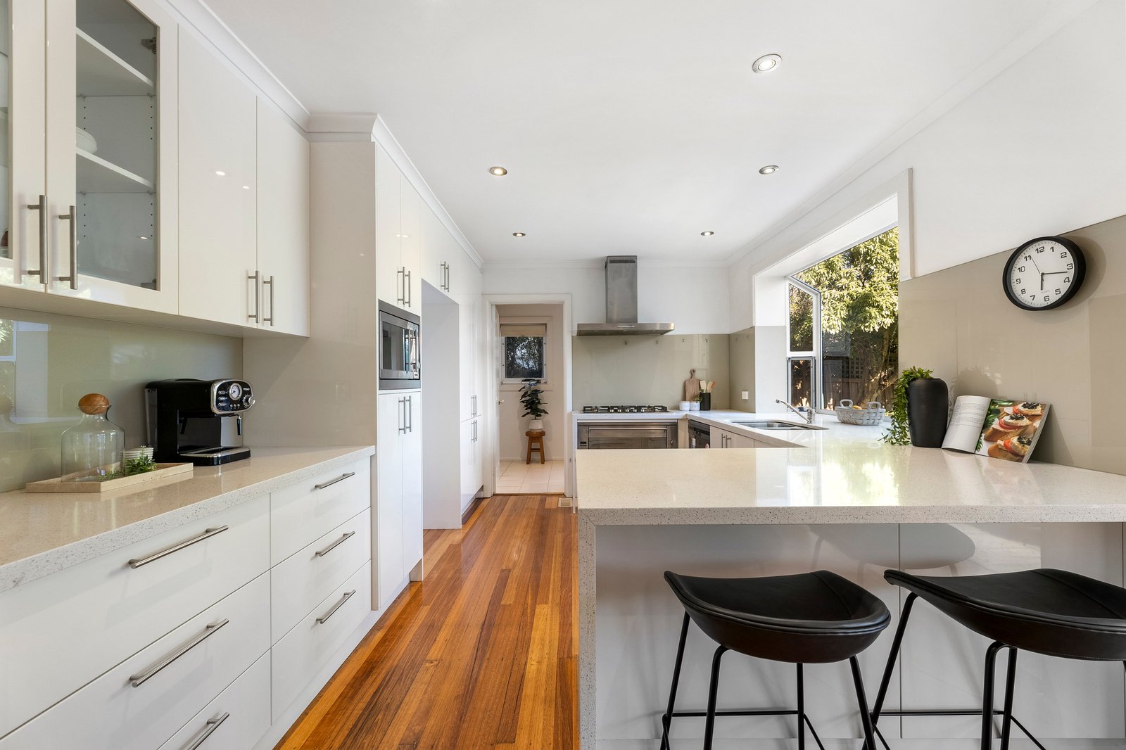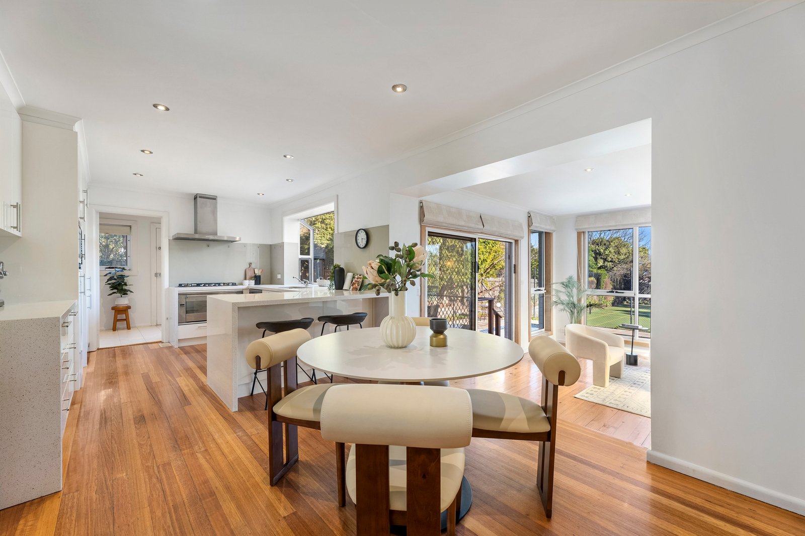 A pretty, front garden and character white façade create lovely street appeal. On the inside, the home’s floor plan spans two light-filled levels, with plenty of living space for the family to enjoy across a graceful lounge with a marble fireplace, a raised dining room, and a connected family room and rumpus.