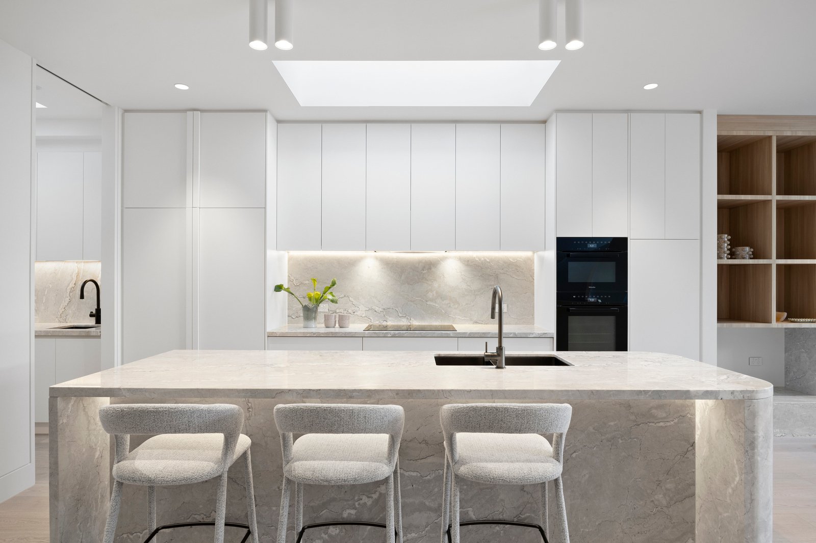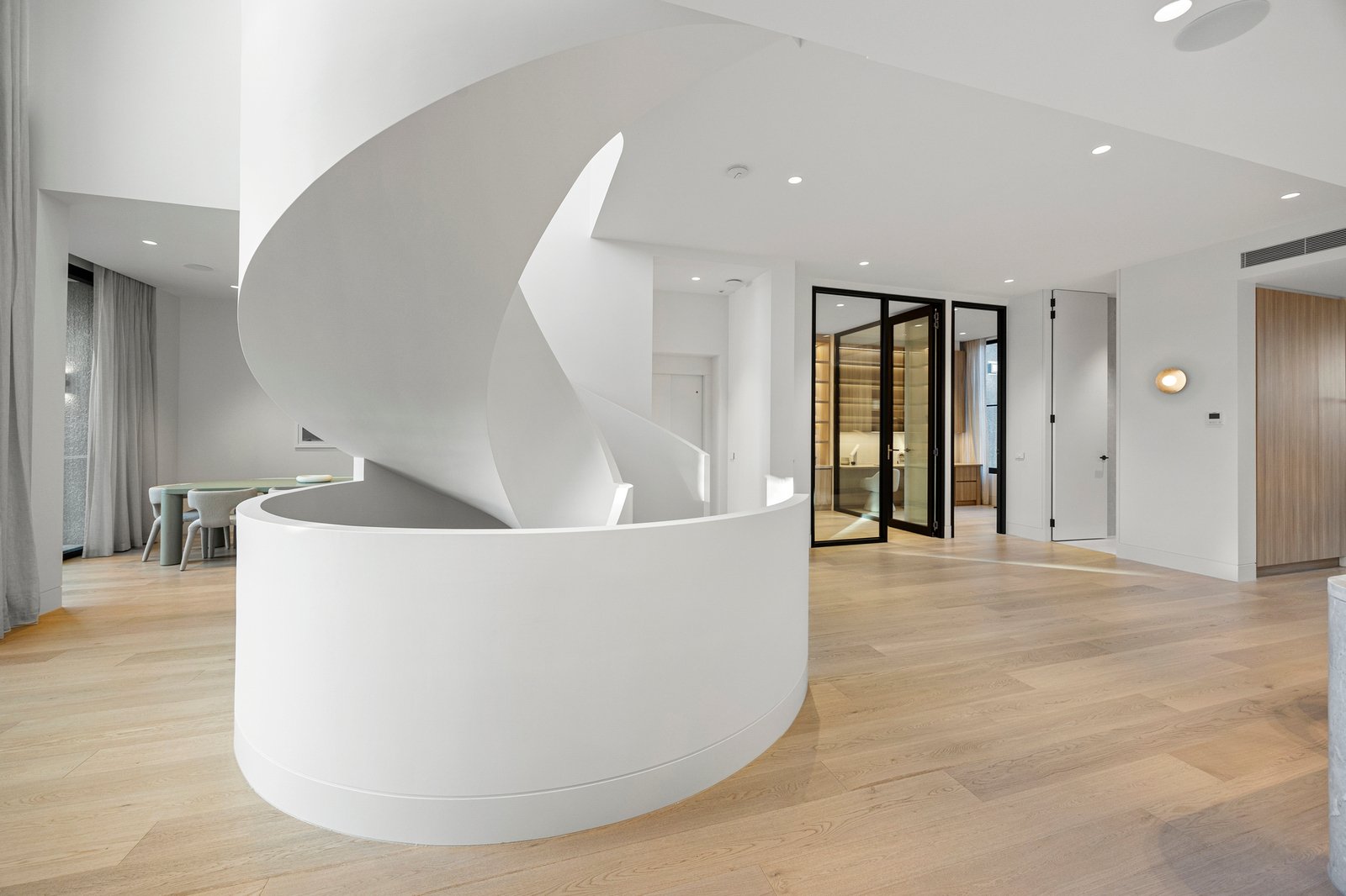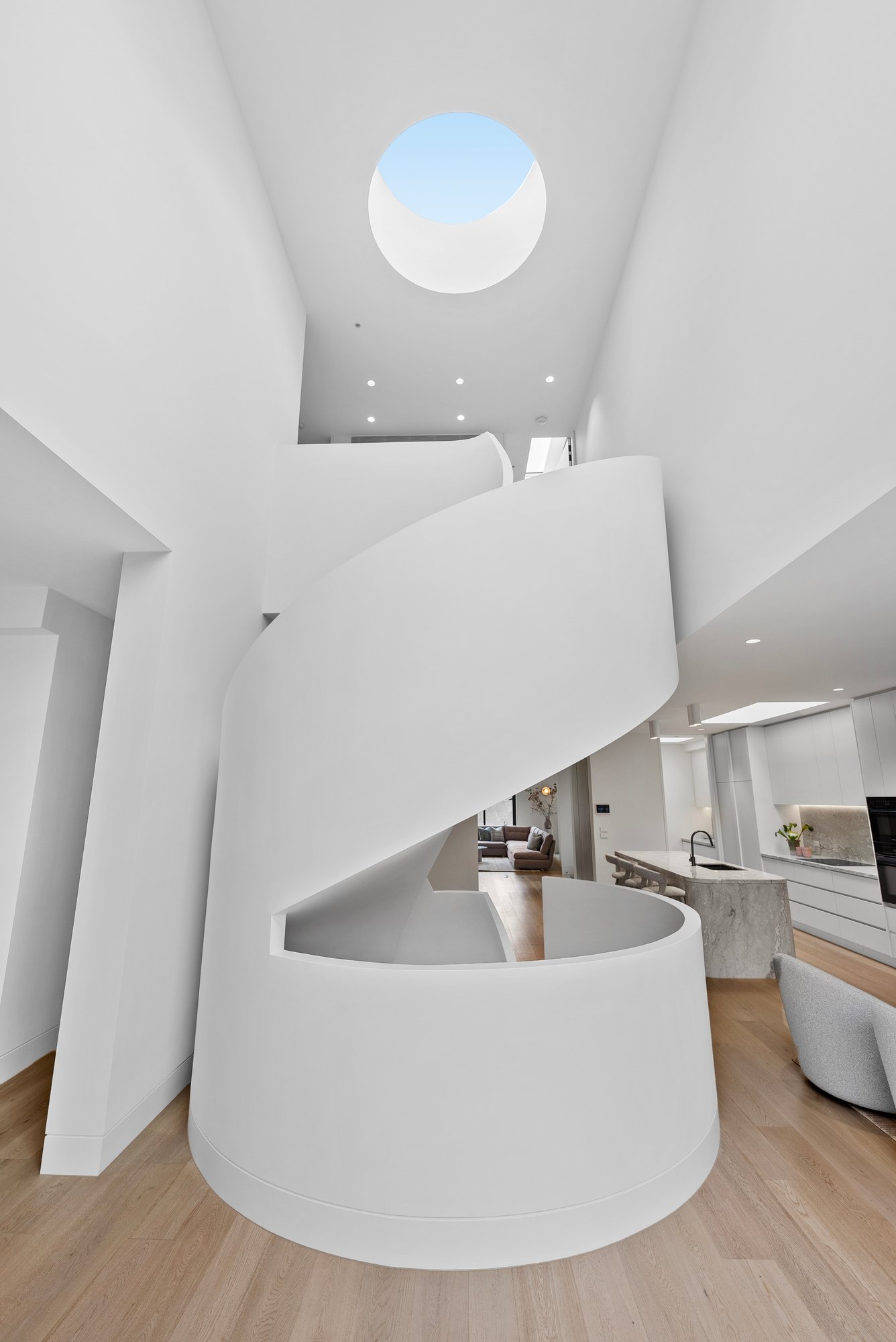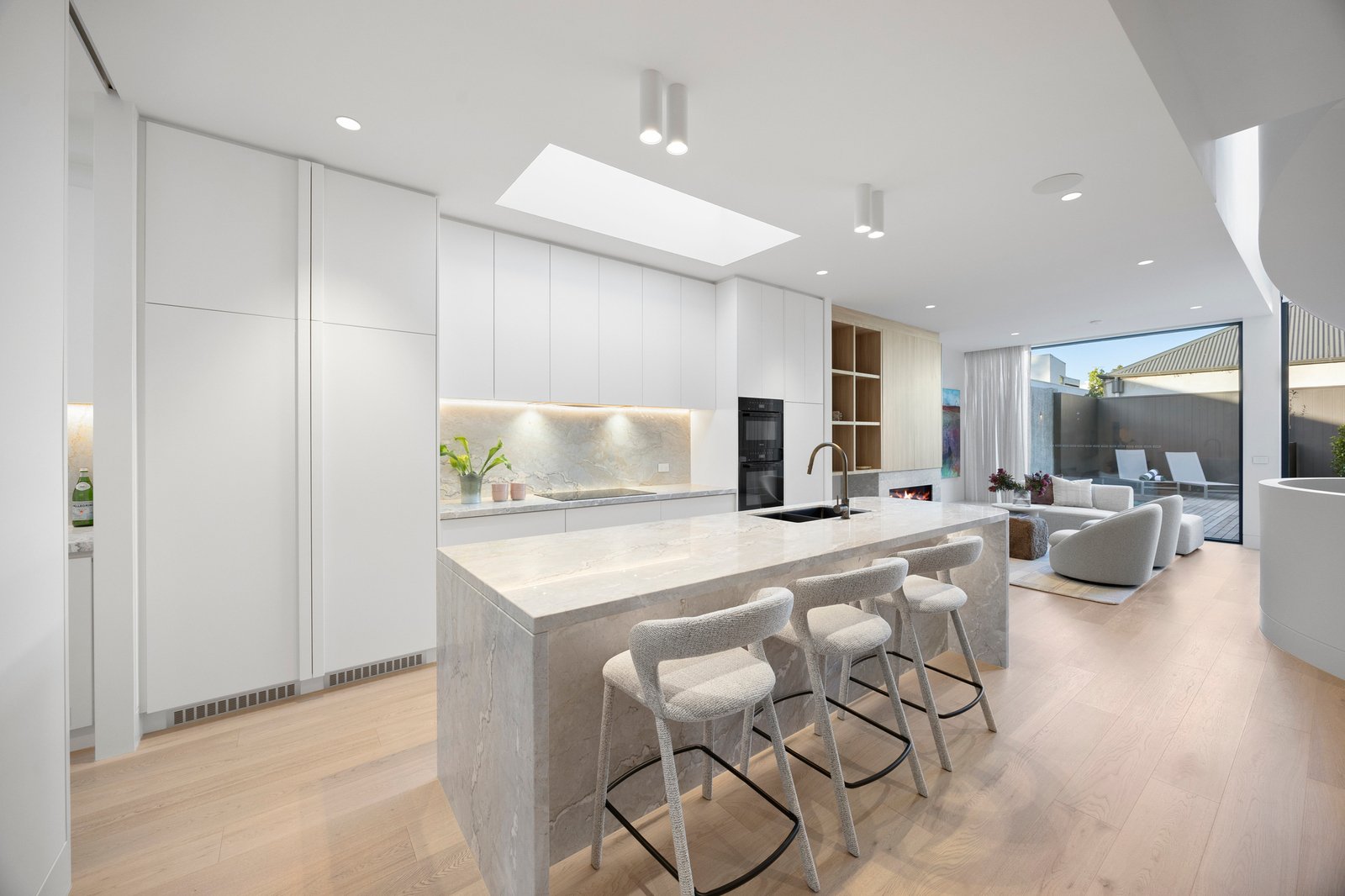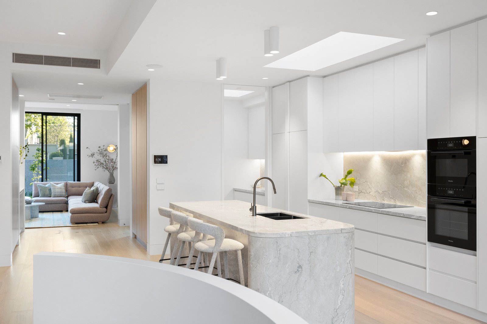 Soaring 3.2m to 7.4m ceilings, American oak flooring, and expansive skylights bathe the interiors in light, defining grand proportions where every element is perfectly resolved. At the heart of the home, a sculptural 3 level circular staircase anchors an impressive open-plan domain — dividing the refined lounge from the ambience-rich dining area — both framed by the exceptional culinary kitchen. Appointed with Miele appliances including induction cooktop, microwave/combi oven, integrated dishwasher and Liebherr fridge freezer, and a butler’s pantry with Zip Tap, this space elevates everyday living to an art form.