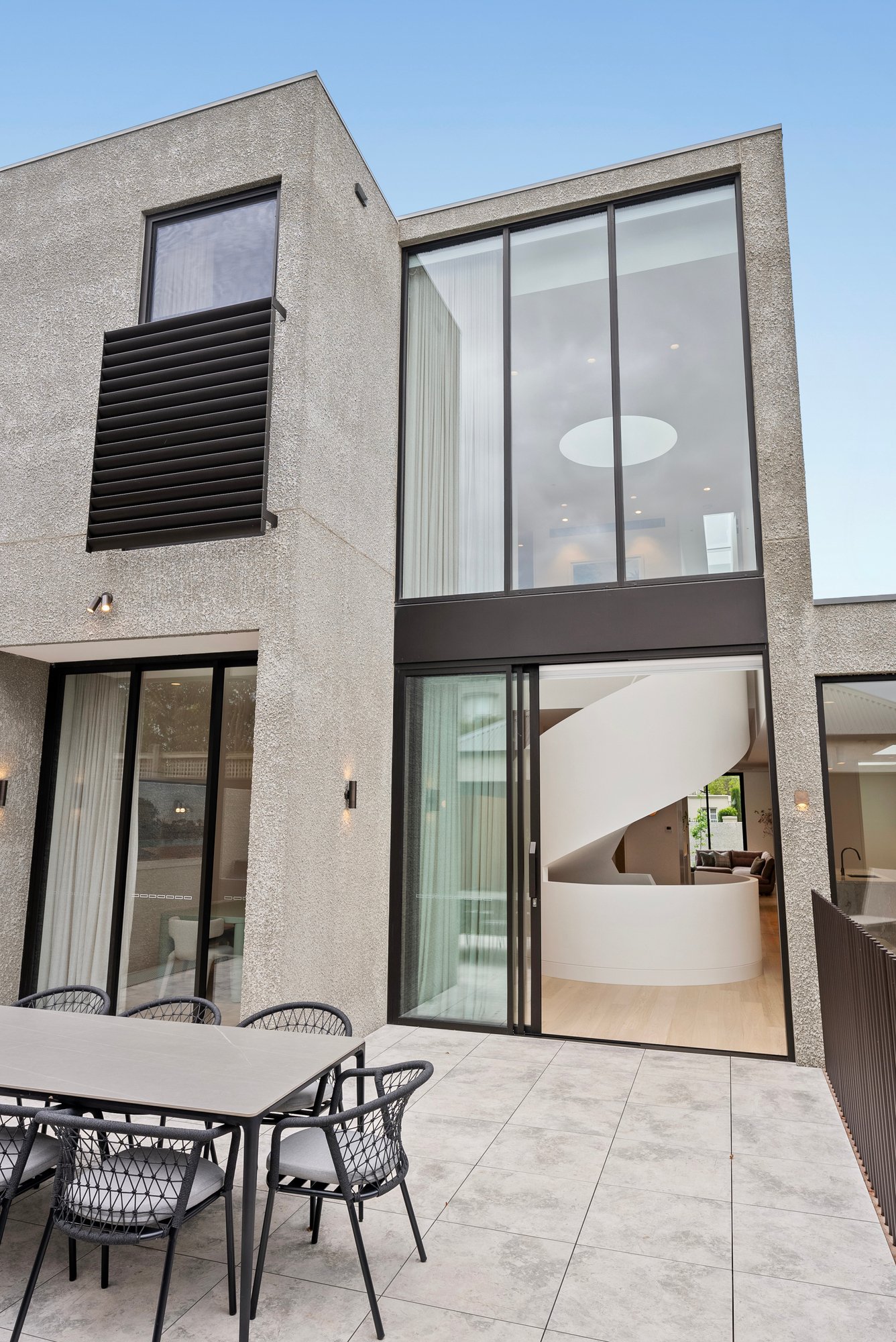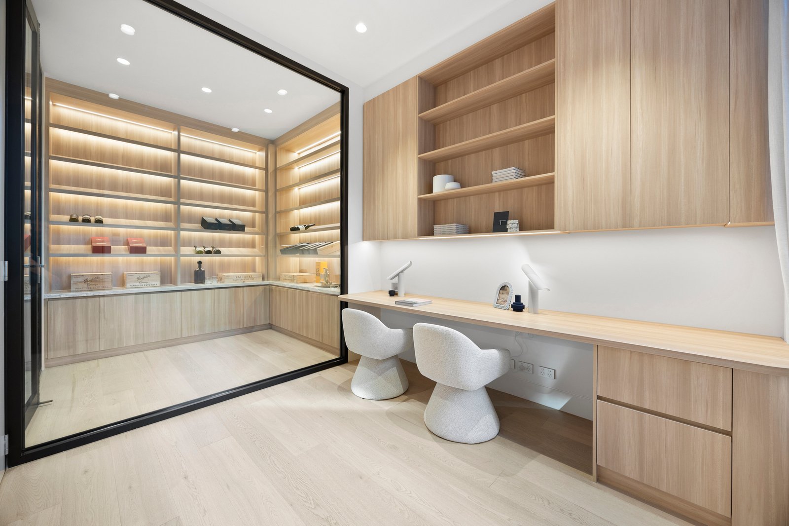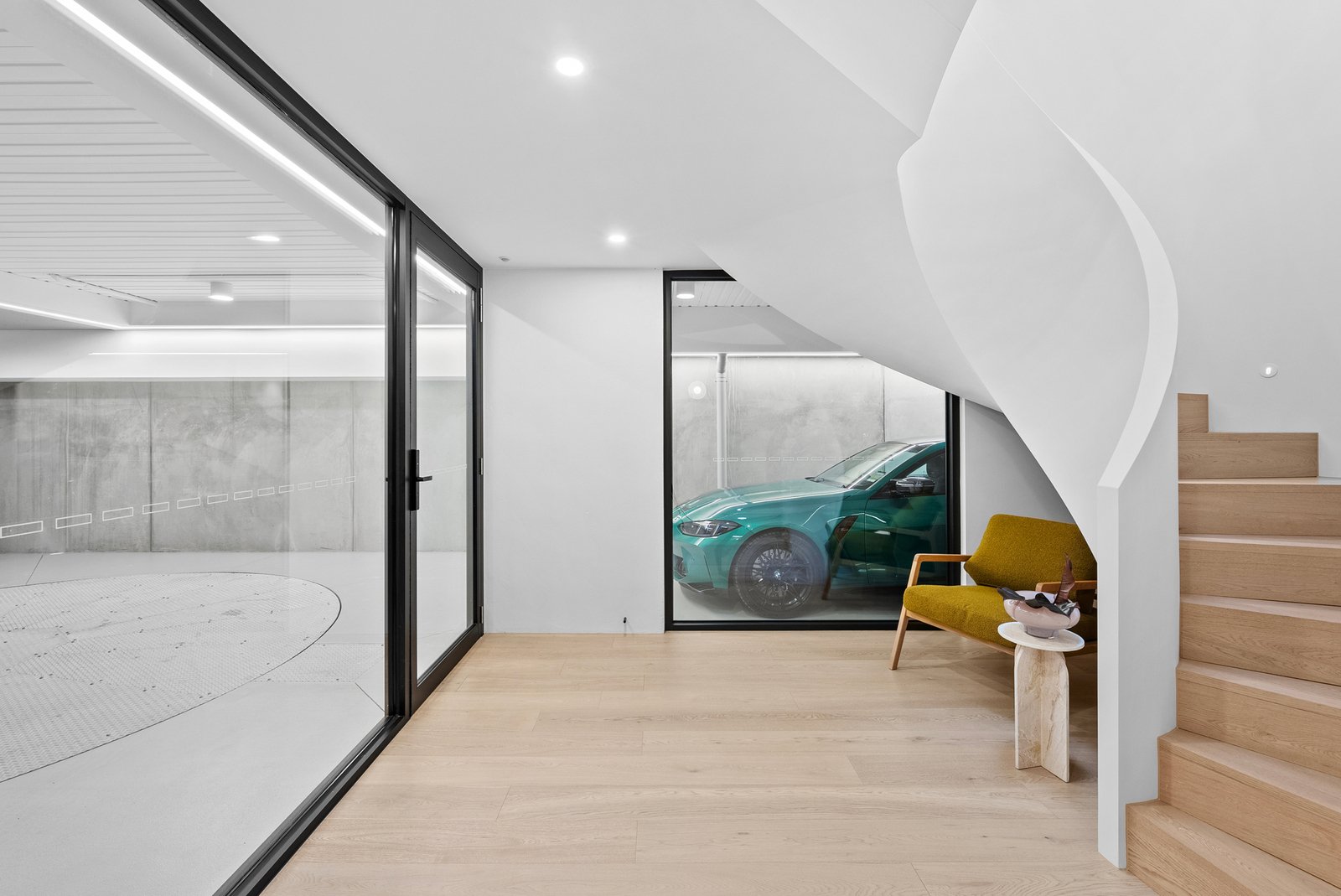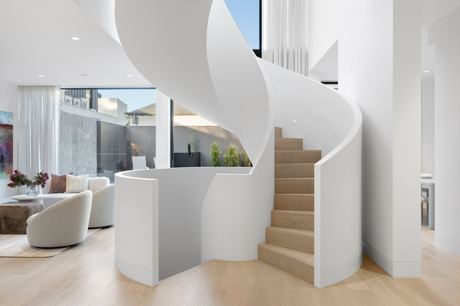 Soaring 3.2m to 7.4m ceilings, American oak flooring, and expansive skylights bathe the interiors in light, defining grand proportions where every element is perfectly resolved. At the heart of the home, a sculptural 3 level circular staircase anchors an impressive open-plan domain — dividing the refined lounge from the ambience-rich dining area — both framed by the exceptional culinary kitchen. Appointed with Miele appliances including induction cooktop, microwave/combi oven, integrated dishwasher and Liebherr fridge freezer, and a butler’s pantry with Zip Tap, this space elevates everyday living to an art form.