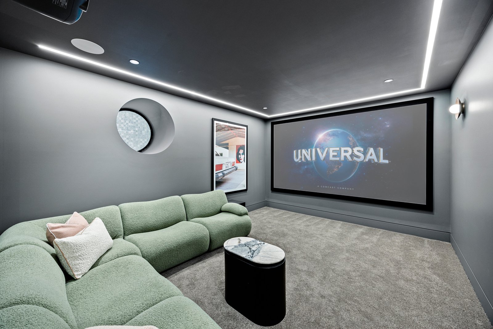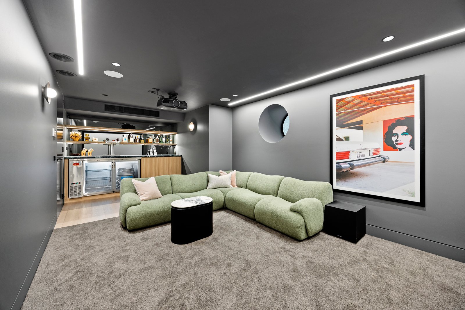 The lower level is nothing short of extraordinary — home to a 4K UHD theatre with 120” screen and nine-speaker Triad PDX system, porthole pool window, bar with commercial fridge and beer taps, and a Miele dishwasher. Completing this remarkable level is a guest suite, a five-car basement garage with 360° turntable, generous storage, and provision for EV charging, battery system and home gym.