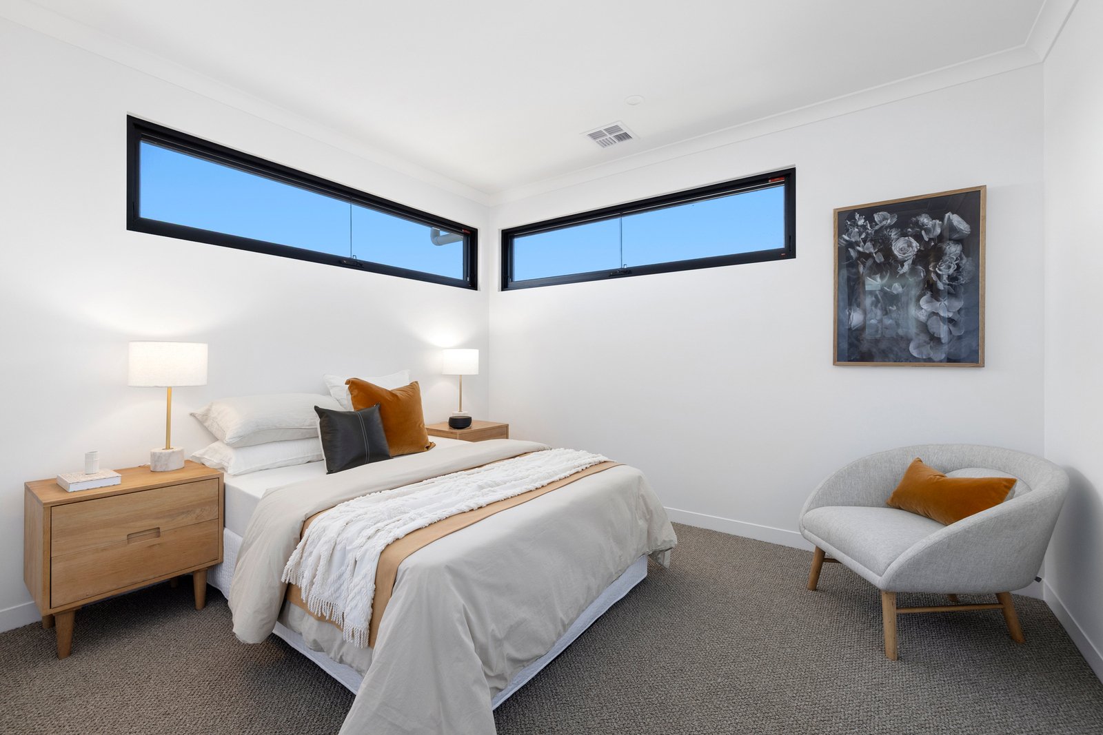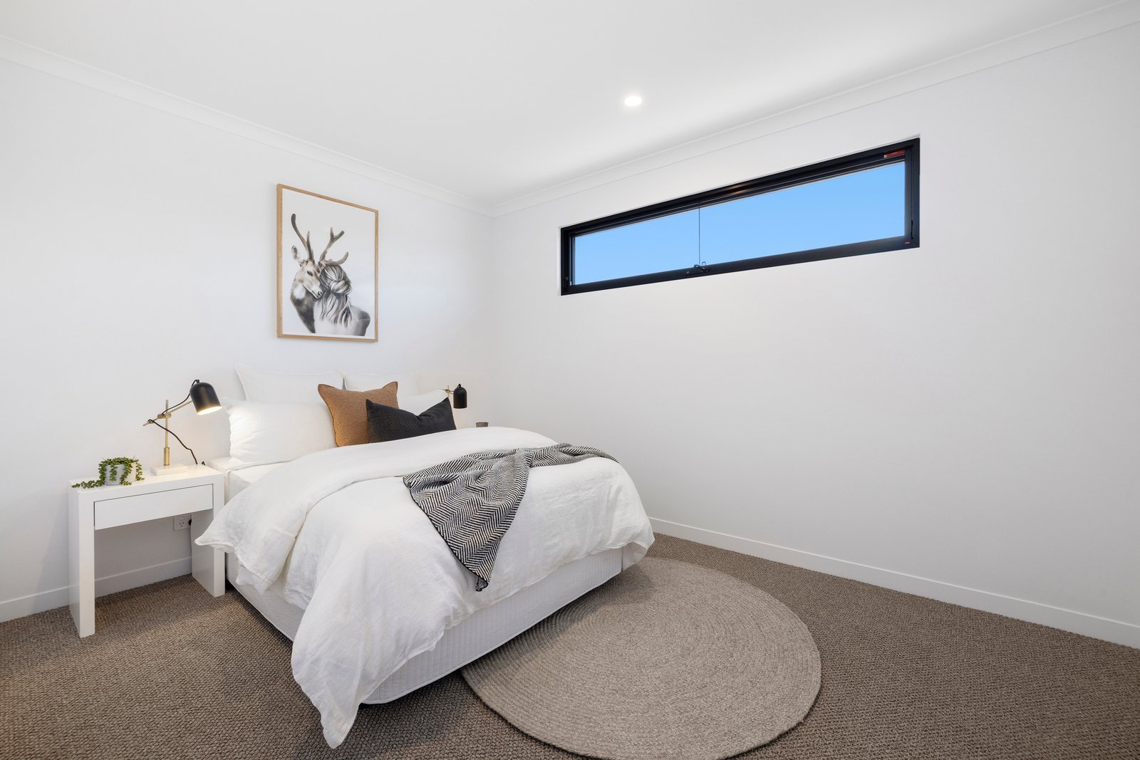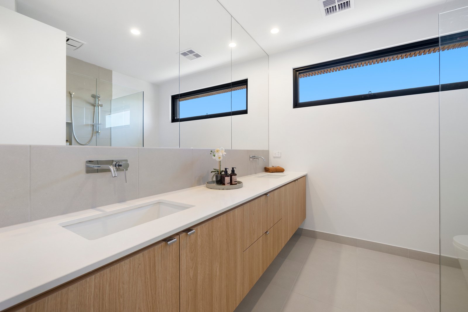 A ground floor bedroom and two-way ensuite are pleasing inclusions while three more bedrooms are tucked away upstairs. At the front is the ensuited master with walk-in robe; a central skylit lounge separates the parents’ retreat from the two remaining bedrooms and family bathroom with separate WC.