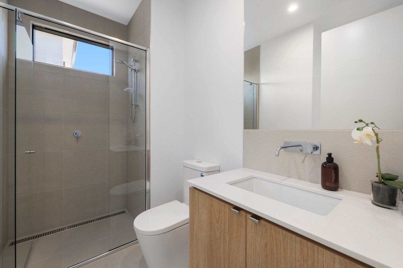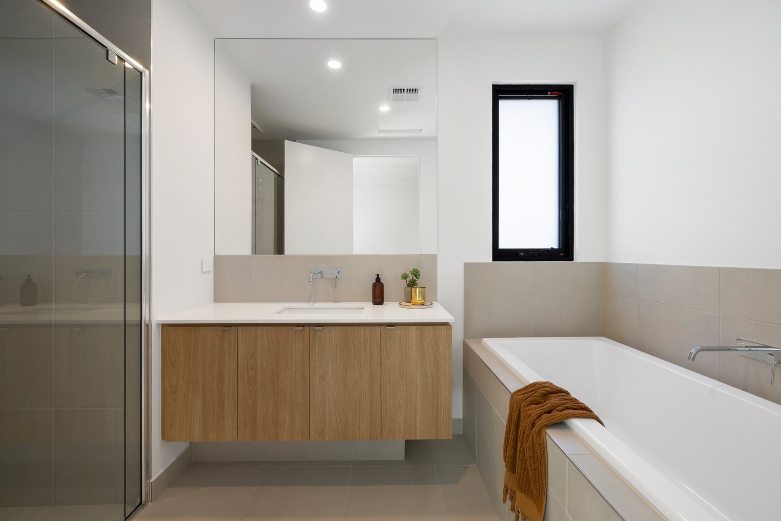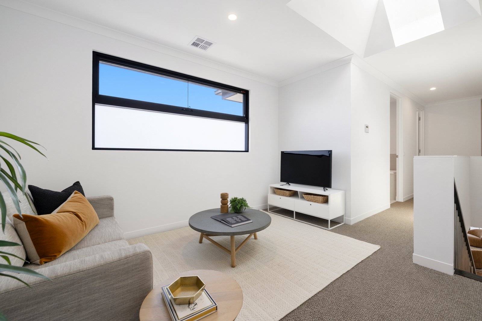 A ground floor bedroom and two-way ensuite are pleasing inclusions while three more bedrooms are tucked away upstairs. At the front is the ensuited master with walk-in robe; a central skylit lounge separates the parents’ retreat from the two remaining bedrooms and family bathroom with separate WC.