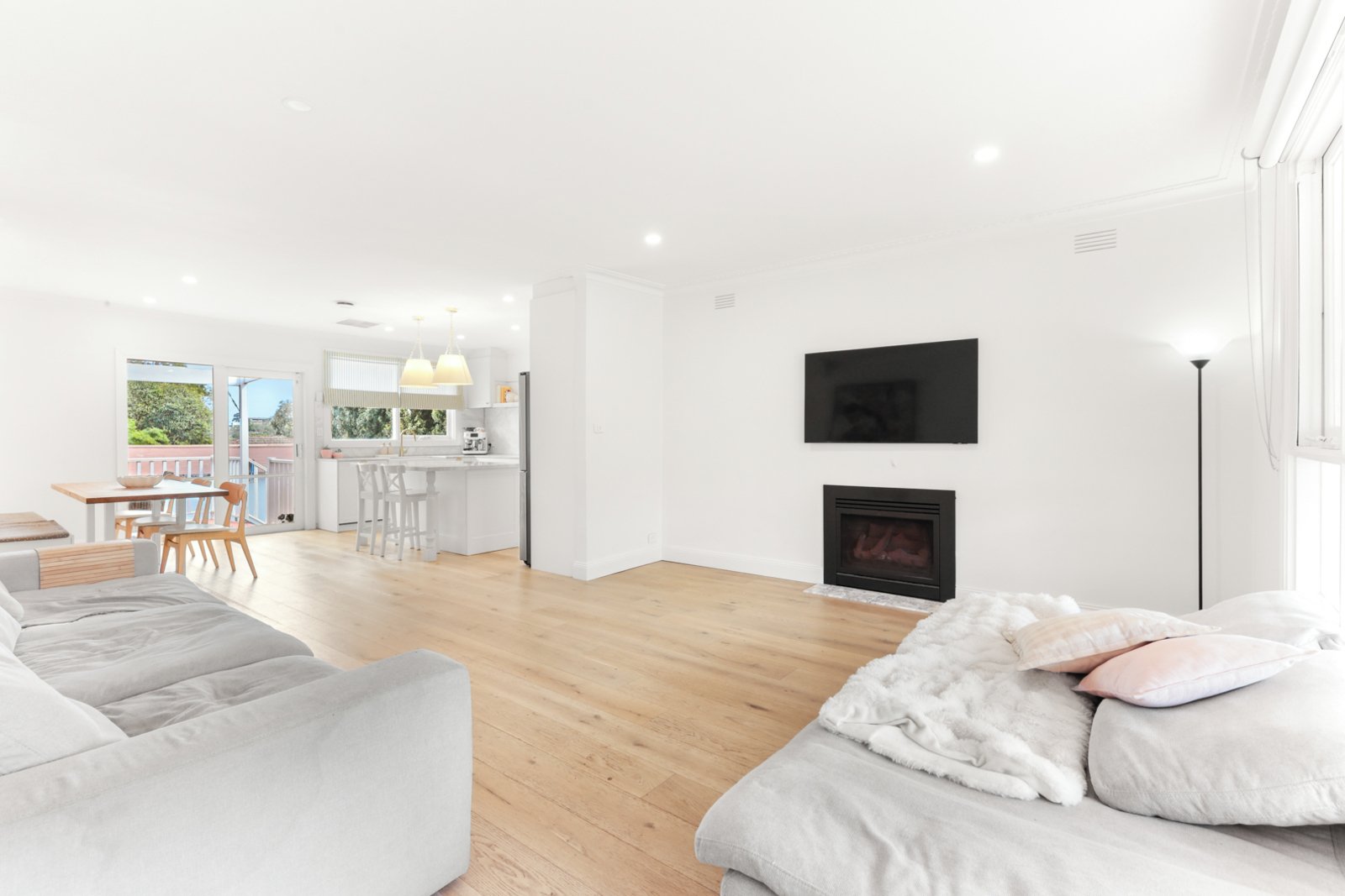 • Light-filled living room with elegant wall-mounted fireplace