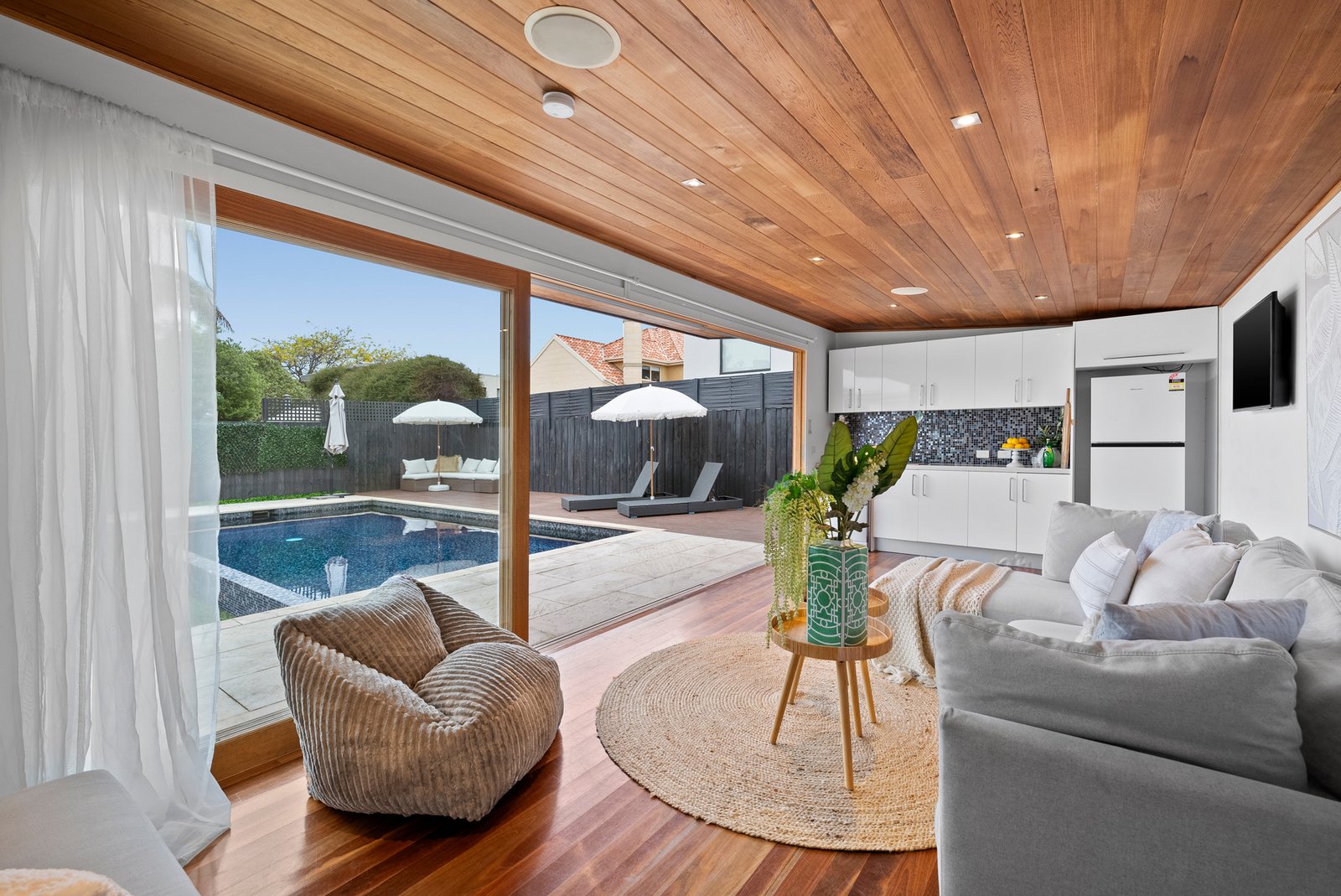 The pool house commands attention with bold yet inviting design – an alluring space complete with kitchenette, split-system comfort and integrated speakers, providing the perfect setting for summer gatherings, poolside parties, long lunches and evenings by the water.