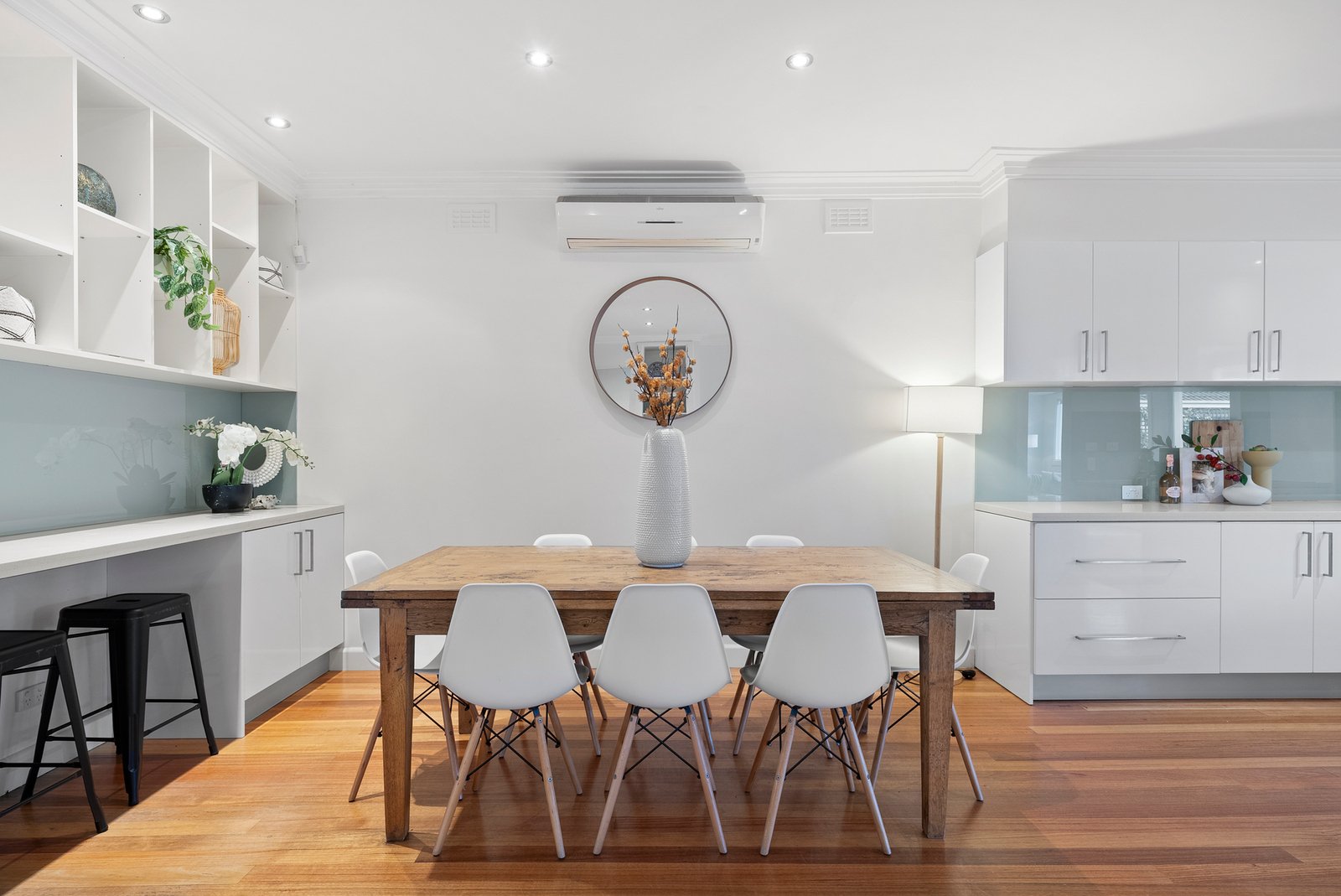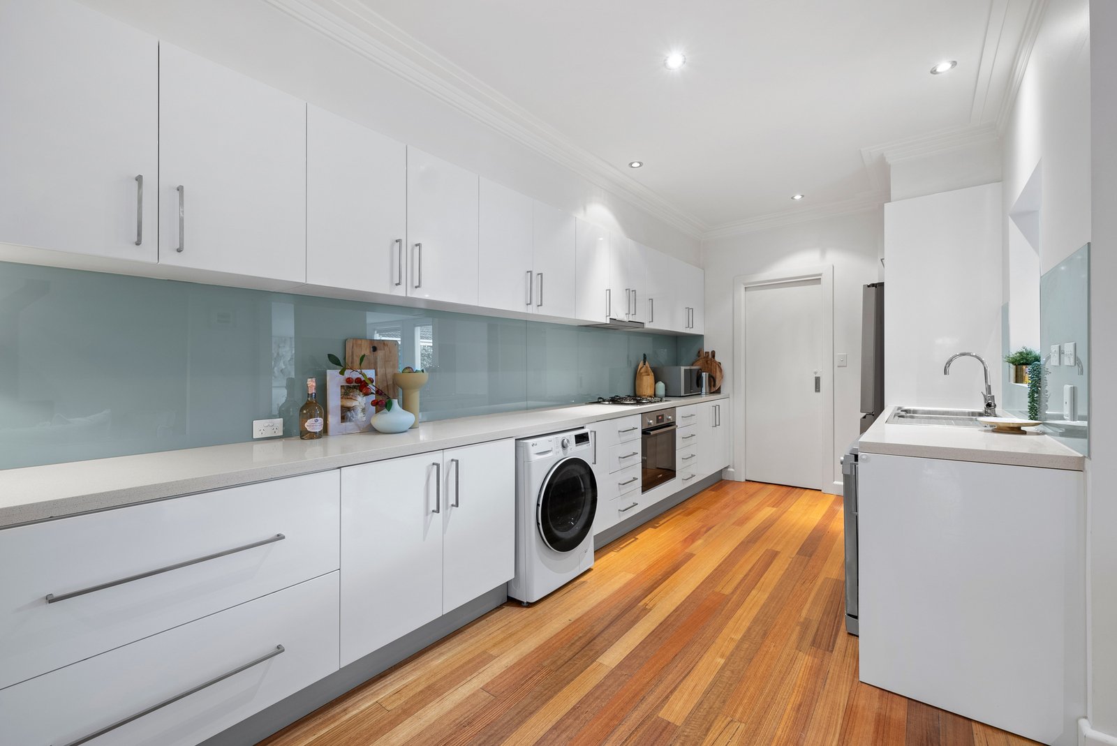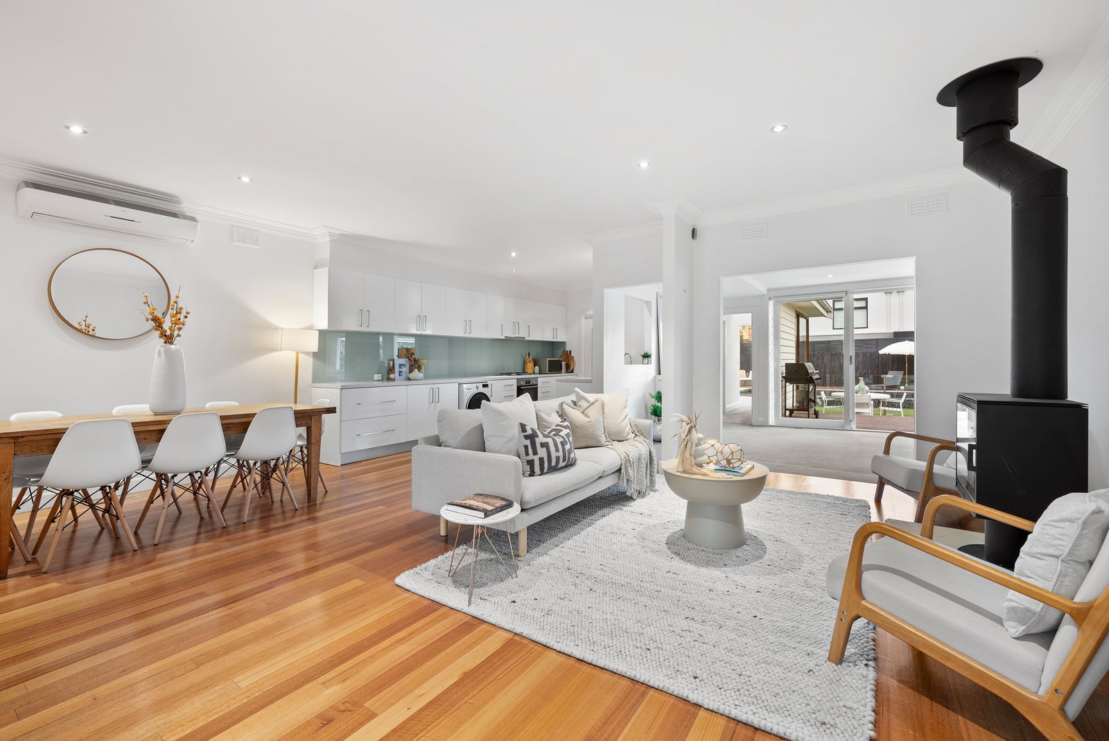 Inside, timber floors extend through the hallway to a free-flowing dining and kitchen zone, where stone surfaces, Bosch appliances and refined detailing create an atmosphere of everyday elegance. At one end lies a relaxed breakfast bar, at the other a walk-in pantry - each element balancing beauty and practicality, while a sitting area anchored by a wood fire enriches the sense of warmth and connection.