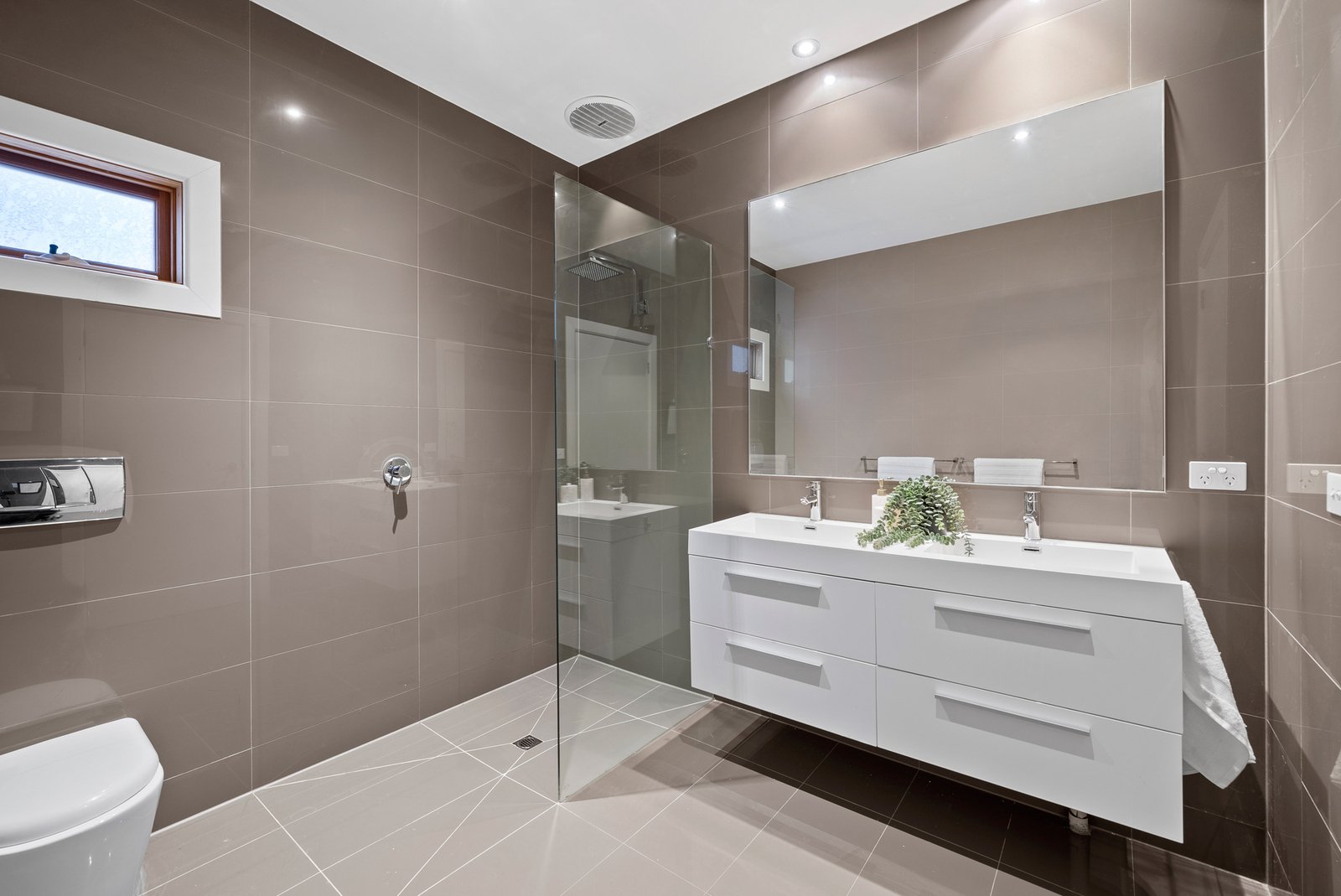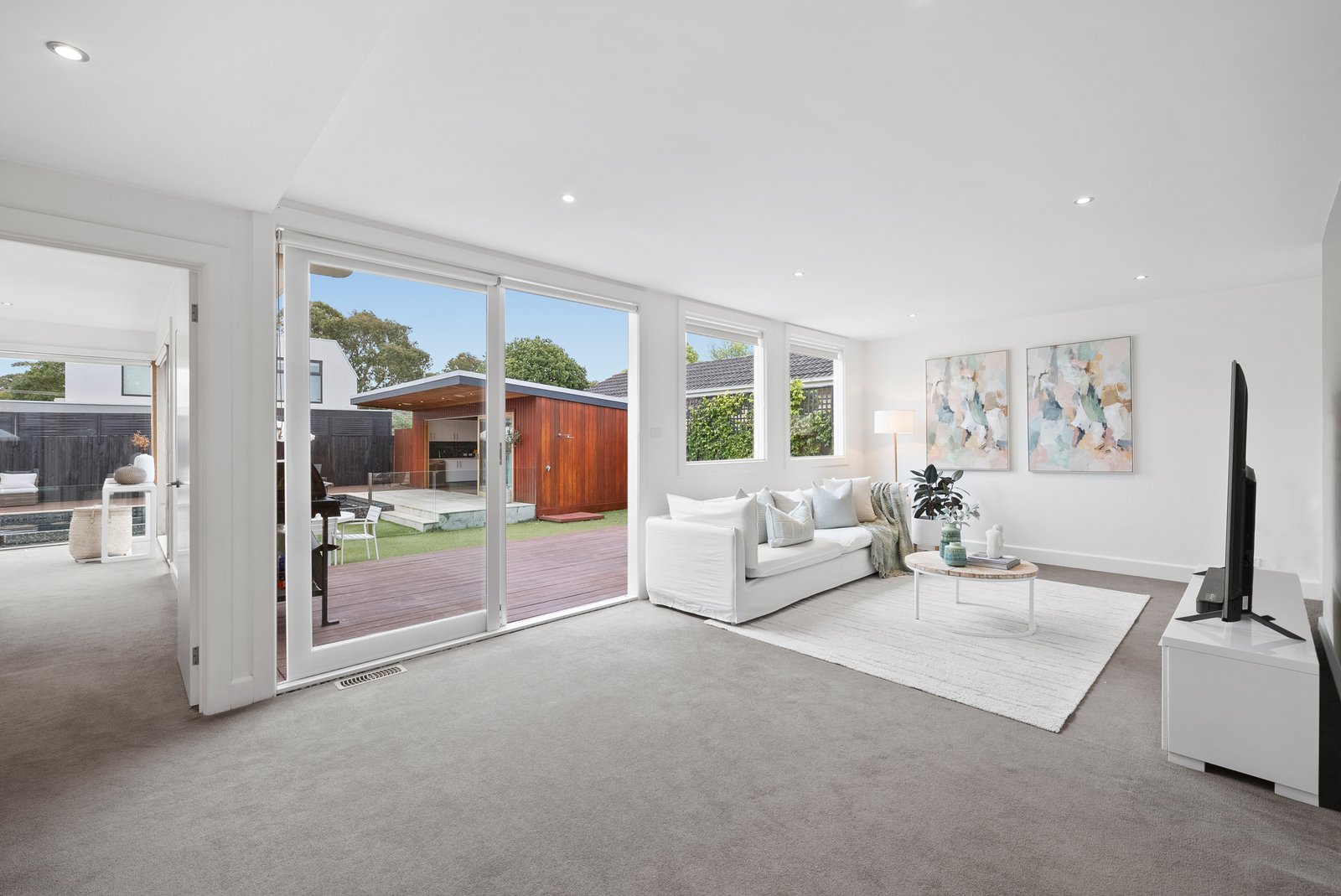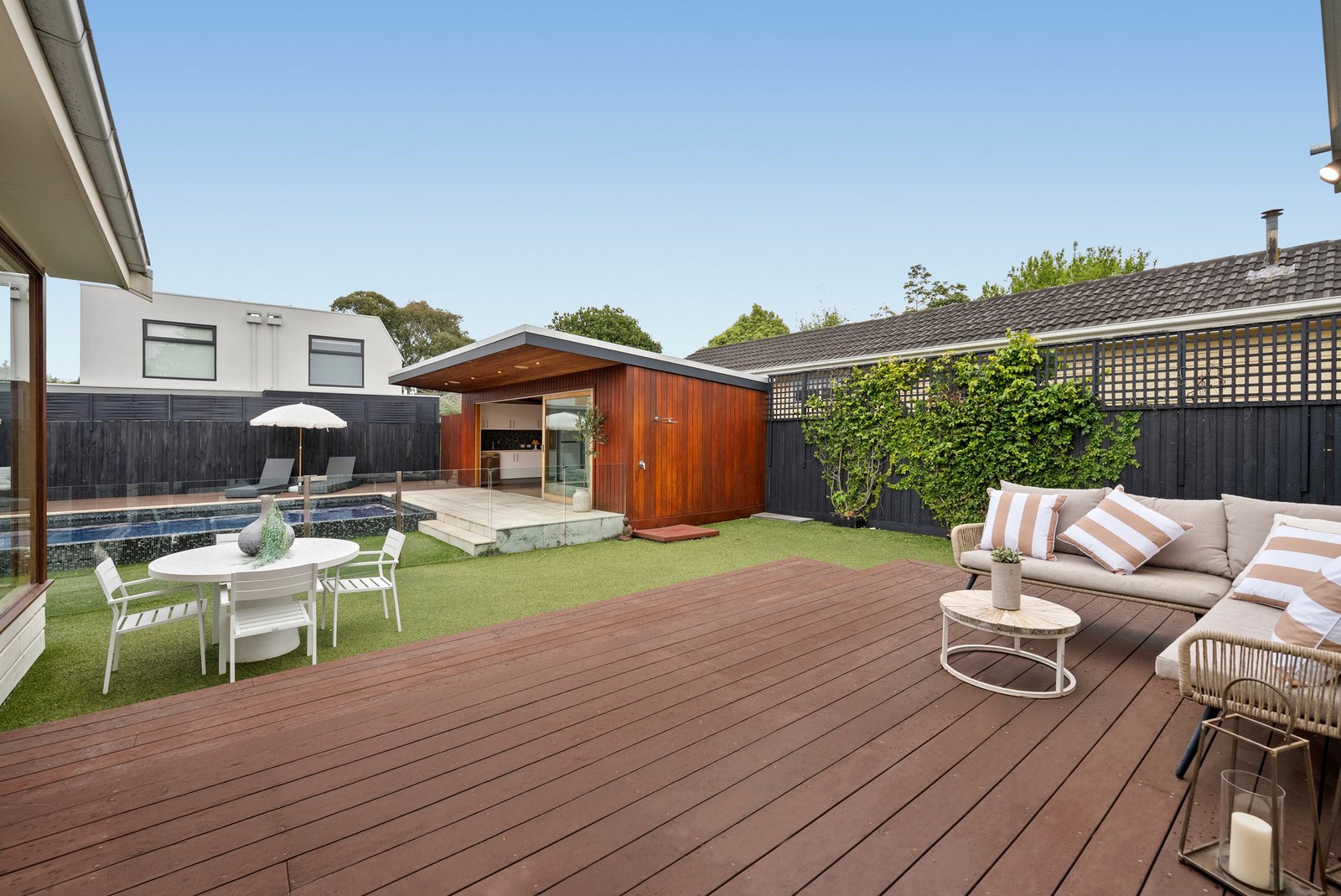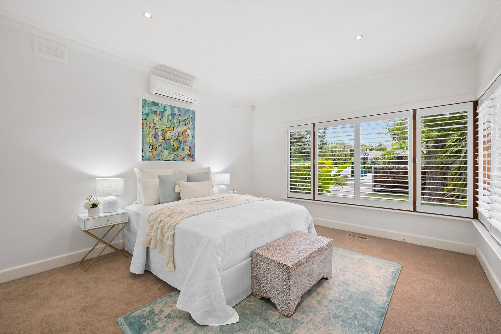 The privately zoned master suite captures northern and western light through a corner picture window framing outlooks across the pool and garden. A twin-vanity ensuite enhances its sense of indulgence, while three additional bedrooms - each with mirrored robes and plantation shutters - share a sleek family bathroom with bath and separate shower.